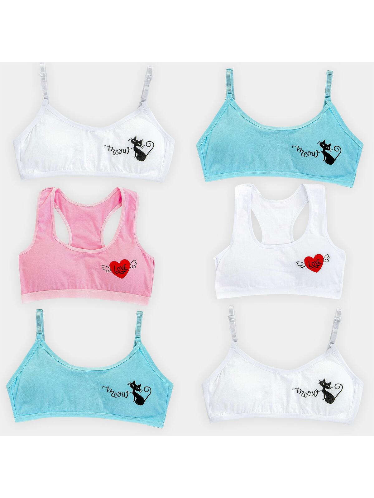 W zestawie znajdziesz aż 6 sztuk biustonoszy – gładkich, zapinanych na haftki, oraz sportowych topów z uroczymi nadrukami! Dzięki temu, każda nastolatka z pewnością znajdzie coś dla siebie, a codzienny ubiór stanie się jeszcze bardziej radosny i kolorowy! 🌼