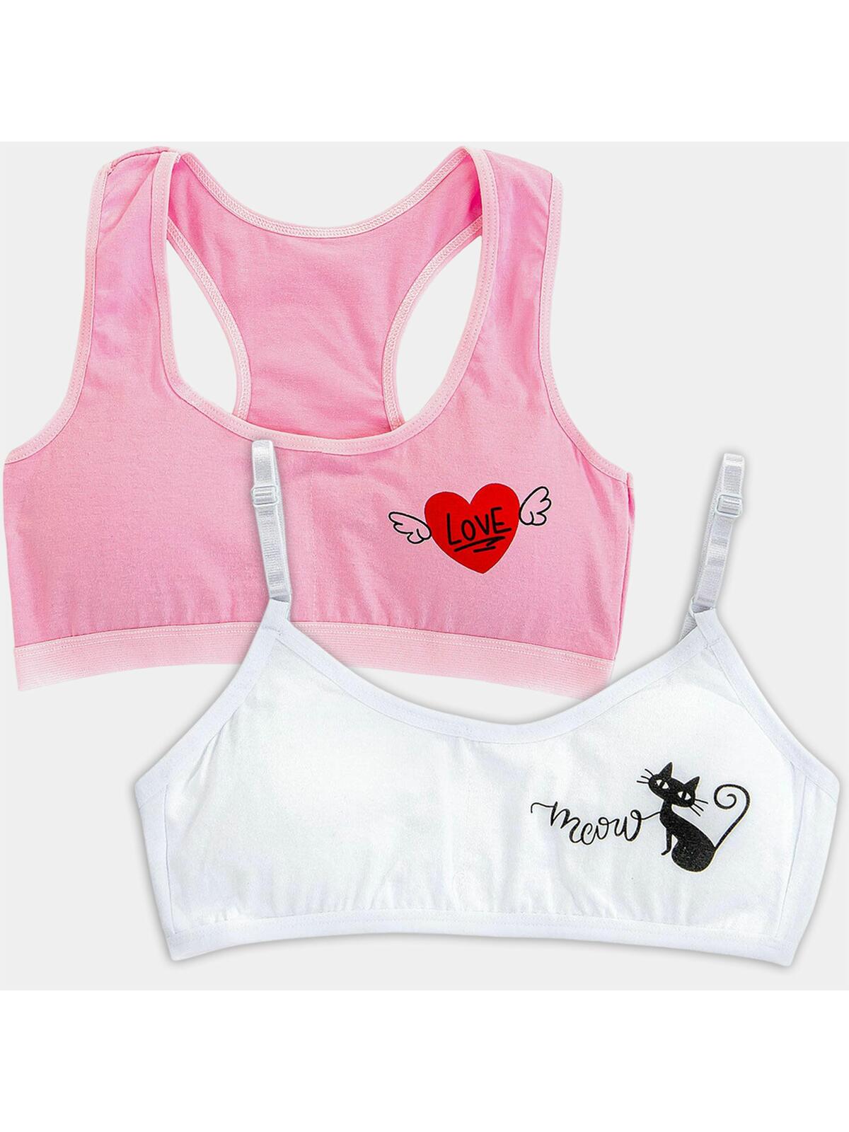 Te urocze biustonosze będą idealnym wyborem zarówno pod codzienne stylizacje, jak i sportowe outfity. Świetnie sprawdzą się w szkole, podczas aktywności fizycznej czy w domowym zaciszu. Model w białym kolorze z regulowanymi ramiączkami i zapięciem na haftki oraz różowy, wkładany przez głowę, z uroczym nadrukiem, z pewnością zachwycą każdą nastolatkę! 🐱