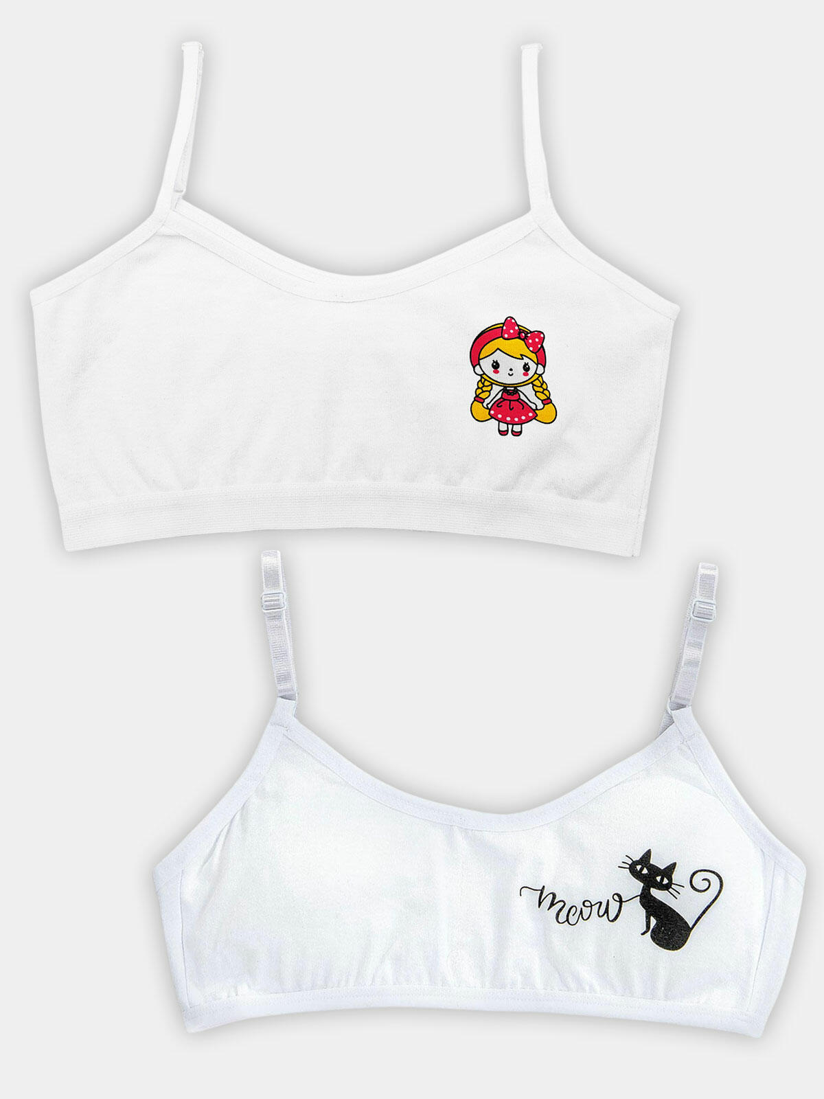 Te urocze biustonosze będą idealnym wyborem zarówno pod codzienne stylizacje, jak i sportowe outfity. Świetnie sprawdzą się w szkole, podczas aktywności fizycznej czy w domowym zaciszu. Model z kotem🐱 posiada miękkie wkładki, regulowane ramiączka i zapięcie na haftki, zaś model z nadrukiem laleczki jest wkładany przez głowę i również posiada regulowane ramiączka.