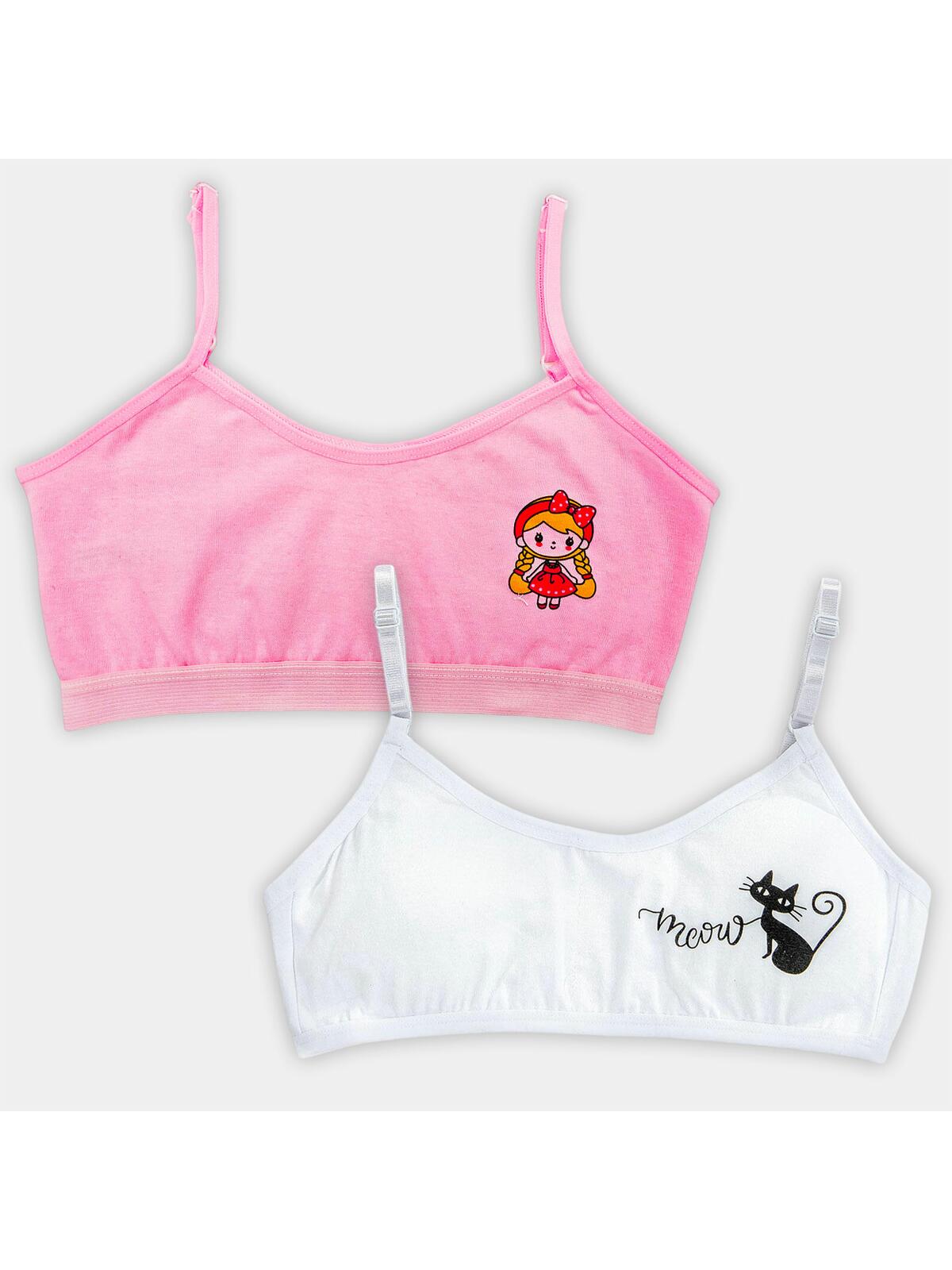 Ten 2-pak to połączenie funkcjonalności i uroku! Biały top z kotkiem 🐱 posiada miękkie wkładki, regulowane ramiączka i zapięcie na haftki, a różowy z laleczką 🎀 to lekka, wkładana przez głowę wersja bez wkładek. Oba sprawdzą się zarówno na co dzień, jak i podczas aktywności.