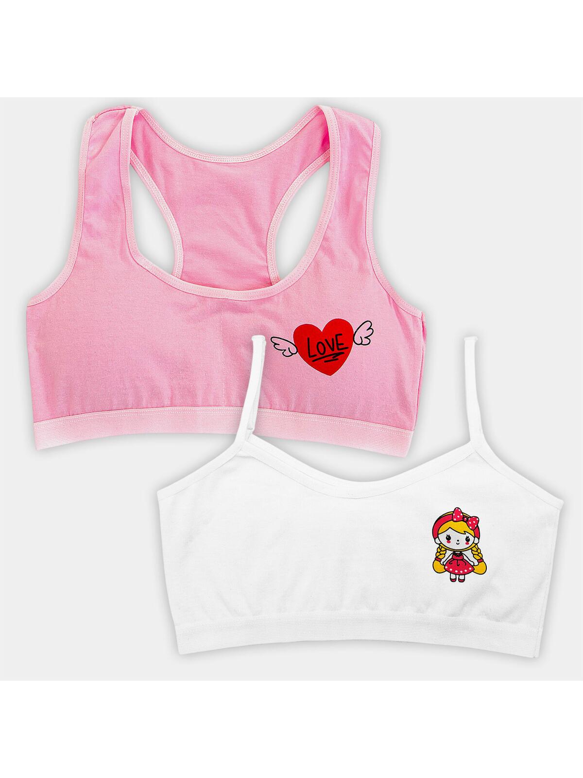 Te urocze biustonosze będą idealnym wyborem zarówno pod codzienne stylizacje, jak i sportowe outfity. Świetnie sprawdzą się w szkole, podczas aktywności fizycznej czy w domowym zaciszu. Model różowy posiada miękkie wkładki, szerokie ramiączka i nadruk serca, zaś model biały z nadrukiem laleczki, wkładany przez głowę, posiada wąskie regulowane ramiączka, ale nie posiada wkładek.