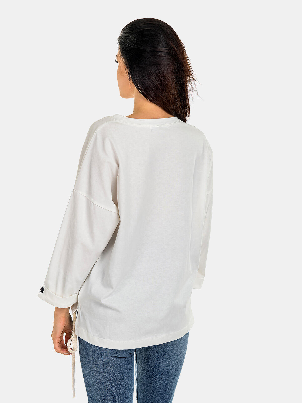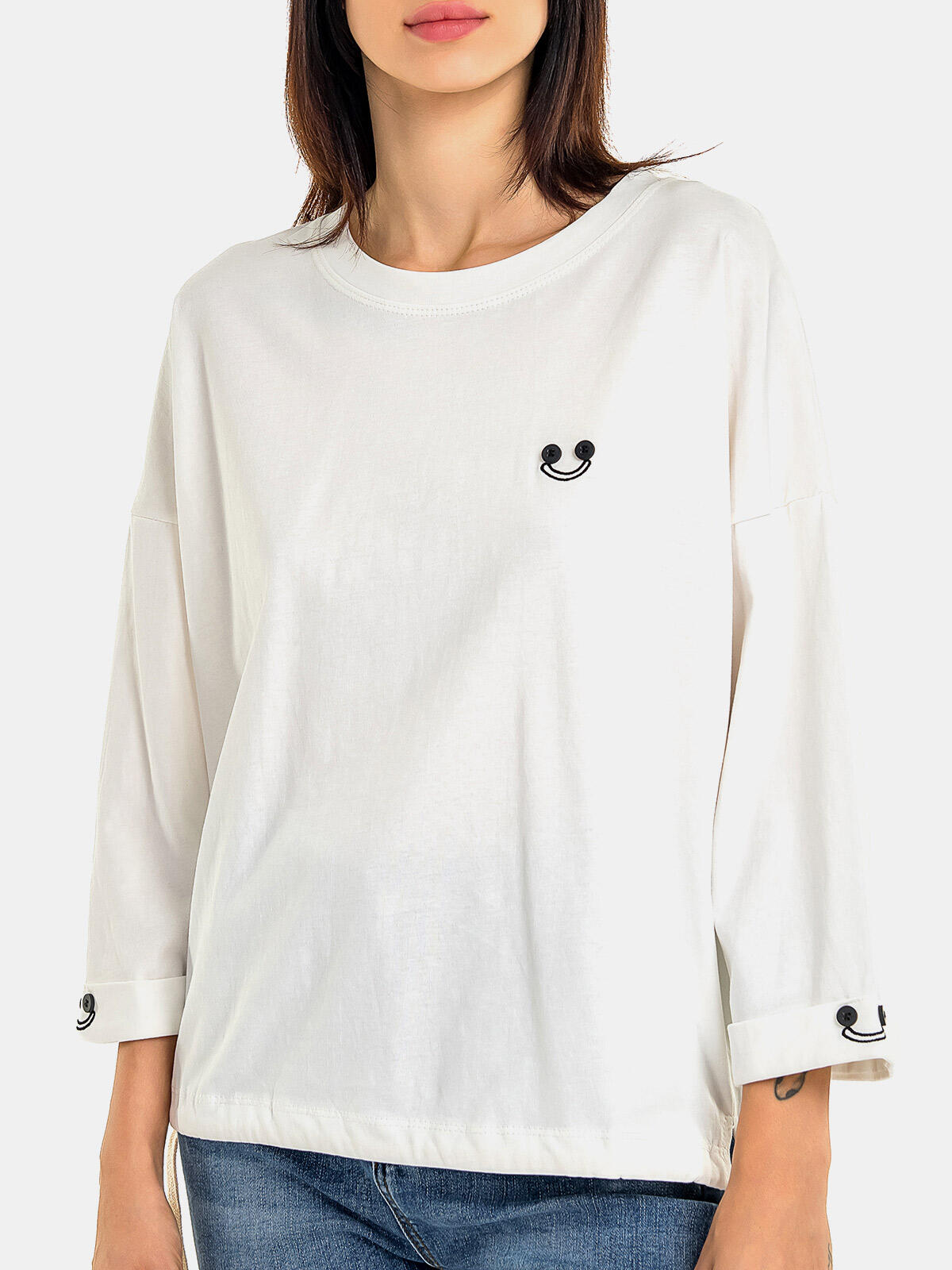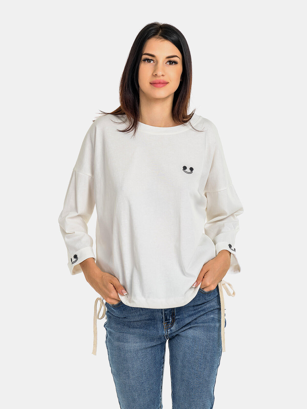 - Rękawy: Długie, lekko obniżone rękawy zakończone mankietami z delikatnym nadrukiem. Na rękawach widnieje subtelny uśmiech, który dodaje bluzce charakteru i uroku. 😊