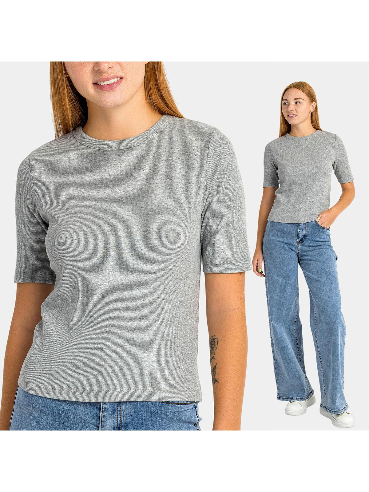 Nasza damska bluzka z prążkowanej bawełny to idealne połączenie komfortu i stylu! Miękki i przyjemny dla skóry materiał sprawia, że poczujesz się w niej wyjątkowo każdego dnia. 🌈 Klasyczny szary kolor to ponadczasowy wybór, który doskonale komponuje się z innymi elementami garderoby. Okrągły dekolt oraz krótki rękaw dodają świeżości, a elastyczne włókna skutecznie dopasowują się do sylwetki, zapewniając swobodę ruchów. ✨