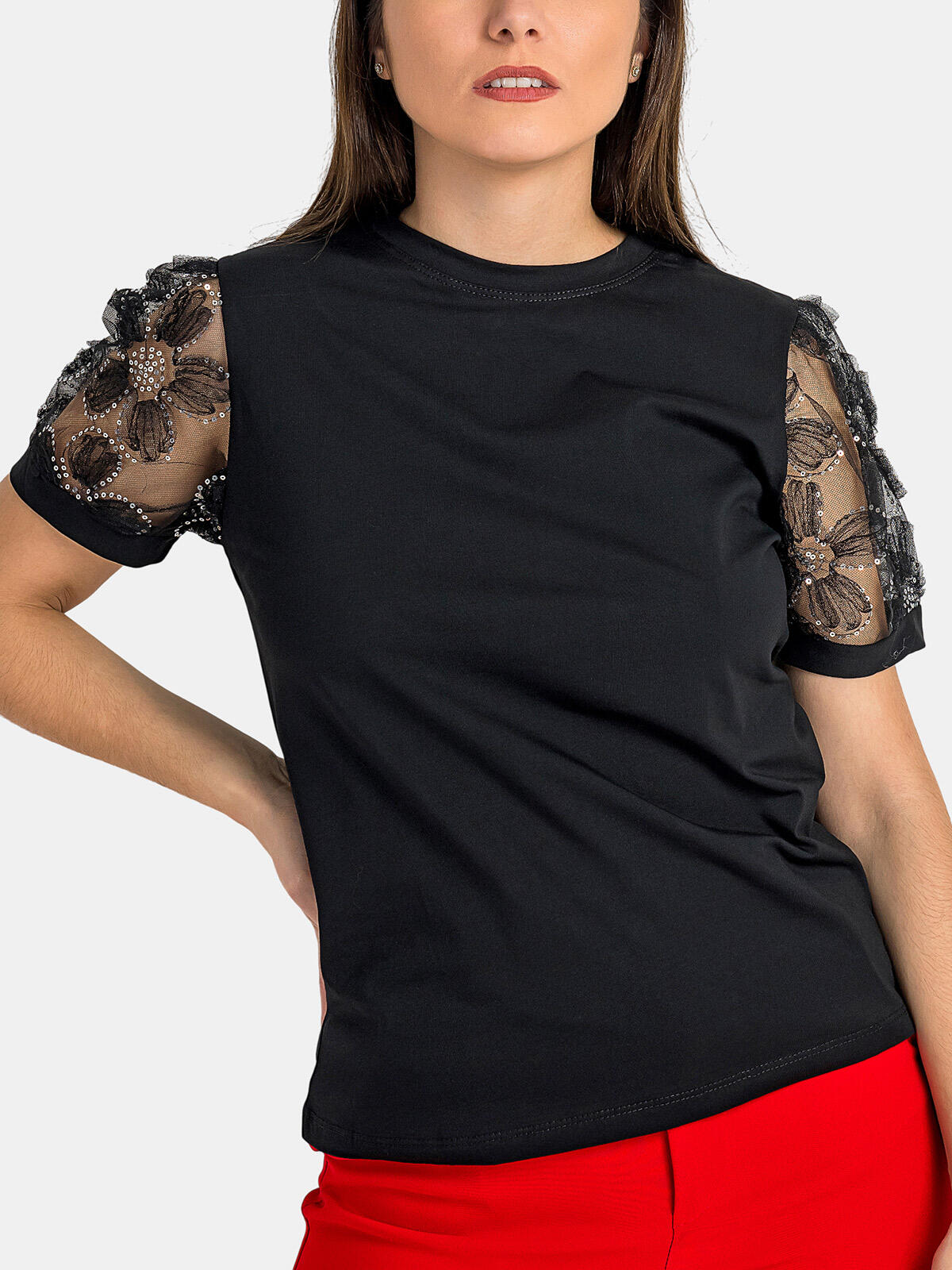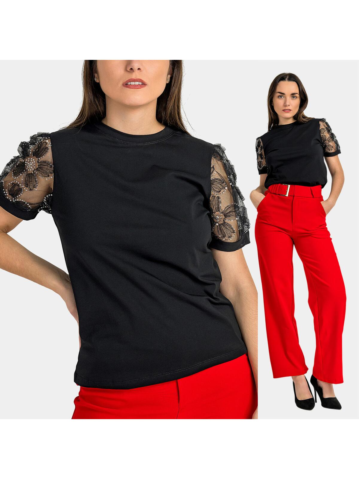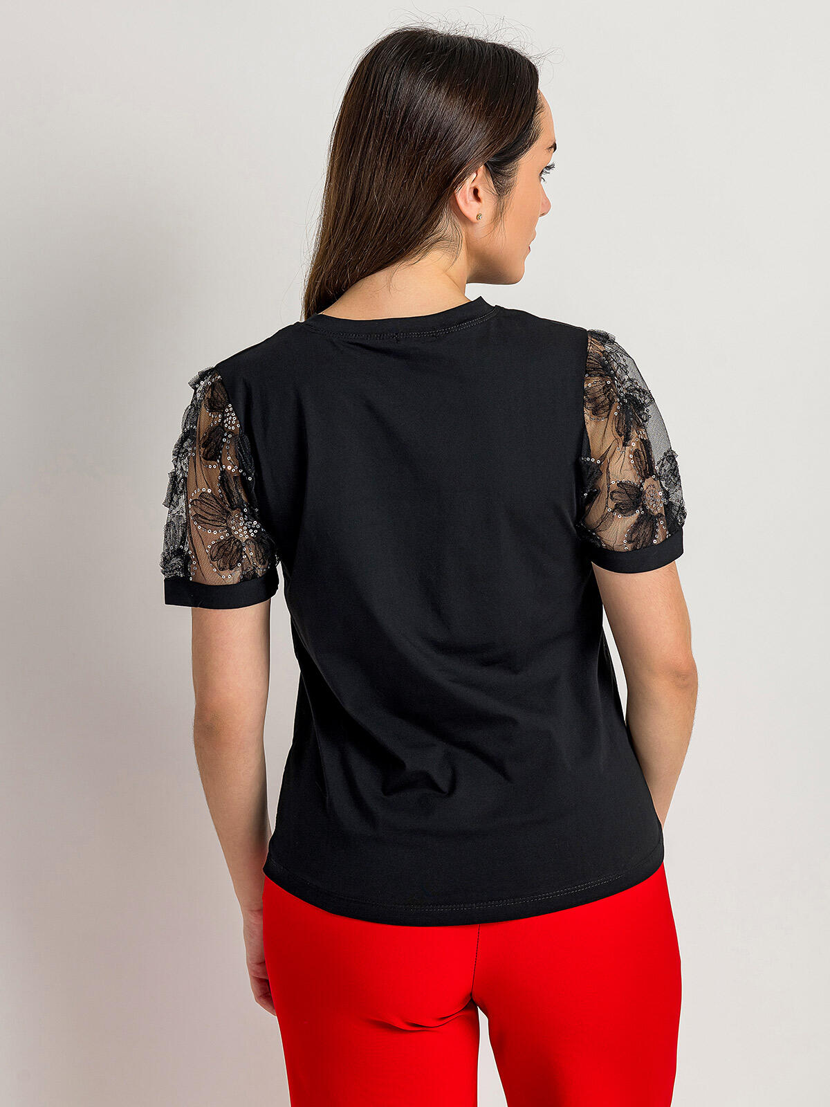 Odkryj elegancję i wygodę! Nasza czarna bluzka wykonana z miękkiej bawełny to doskonały wybór na każdą okazję. Krótkie rękawy z siateczki, zdobione subtelnymi kwiatami, dodają jej niepowtarzalnego charakteru oraz lekkości. Gładki przód i tył sprawiają, że bluzka jest niezwykle uniwersalna, pasując zarówno do eleganckich, jak i codziennych stylizacji. 🌸✨