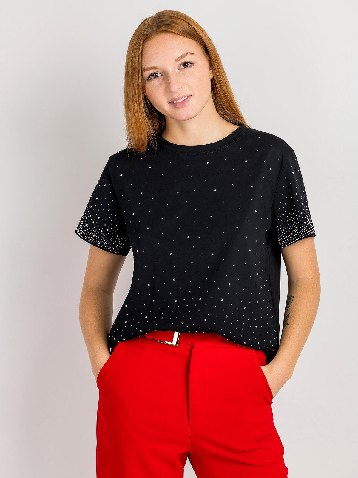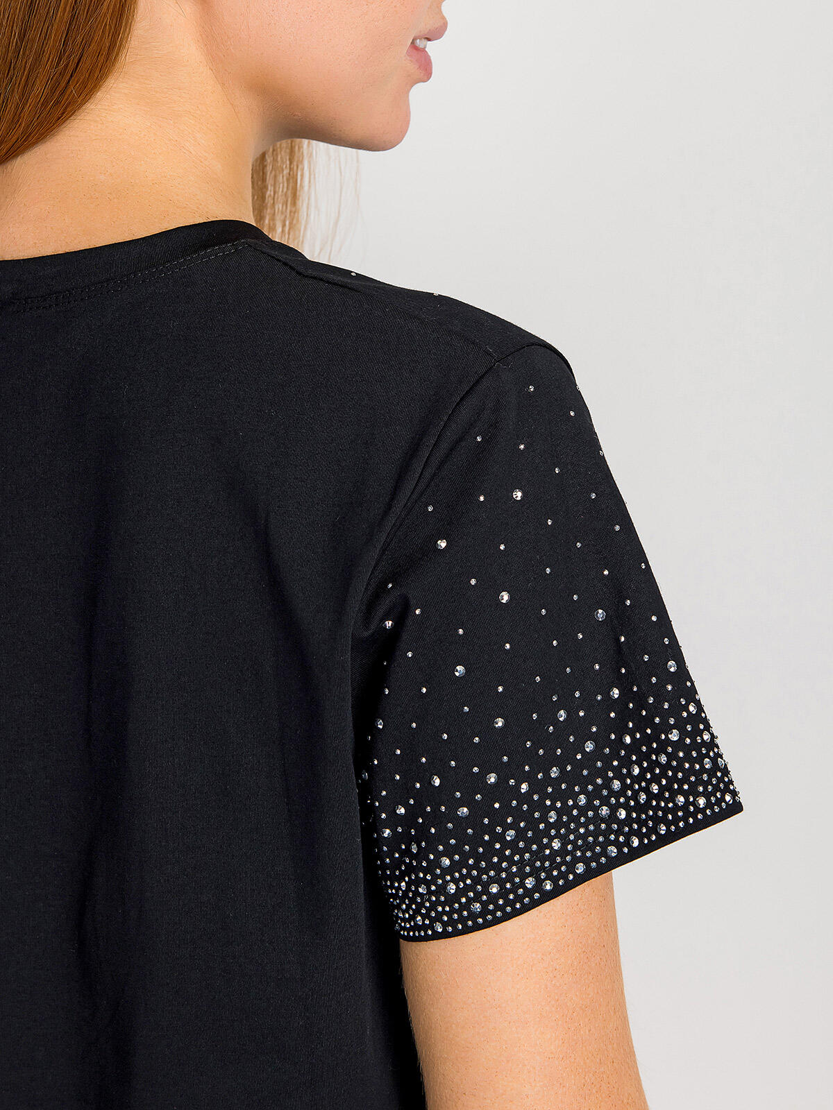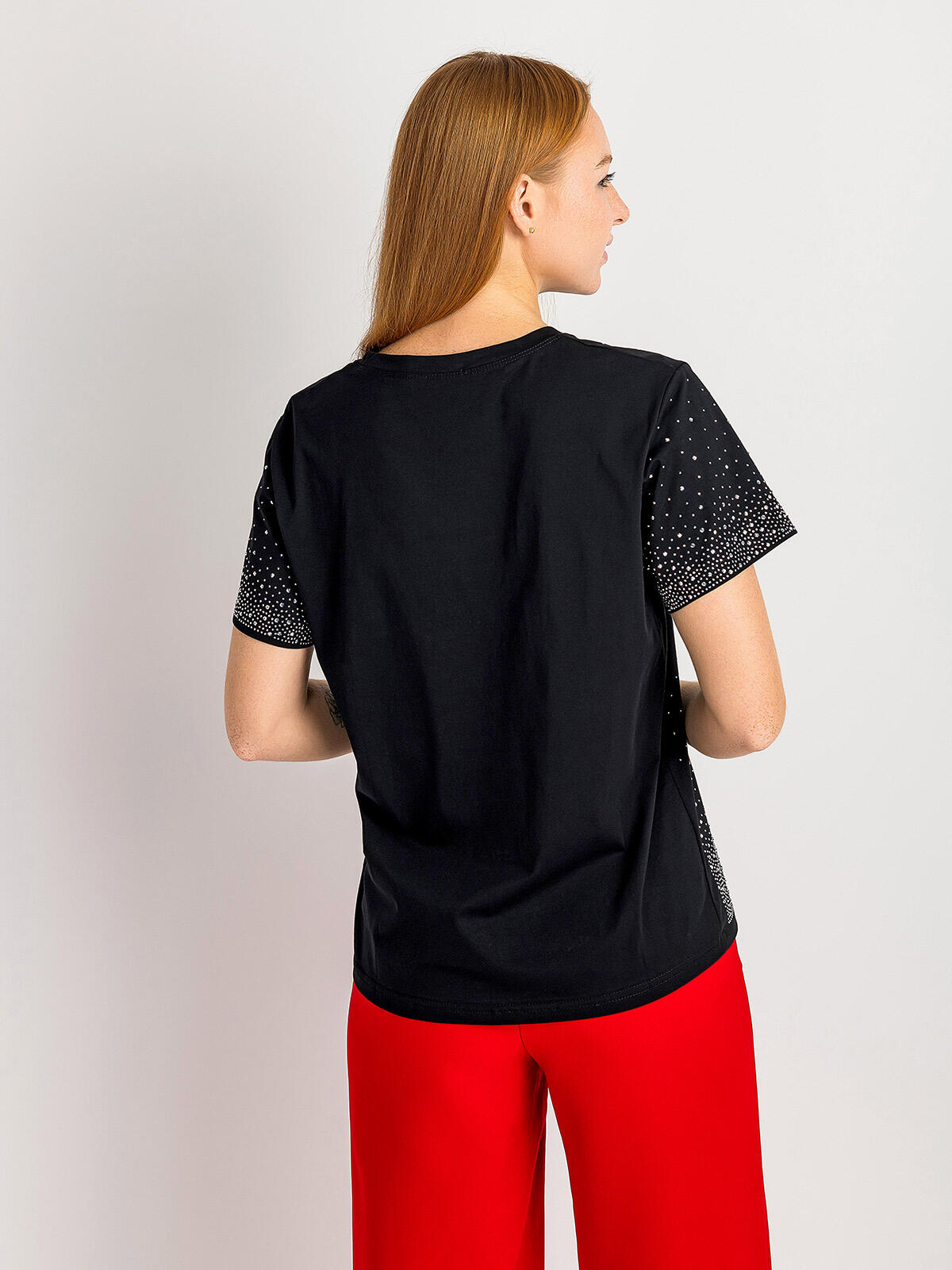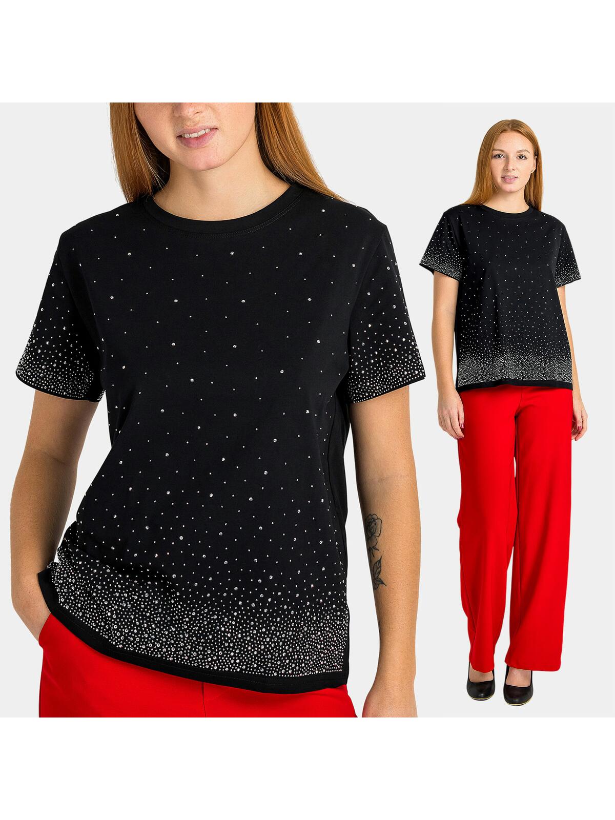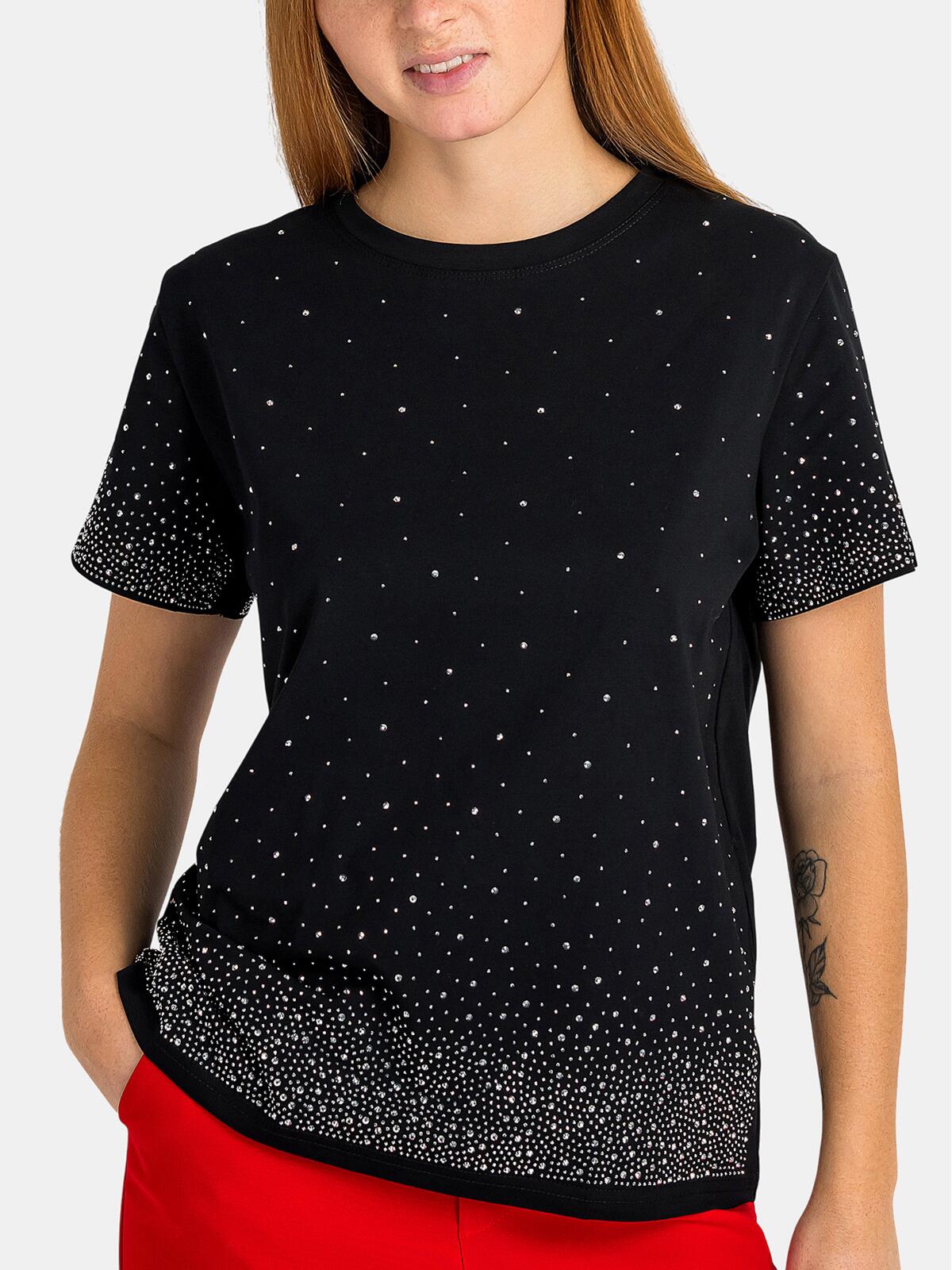 Odkryj niezwykły urok bawełnianej bluzki, która łączy w sobie elegancję i wygodę! W kolorze czarnym, z modnymi detalami w postaci srebrnych cyrkonii na przodzie oraz rękawach, ta bluzka doda blasku każdej stylizacji. Krótki rękaw zapewnia komfort, a gładki tył sprawia, że doskonale komponuje się zarówno z jeansami, jak i spódnicą.