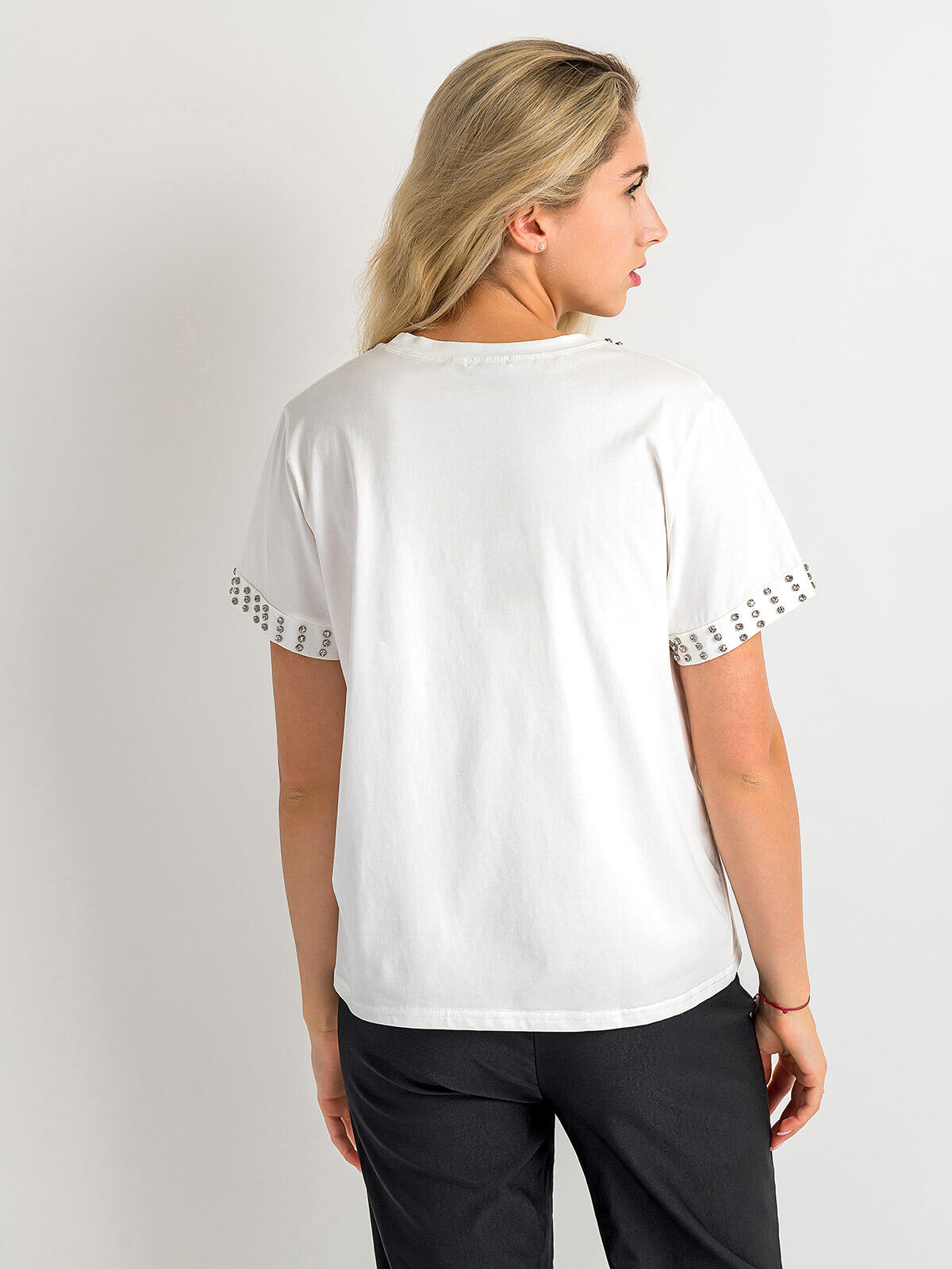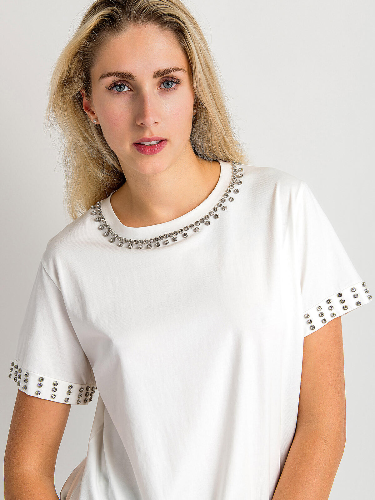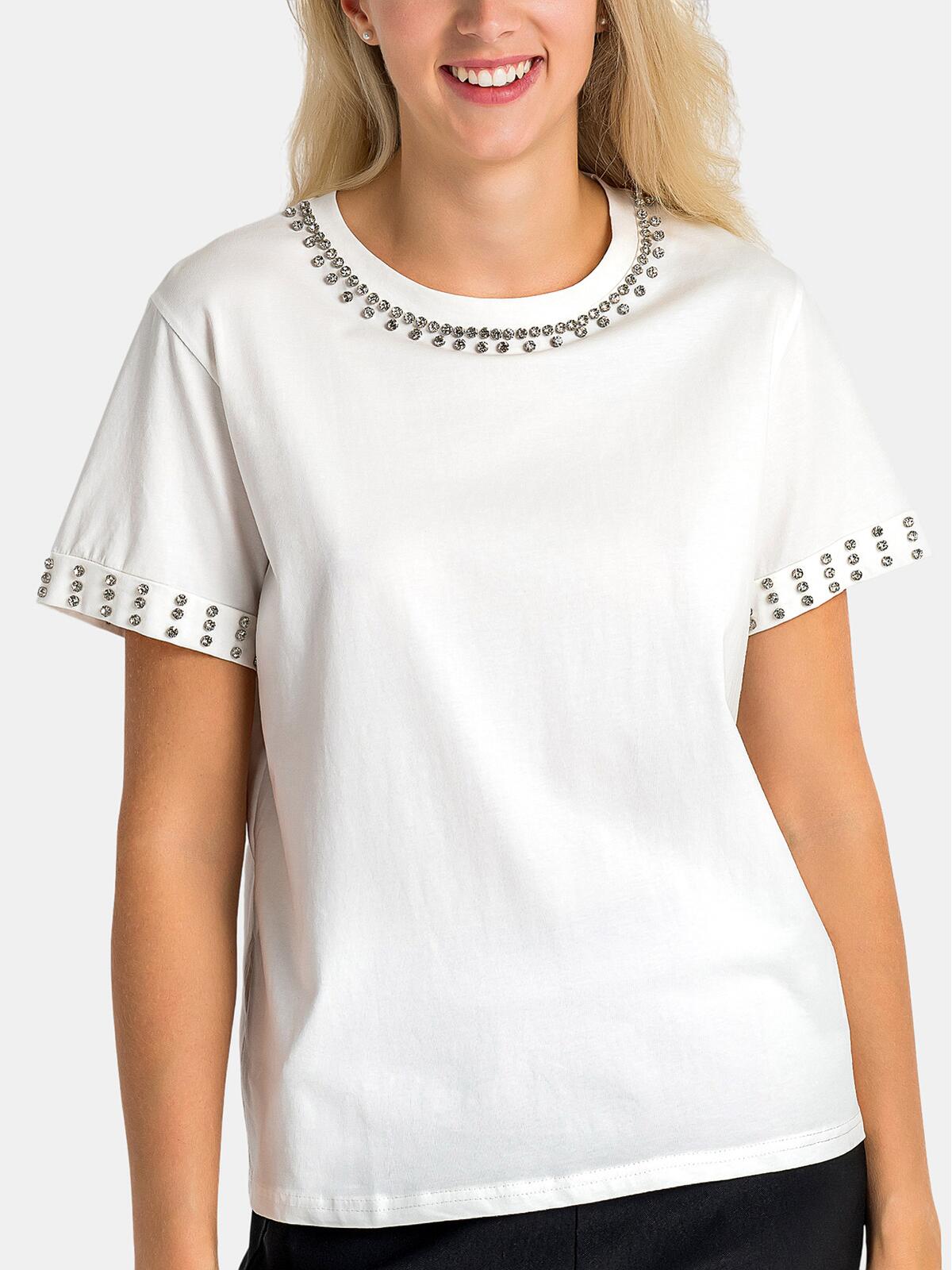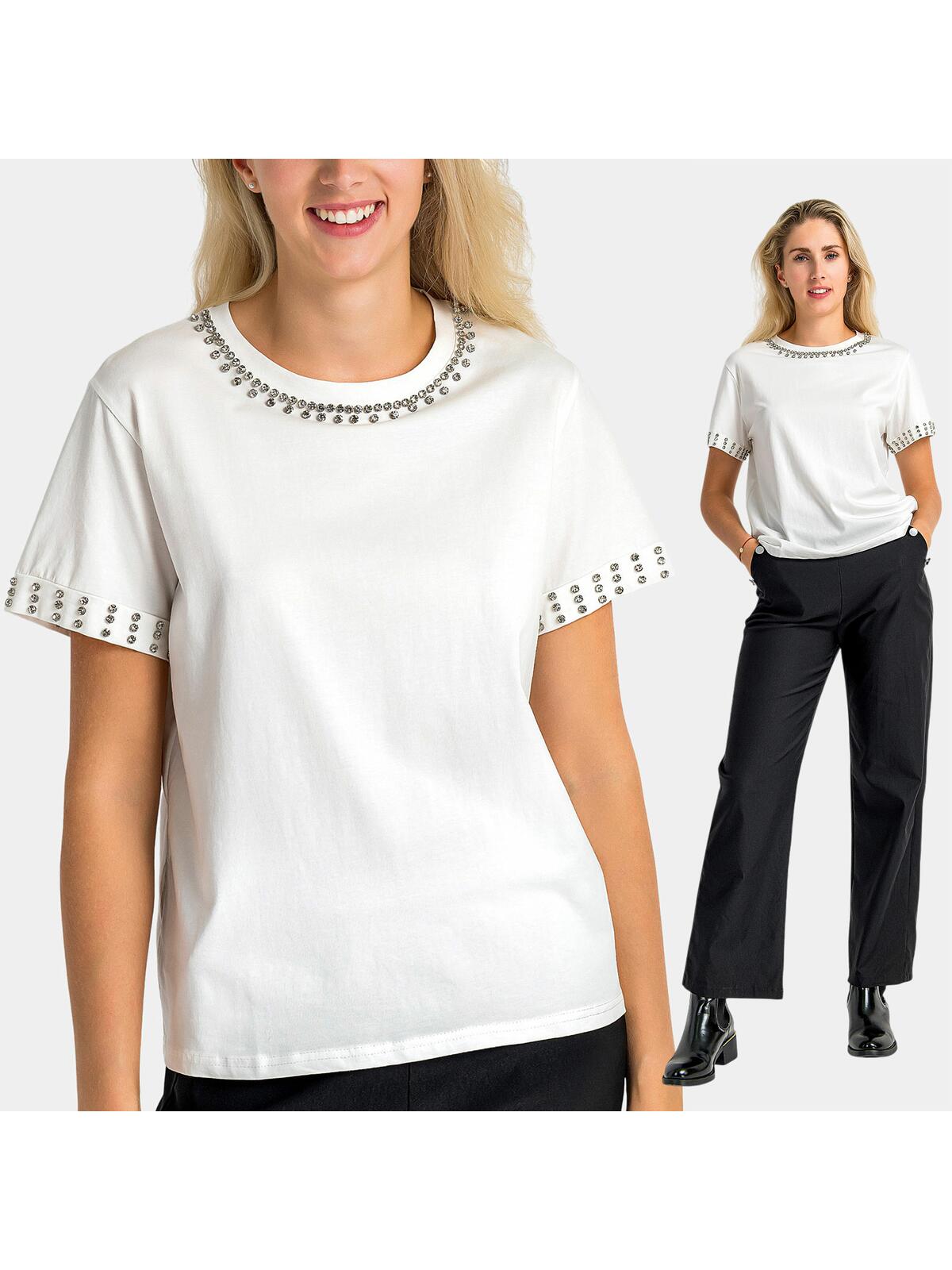 Nasza biała bluzka z bawełny to połączenie komfortu i elegancji, które doda blasku każdej stylizacji! 🌟 Szykownie zdobiony dekolt z błyszczącymi detalami oraz krótkie rękawy z modnymi akcentami sprawią, że będziesz czuć się wyjątkowo w każdej sytuacji. Idealna na co dzień i na szczególne okazje, ta bluzka z pewnością przełamie monotonność Twojej garderoby.