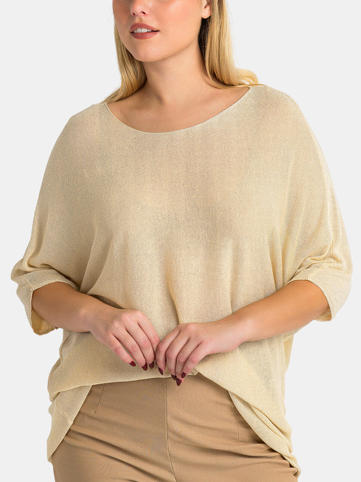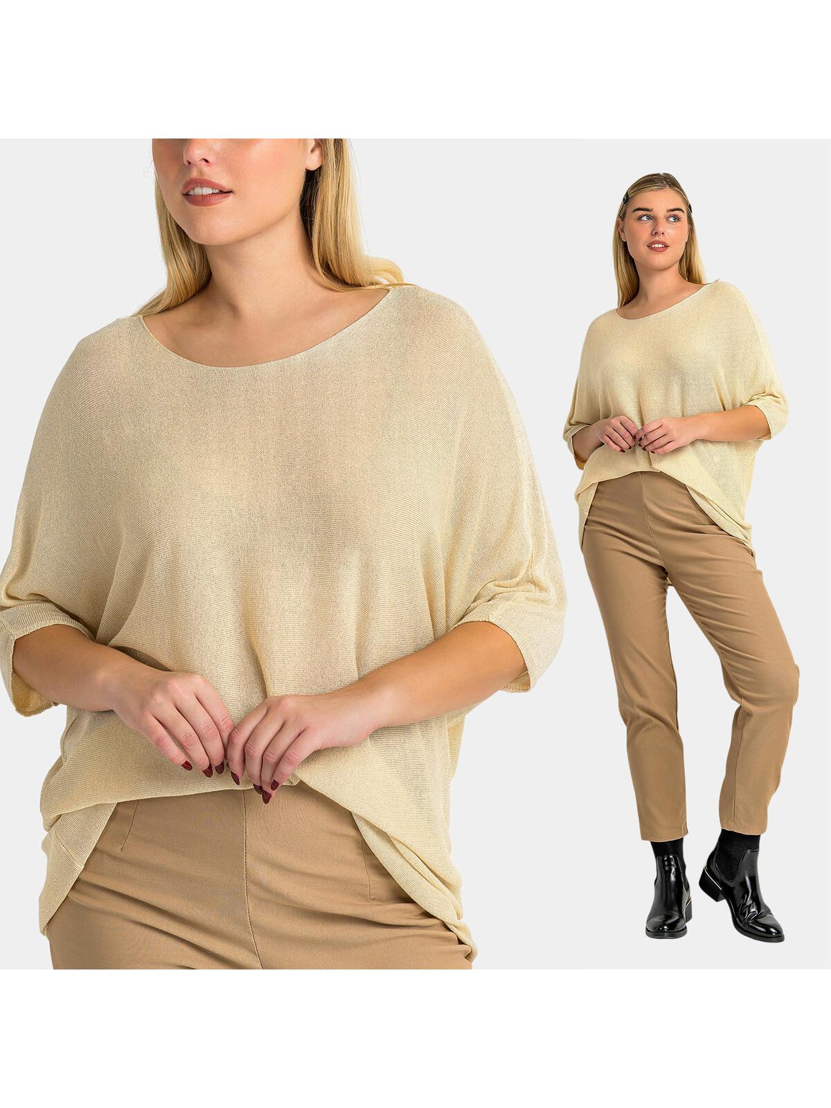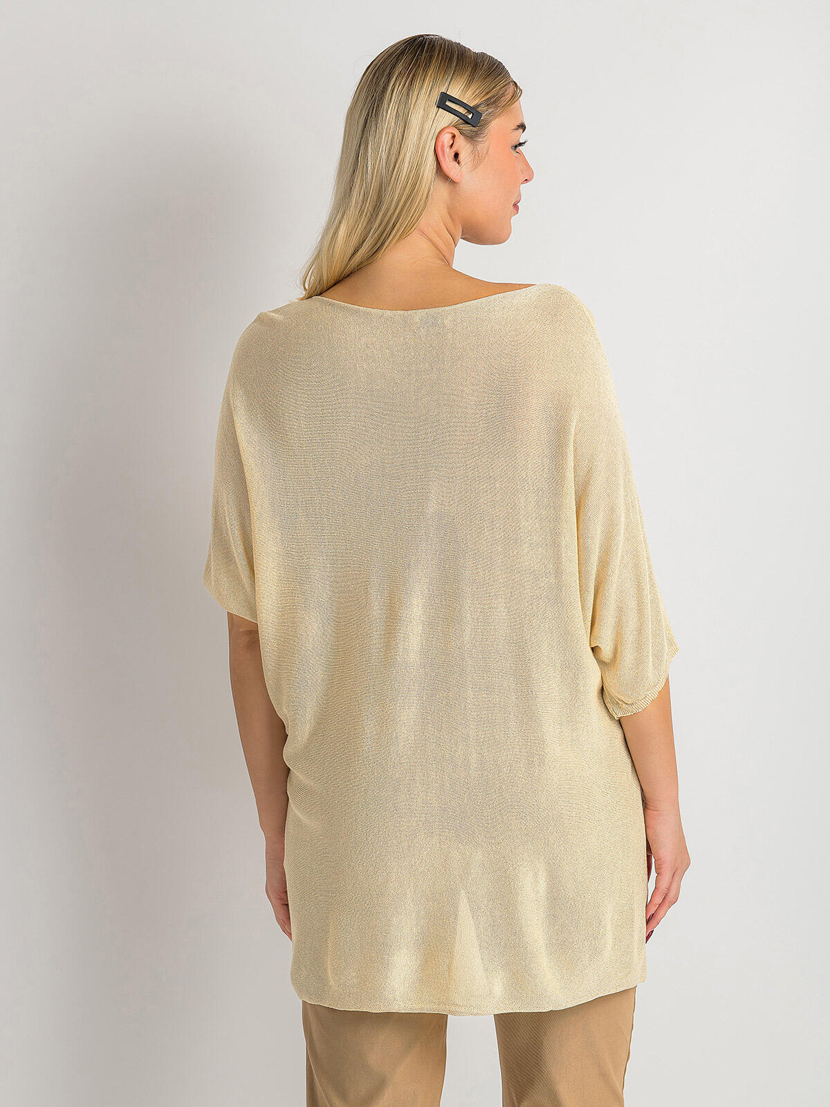 Odkryj naszą wyjątkową bluzkę oversize z bawełną, która łączy w sobie elegancję z wygodą! ✨ W delikatnym beżowym kolorze, wzbogacona o metaliczną nitkę, ta bluzka doda blasku każdej casualowej stylizacji. Luźny, oversize’owy krój zapewnia maksymalny komfort, a miękka tkanina otuli Twoją skórę przyjemnym dotykiem. 🌼 Szeroki, zaokrąglony dekolt subtelnie eksponuje szyję, a rękawy o długości ¾ z luźnym wykończeniem dodają całości swobodnego charakteru. Dodatkowo, lekko asymetryczny dół sprawia, że przód jest nieco krótszy od tyłu, co czyni tę bluzkę idealną do zestawienia zarówno ze spodniami, jak i spódnicą. Ta propozycja jest doskonała na co dzień, do pracy lub spotkania z przyjaciółmi! 👗✨