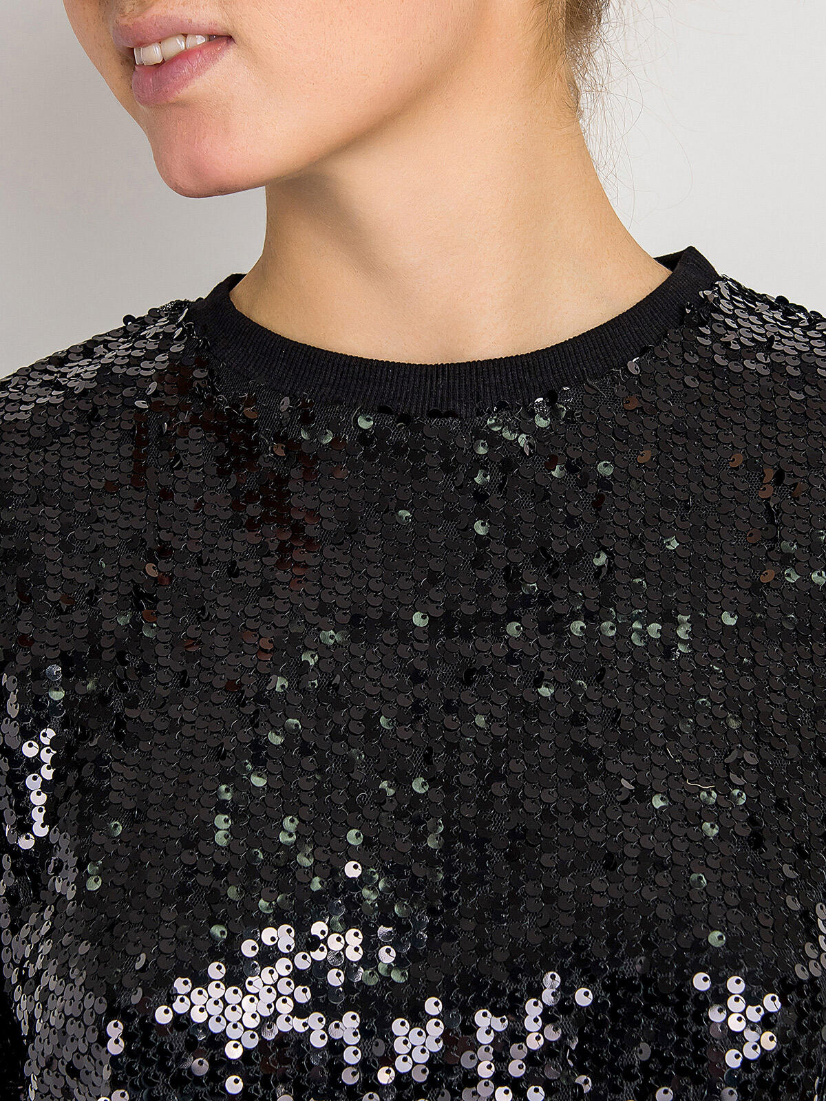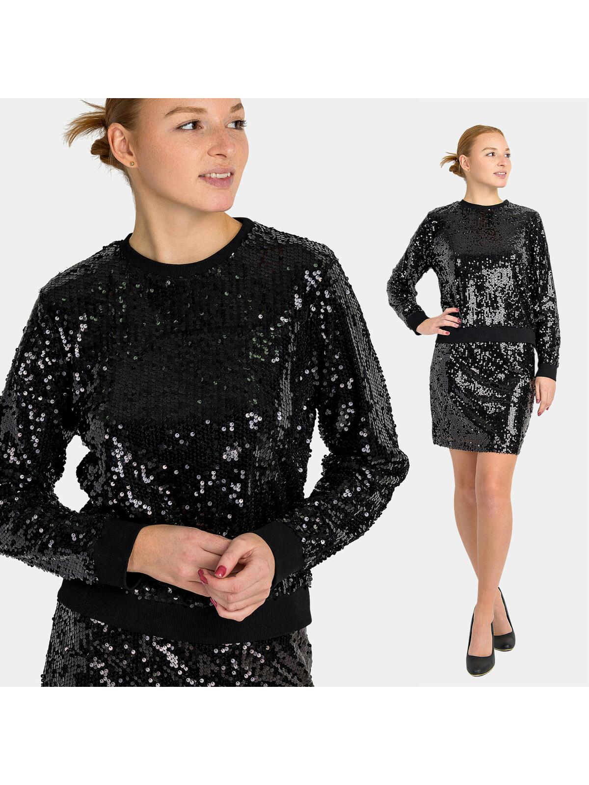 Przygotuj się na wyjątkowe okazje z naszą czarną cekinową bluzą! ✨ Ta niezwykła bluza łączy w sobie elegancję i swobodę, dzięki czemu poczujesz się pewnie w każdej sytuacji. Długie rękawy zakończone ściągaczami oraz dół bluzy w takim samym stylu, sprawiają, że pasuje ona do wielu stylizacji. Idealna na imprezy, wieczorne wyjścia czy rodzinne uroczystości. Wybierz ją, by dodać odrobinę blasku do swego looku! 🌟😊