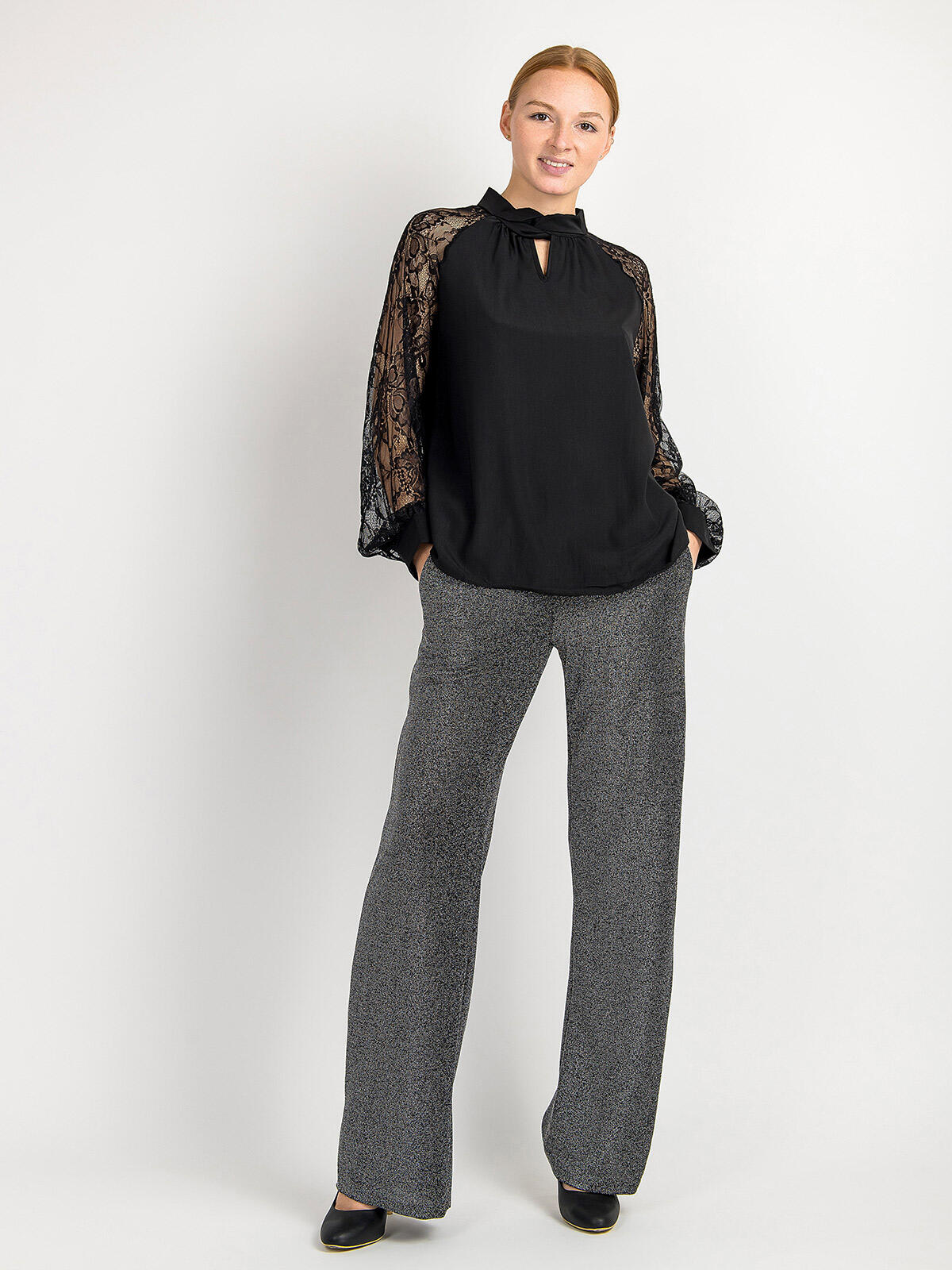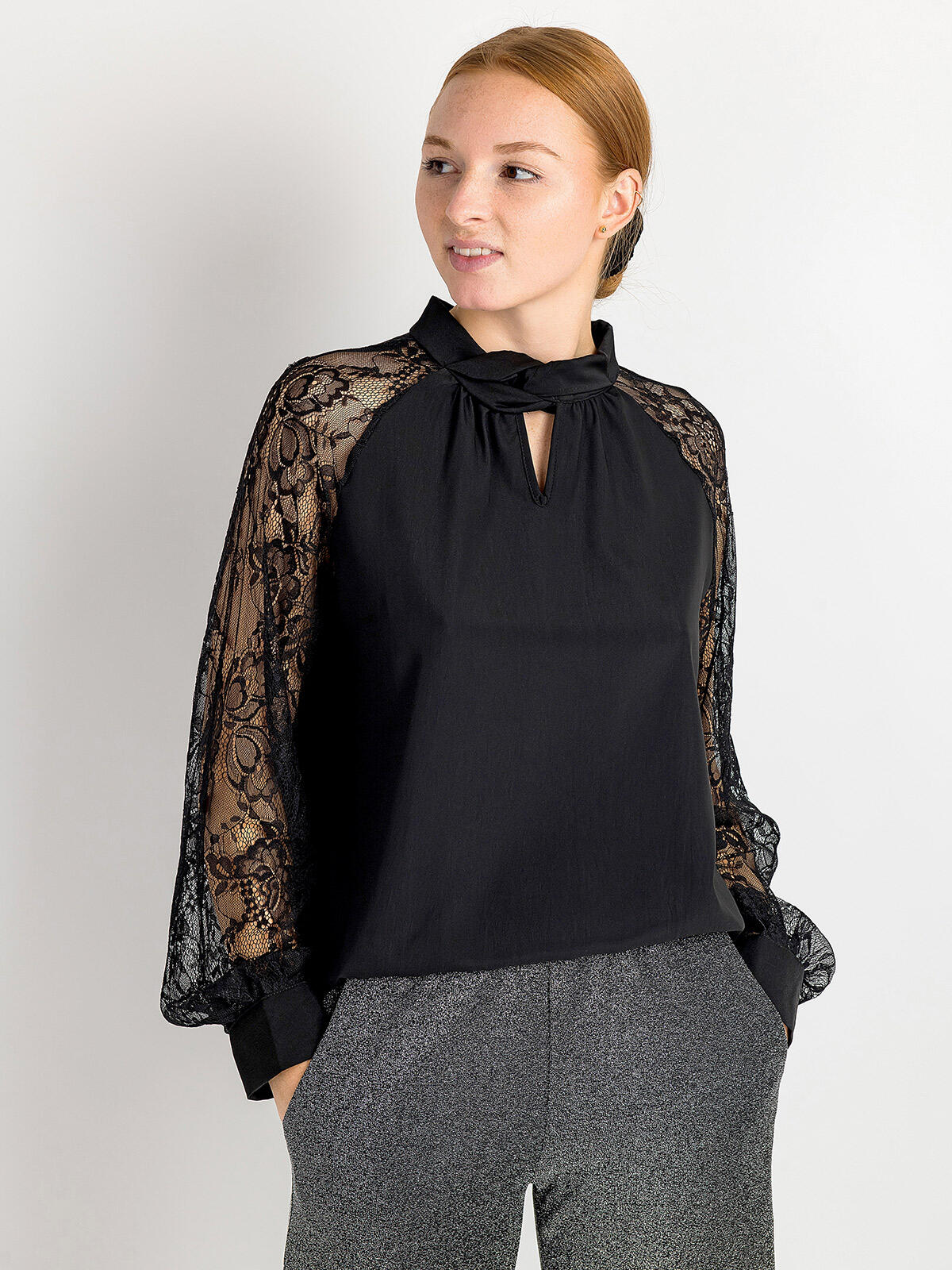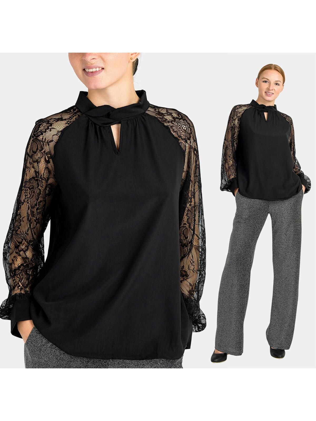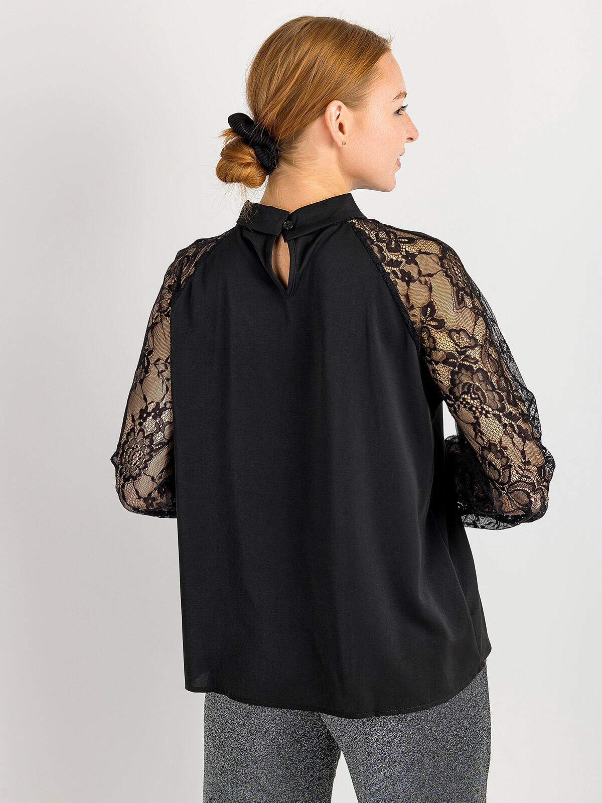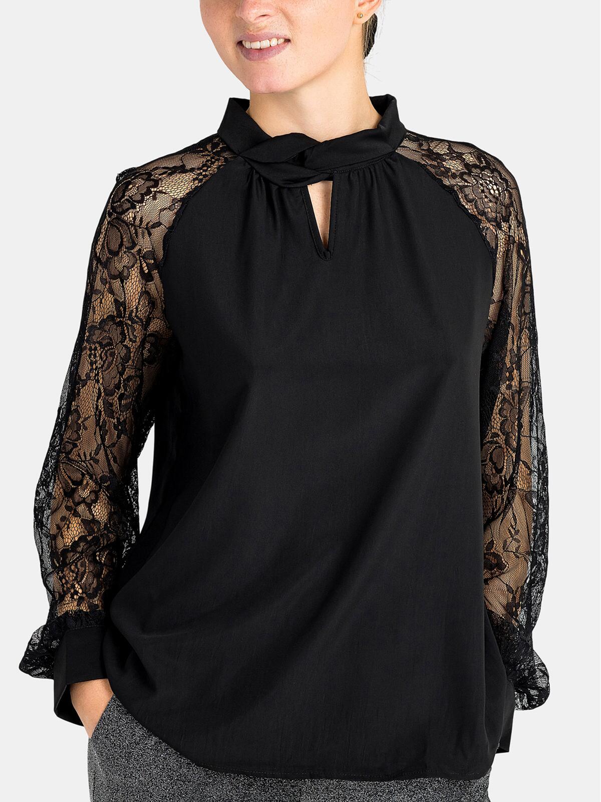 Wprowadź do swojej garderoby odrobinę luksusu i stylu! Nasza czarna bluzka z ozdobnymi rękawami to idealny wybór dla pań, które pragną wyglądać elegancko i modnie. 😊 Zjawiskowy przeplatany kołnierz z tyłu posiada zapięcie na guzik dodając oryginalności, a subtelne wycięcie na dekolcie pięknie eksponuje szyję. Długie rękawy z koronki wprowadzają nutę romantyzmu, sprawiając, że bluzka staje się wyjątkowo kobieca. ✨ Luźny krój zapewnia komfort noszenia, dzięki czemu możesz poczuć się swobodnie, niezależnie od sytuacji. Idealna na wieczorne wyjścia, spotkania ze znajomymi czy do pracy! 🍷