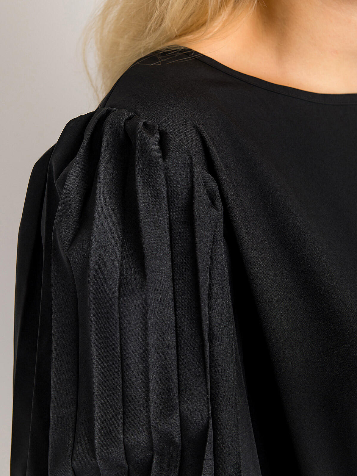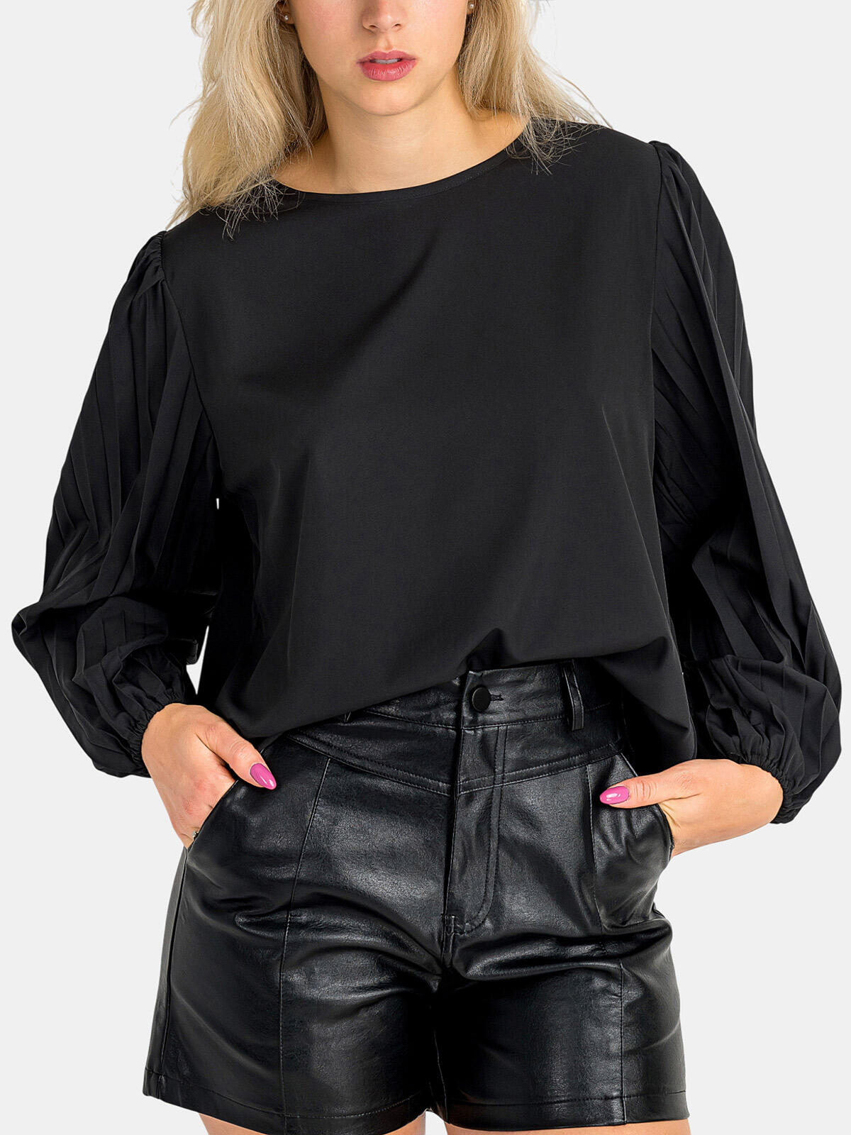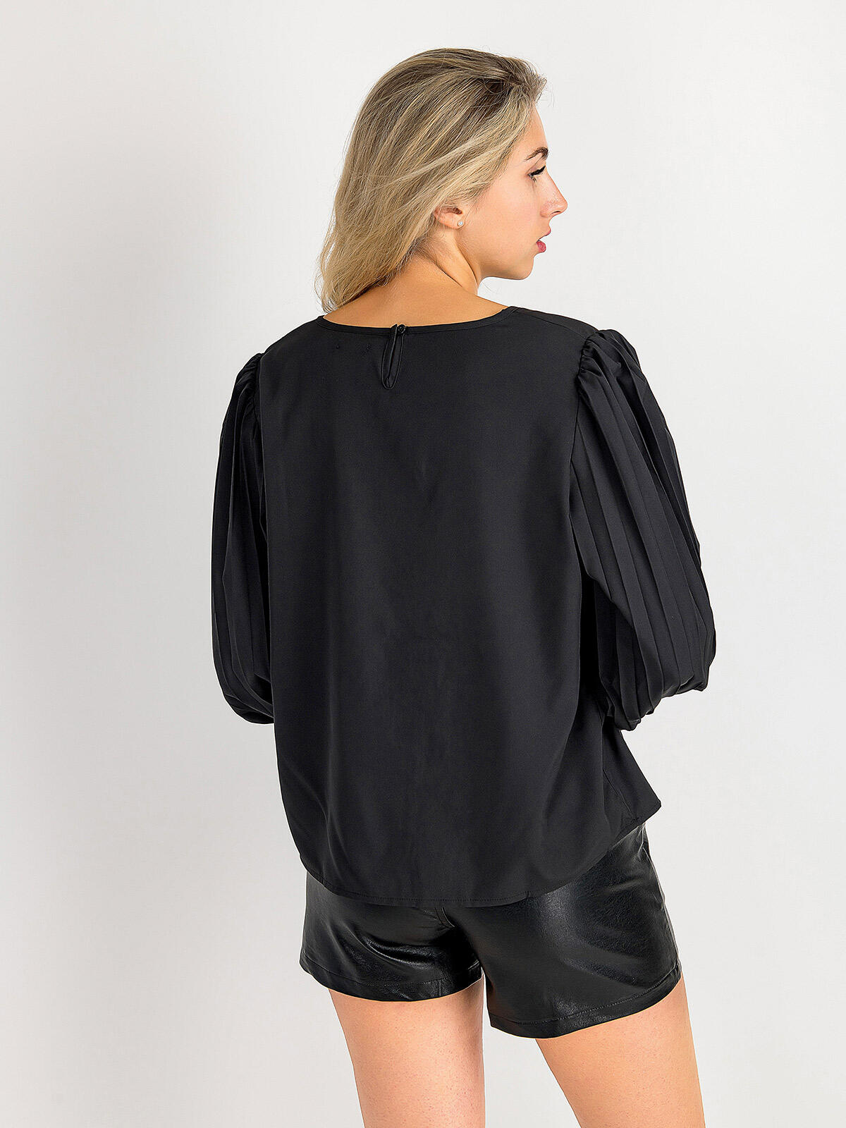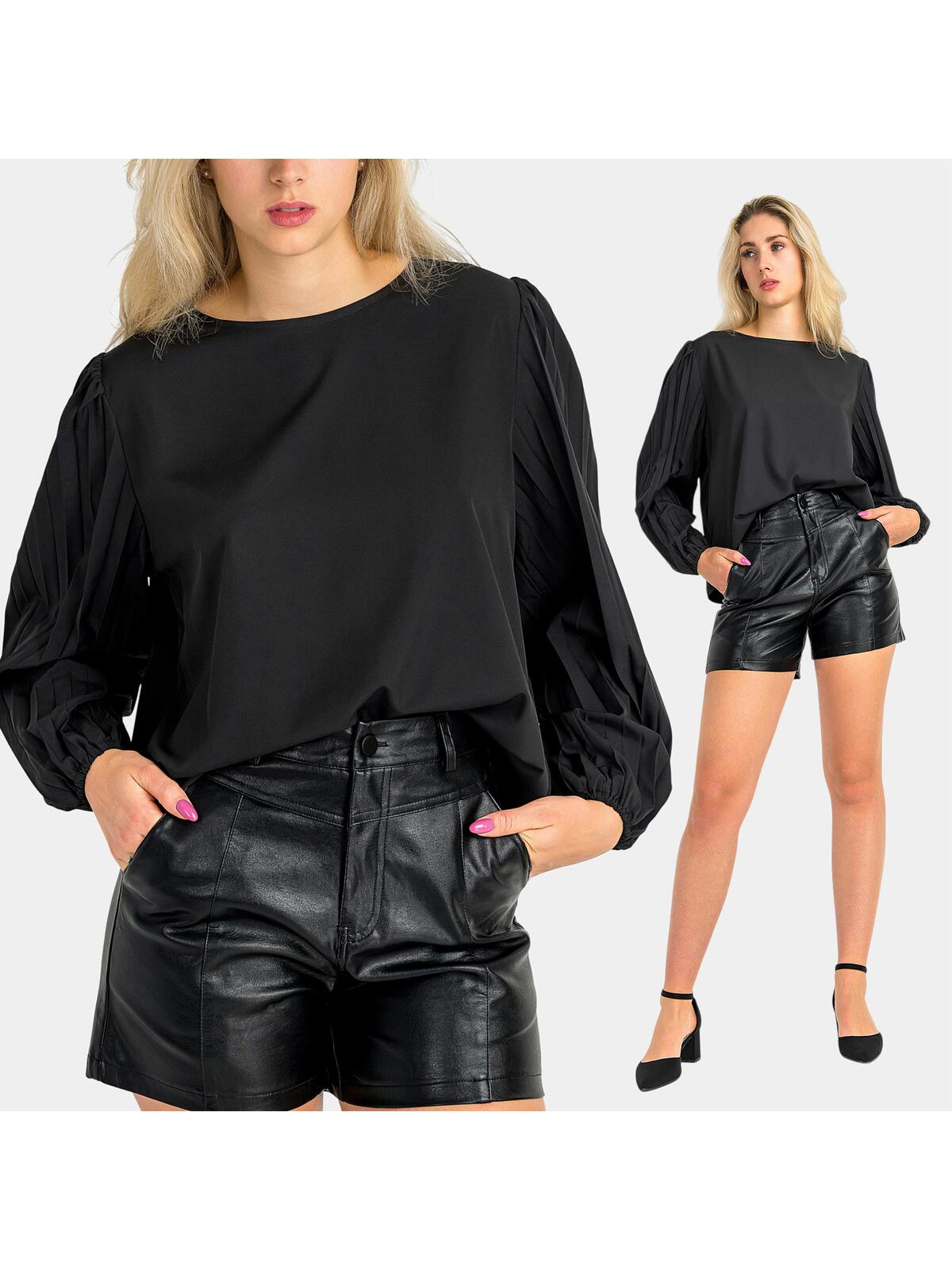 Przedstawiamy luźną czarną bluzkę, która stanie się nieodłącznym elementem Twojej garderoby. Jej elegancki krój z długimi plisowanymi rękawami zakończonymi zwężającą gumką sprawia, że doskonale sprawdzi się na każdą okazję – od spotkań biznesowych po wyjścia w gronie przyjaciół. 🌟 Nie tylko doskonale się prezentuje, ale także zapewnia wygodę przez cały dzień.