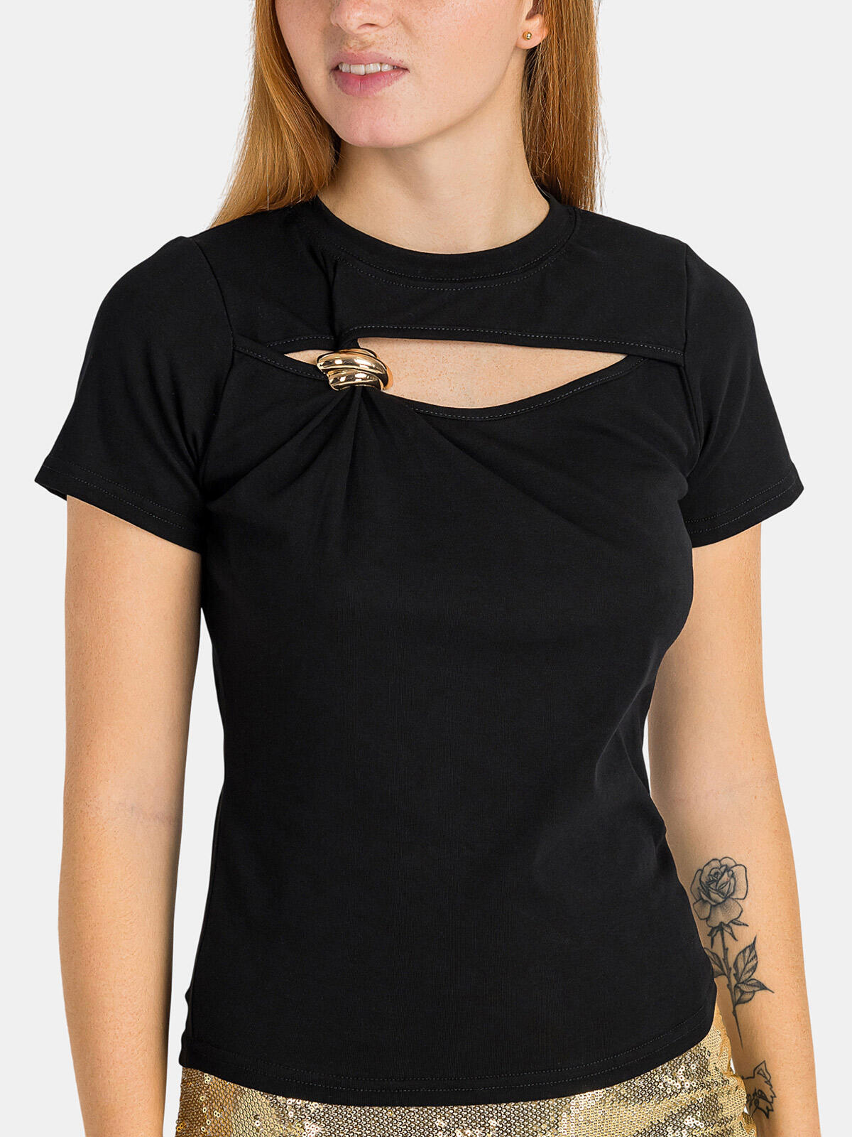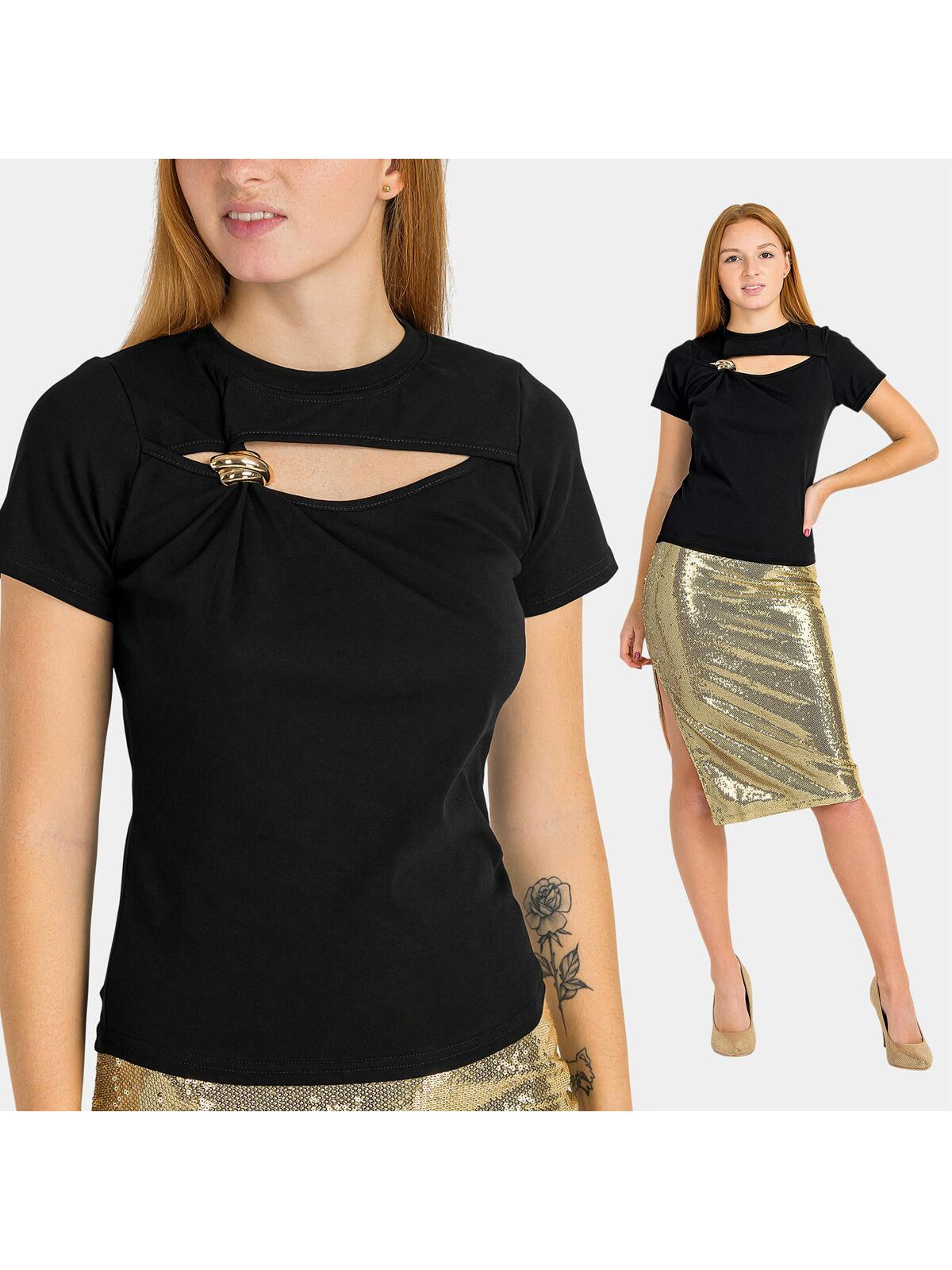 Odkryj naszą nową bluzkę bawełnianą w kolorze czarnym, która stanie się must-have w Twojej garderobie! ✨ Z wyjątkowym wycięciem na dekolcie, dodaje charakteru każdej stylizacji. Efektowne marszczenie spięte elegancką złotą aplikacją wzbogaca całość, sprawiając, że bluzka jest nie tylko modna, ale i zjawiskowa. Krótki rękaw zapewni Ci wygodę i przewiewność, dzięki czemu poczujesz się swobodnie, niezależnie od okoliczności. 💖