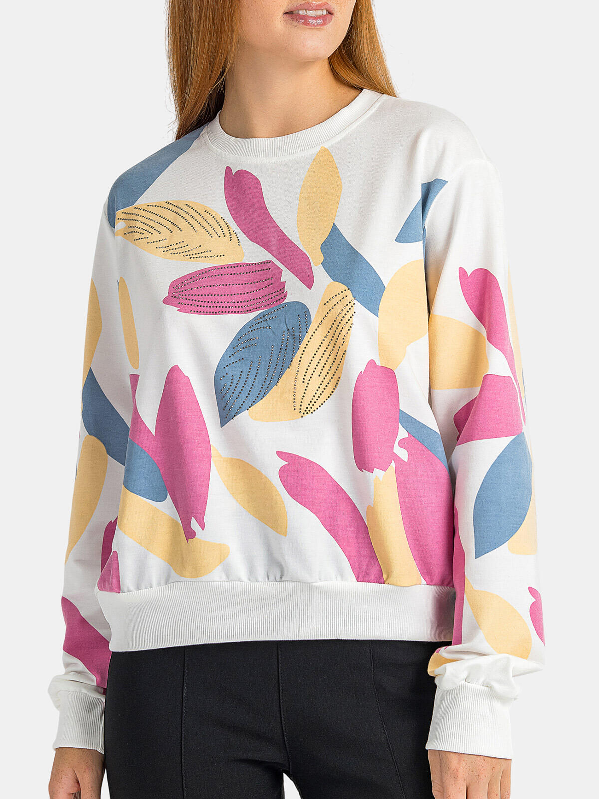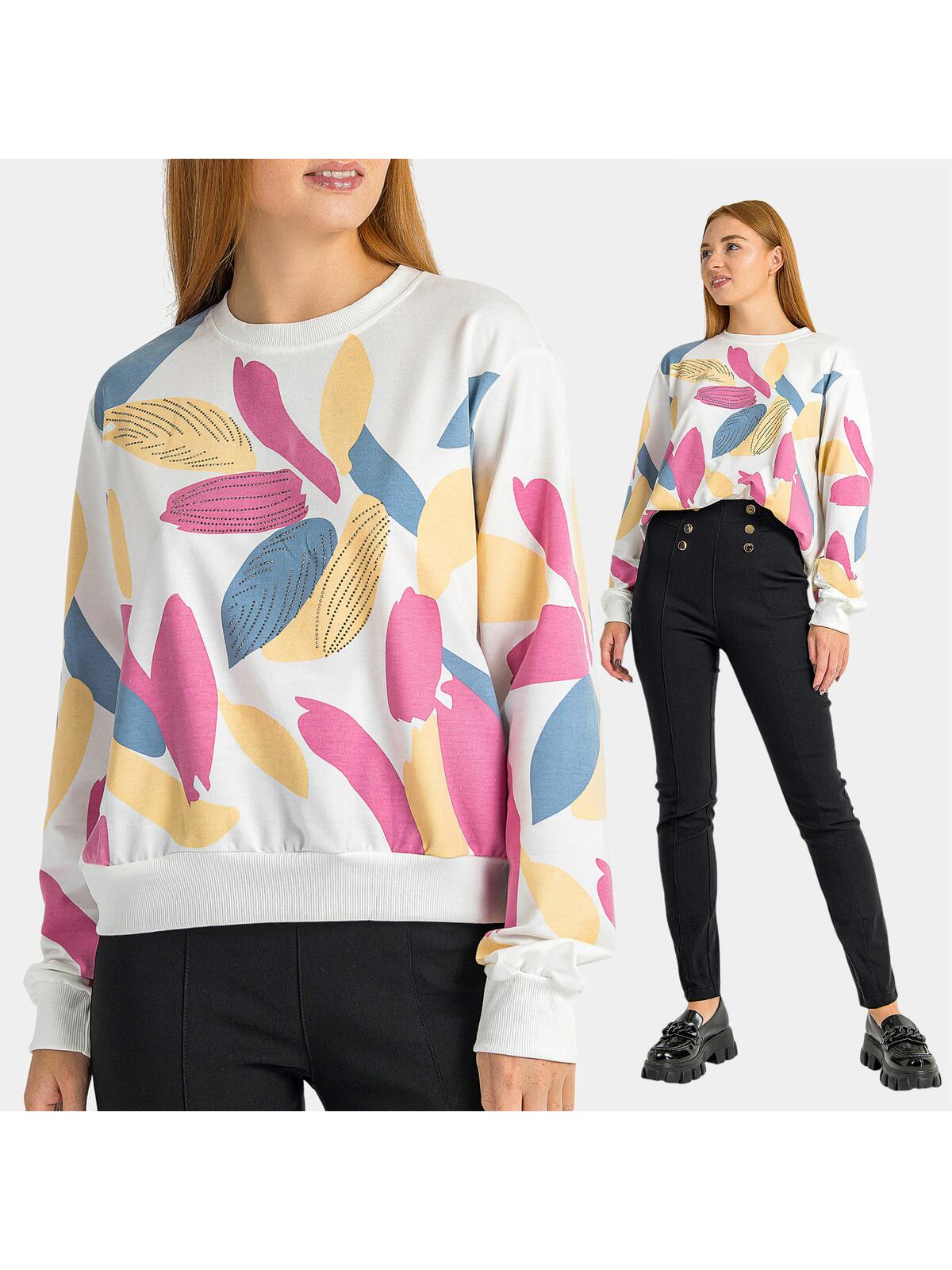 Wprowadź kolor do swojej garderoby dzięki naszej stylowej bluzie damskiej! Oferuje ona nie tylko wyjątkowy, kolorowy wzór, ale również subtelne kryształki, które dodają jej elegancji. 👗 Wygodny, luźny fason sprawia, że jest idealna na każdą okazję, a wykończenie ściągaczami zapewnia doskonałe dopasowanie. Niezależnie od pory roku, ta bluza stanie się Twoim ulubionym elementem codziennej stylizacji. 🌟