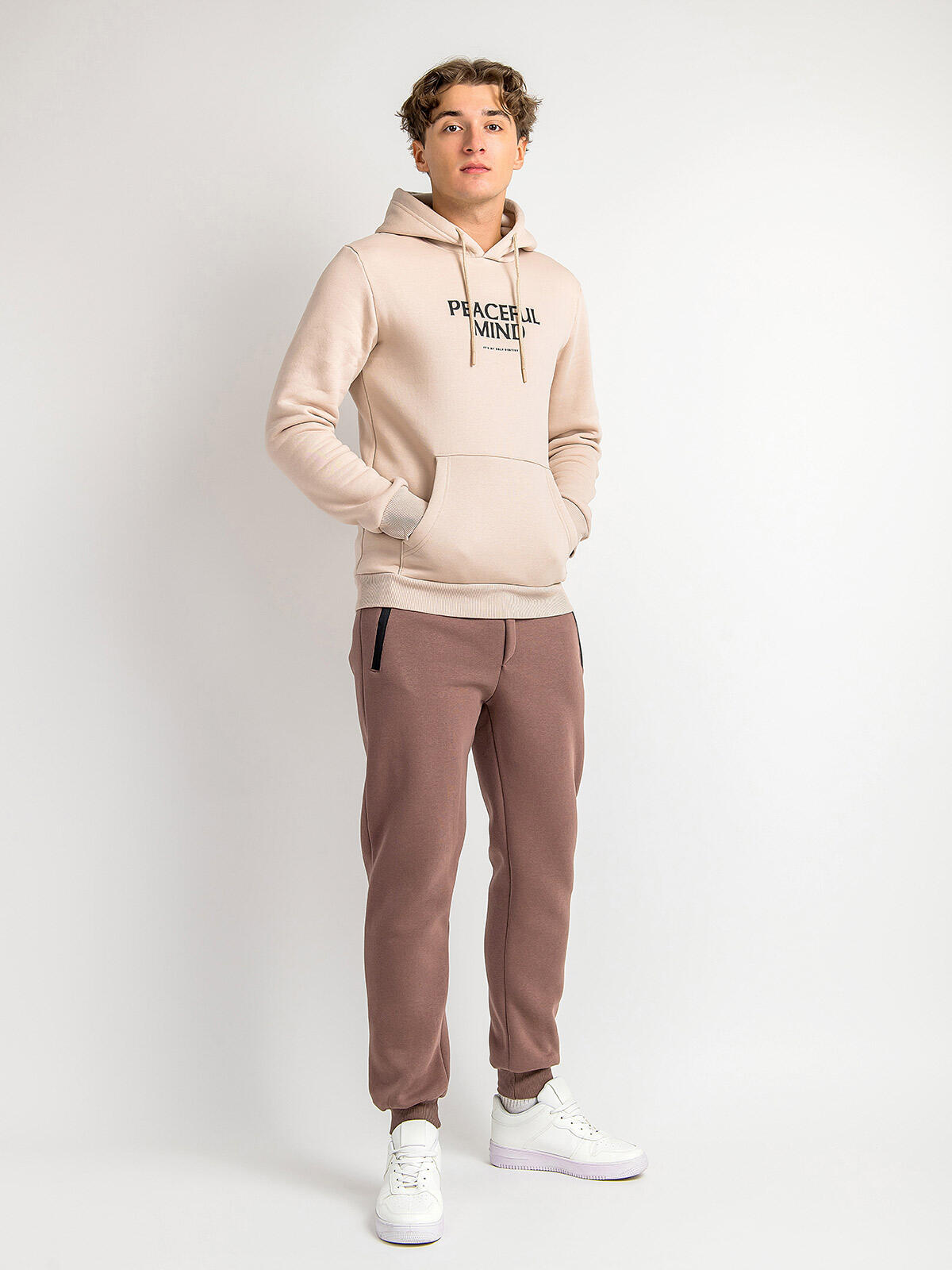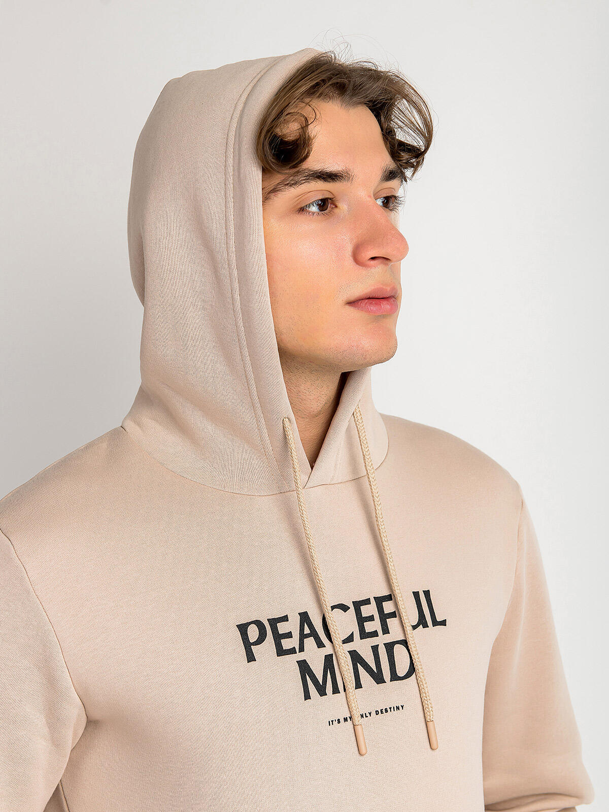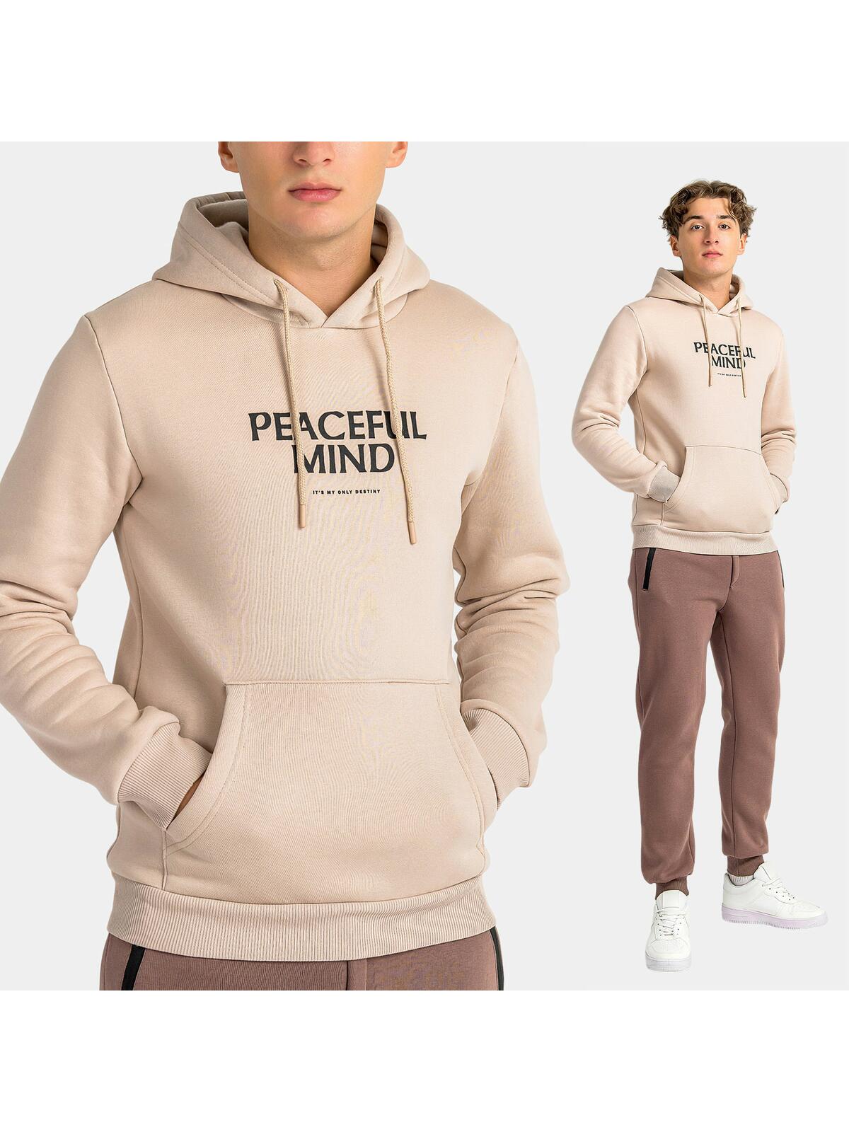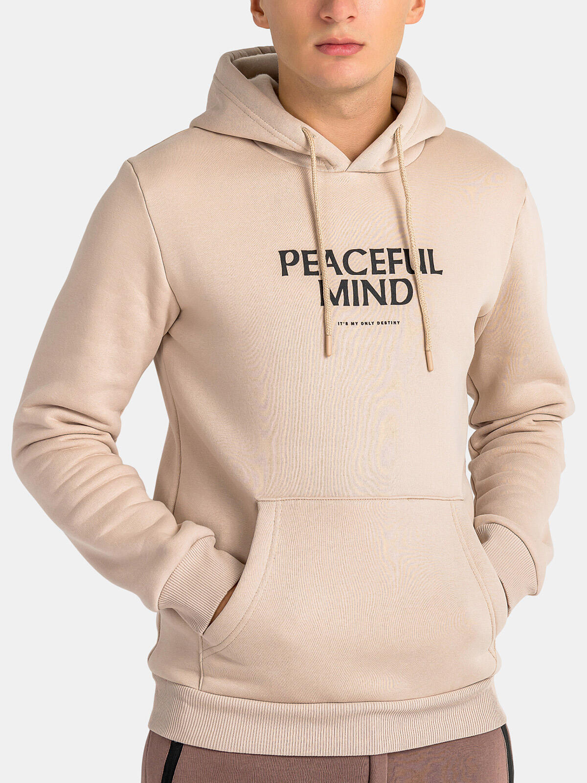 Odkryj niezwykłą wygodę i styl dzięki naszej beżowej bluzie z kapturem! 😍 Wykonana z wysokiej jakości materiałów, z dominującą bawełną, oferuje nie tylko komfort, ale także modny wygląd, który przyciągnie spojrzenia. Jej ozdobny napis „PEACEFUL MIND” doda charakteru każdej stylizacji. Długie rękawy zakończone ściągaczami oraz dolna krawędź również wyposażona w ściągacz gwarantują perfekcyjne dopasowanie. A kaptur ze ściągaczami pozwala na dodatkową ochronę przed wiatrem. 🧥
