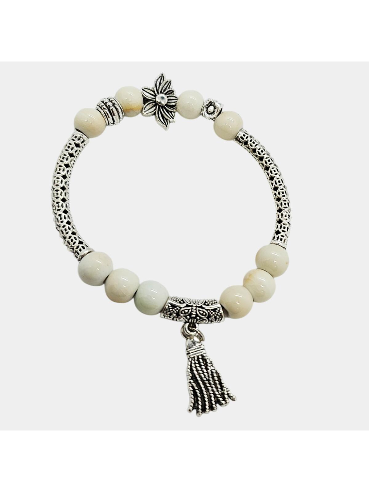 Ta bransoletka damska to połączenie elegancji i delikatności, które doskonale podkreśli każdą stylizację. Ażurowe elementy w kolorze srebra w połączeniu z ceramicznymi koralikami w odcieniu kremowym tworzą wyszukany, ale subtelny design, idealny na co dzień. Zawieszka w kształcie chwostu dodaje jej kobiecości i lekkości, nadając całości niepowtarzalnego charakteru.