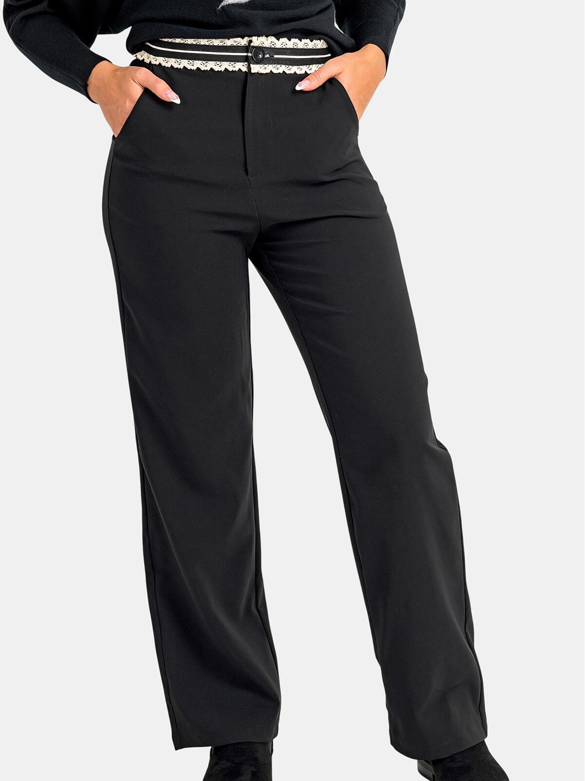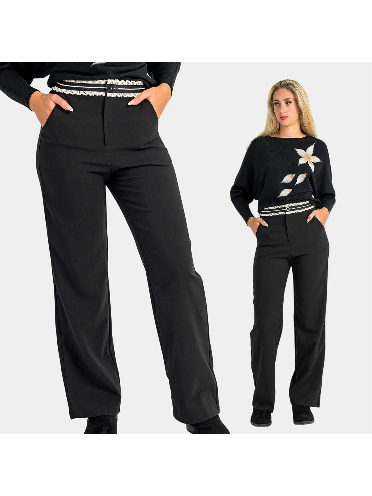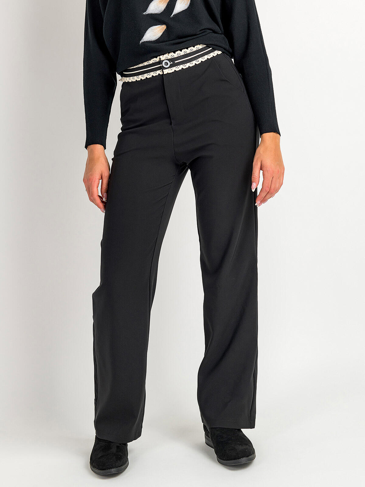 Przenieś swoją garderobę na wyższy poziom! Nasze czarne spodnie z wysokim stanem to idealne połączenie elegancji i komfortu. Zapinane na guzik oraz zamek błyskawiczny, doskonale podkreślają talię, a elastyczna marszczona gumka z tyłu dodaje jeszcze większej wygody. Ozdobny pas ze koronką nadaje im unikalnego charakteru, dzięki czemu świetnie sprawdzą się na każdą okazję – od spotkań towarzyskich po formalne wyjścia. 😊