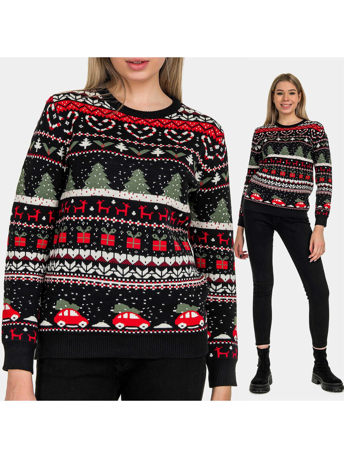 Prążkowany, zaokrąglony dekolt oraz długie rękawy z luźnymi mankietami to detale, które łączą elegancję z wygodą. Piękne, typowo świąteczne wzory dodają mu wyjątkowego charakteru, a dół zakończony ściągaczem sprawia, że sweter świetnie dopasowuje się do sylwetki.