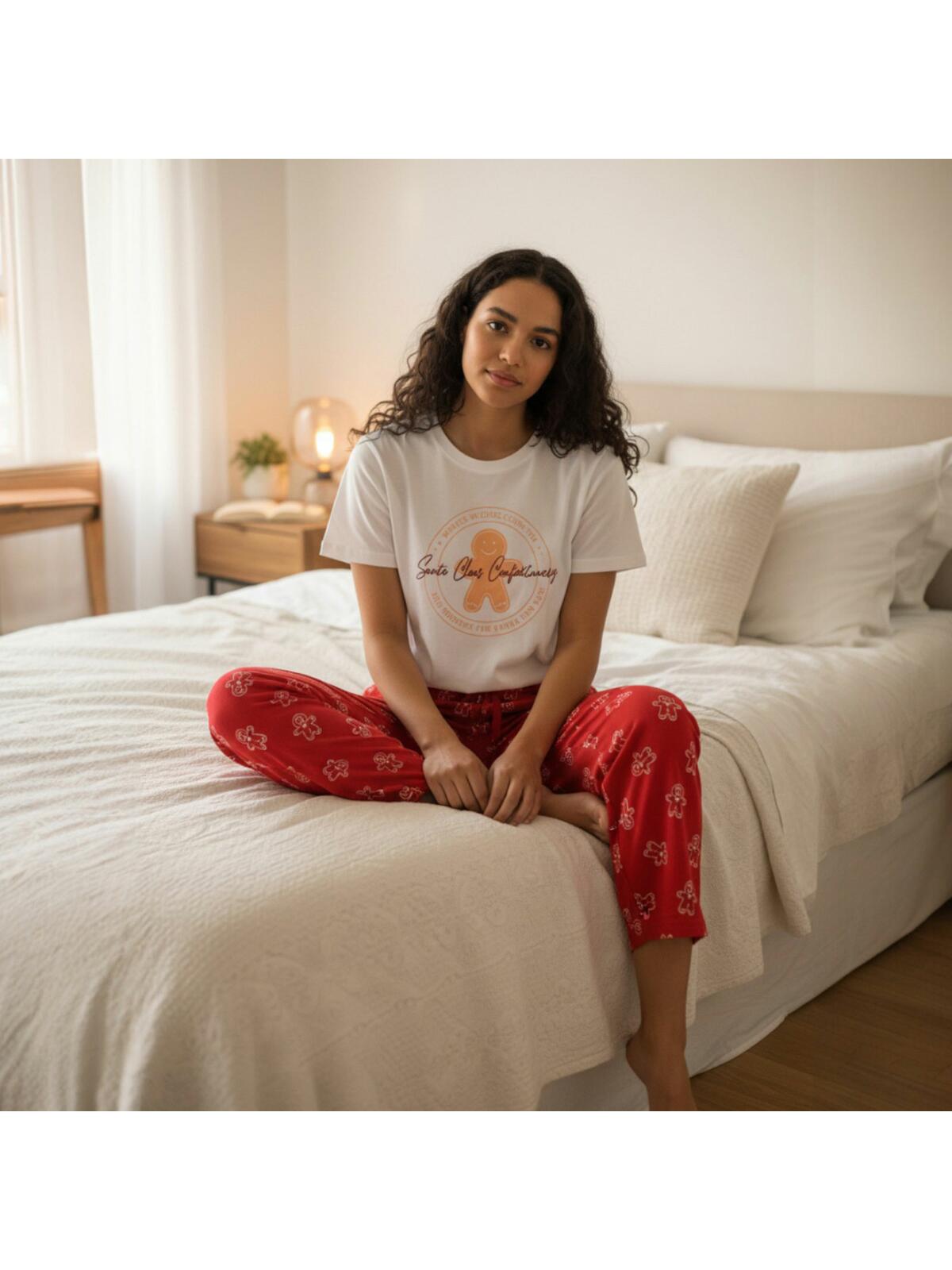 Wprowadź się w świąteczny nastrój dzięki naszej uroczej dwuczęściowej piżamie, uszytej z miękkiej, oddychającej bawełny, która zapewni Ci komfort każdej nocy. 🌟 Koszulka z okrągłym dekoltem i krótkim rękawkiem idealnie dopasuje się do Twojej sylwetki, a elastyczna talia z wiązaniem w spodniach z długimi nogawkami pozwoli na pełną swobodę ruchów. Ta piżama, ozdobiona motywem pierniczka, doda odrobinę magii do Twoich wieczorów i poranków. 🥰