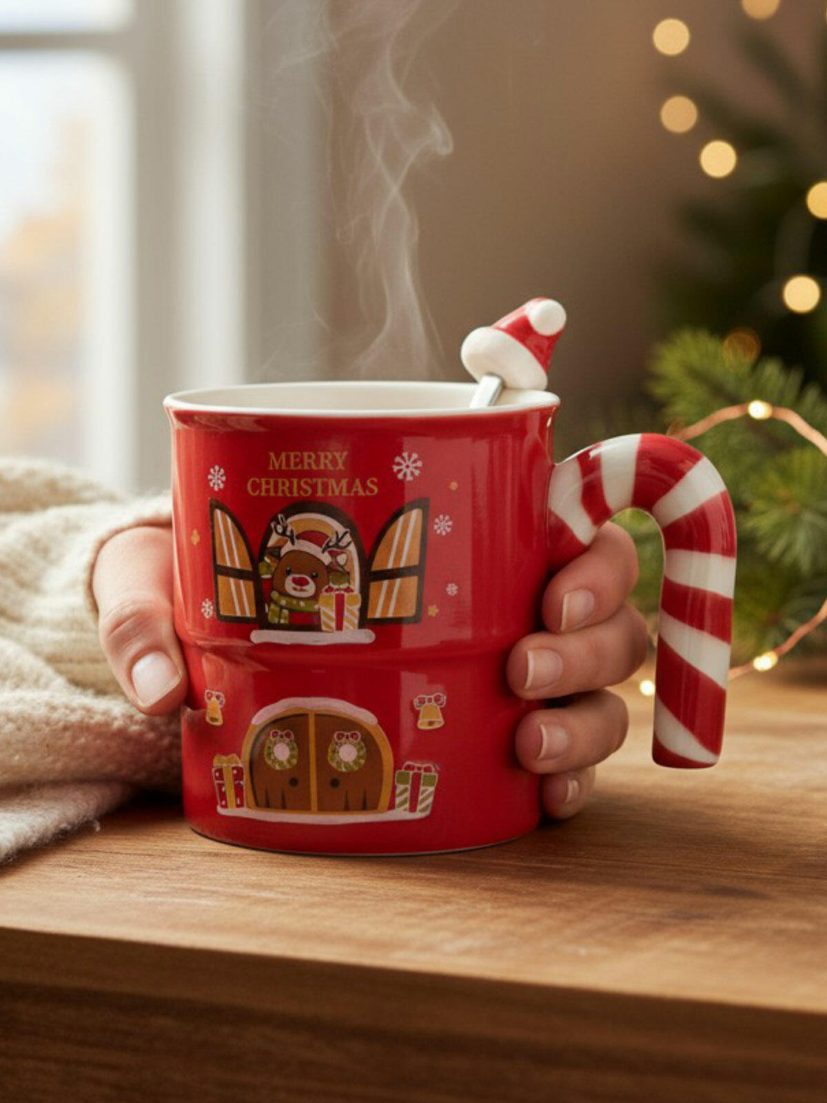 Wprowadź magię świąt do swojego domu dzięki naszemu uroczemu kubkowi ceramicznemu, ozdobionemu kolorowym nadrukiem z motywem chatki! ❄️ Jego wygodny uchwyt w kształcie cukrowej laski nie tylko przyciąga wzrok, ale również sprawia, że picie ulubionych napojów staje się czystą radością. 😍