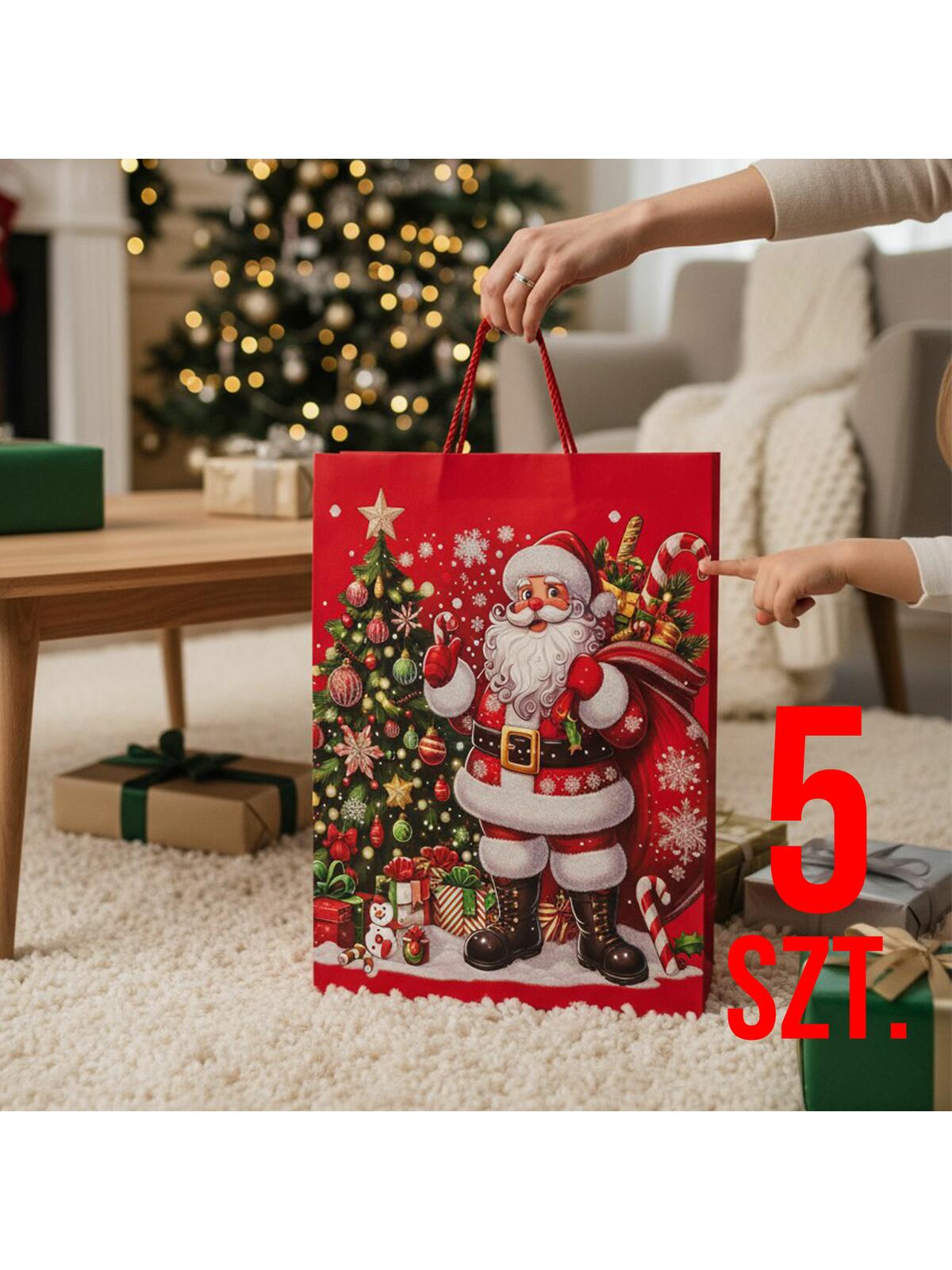 Przygotuj się na magiczne chwilę pełne radości! Nasz zestaw 5-ciu ozdobnych toreb prezentowych z motywem Świętego Mikołaja to idealny sposób, aby wyróżnić swoje upominki i sprawić, że będą one jeszcze bardziej wyjątkowe. 🌟 Wykonane z wysokiej jakości papieru, nie tylko przyciągną wzrok, ale także świetnie wpiszą się w bożonarodzeniowy klimat. 🎁