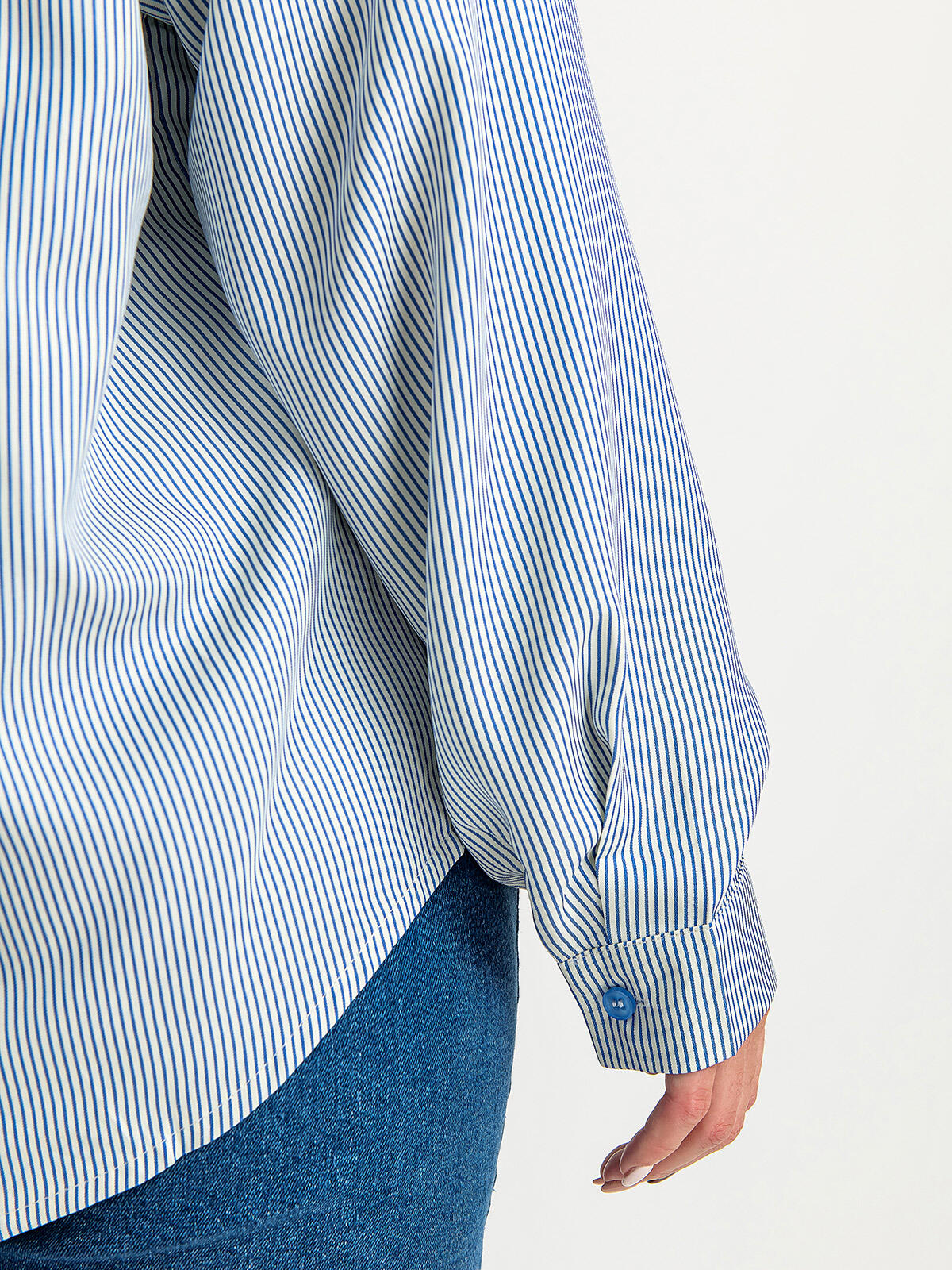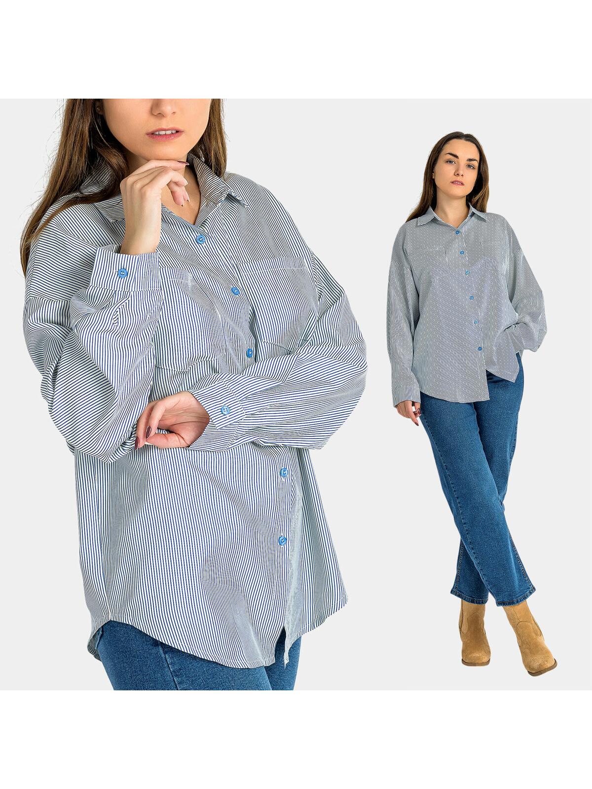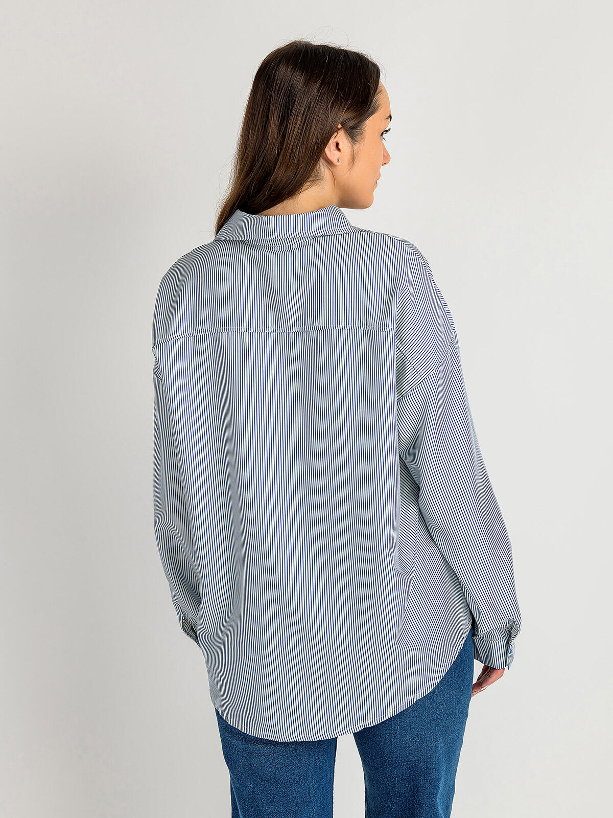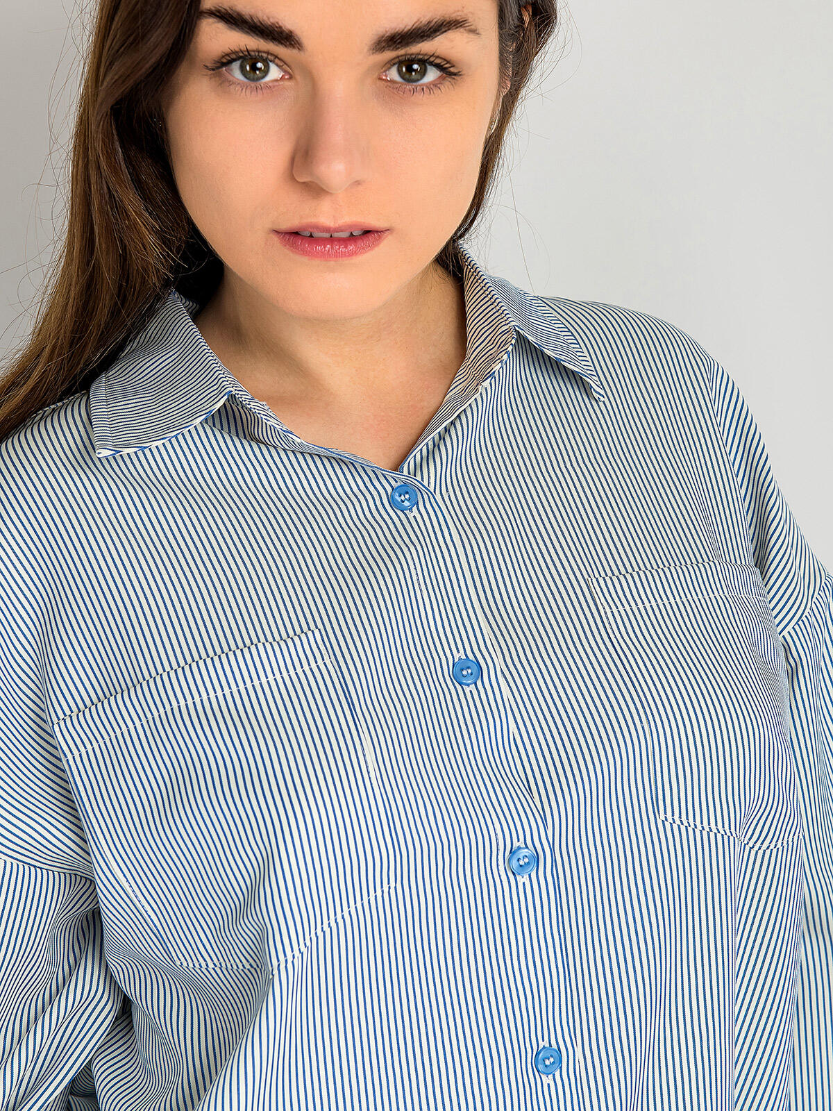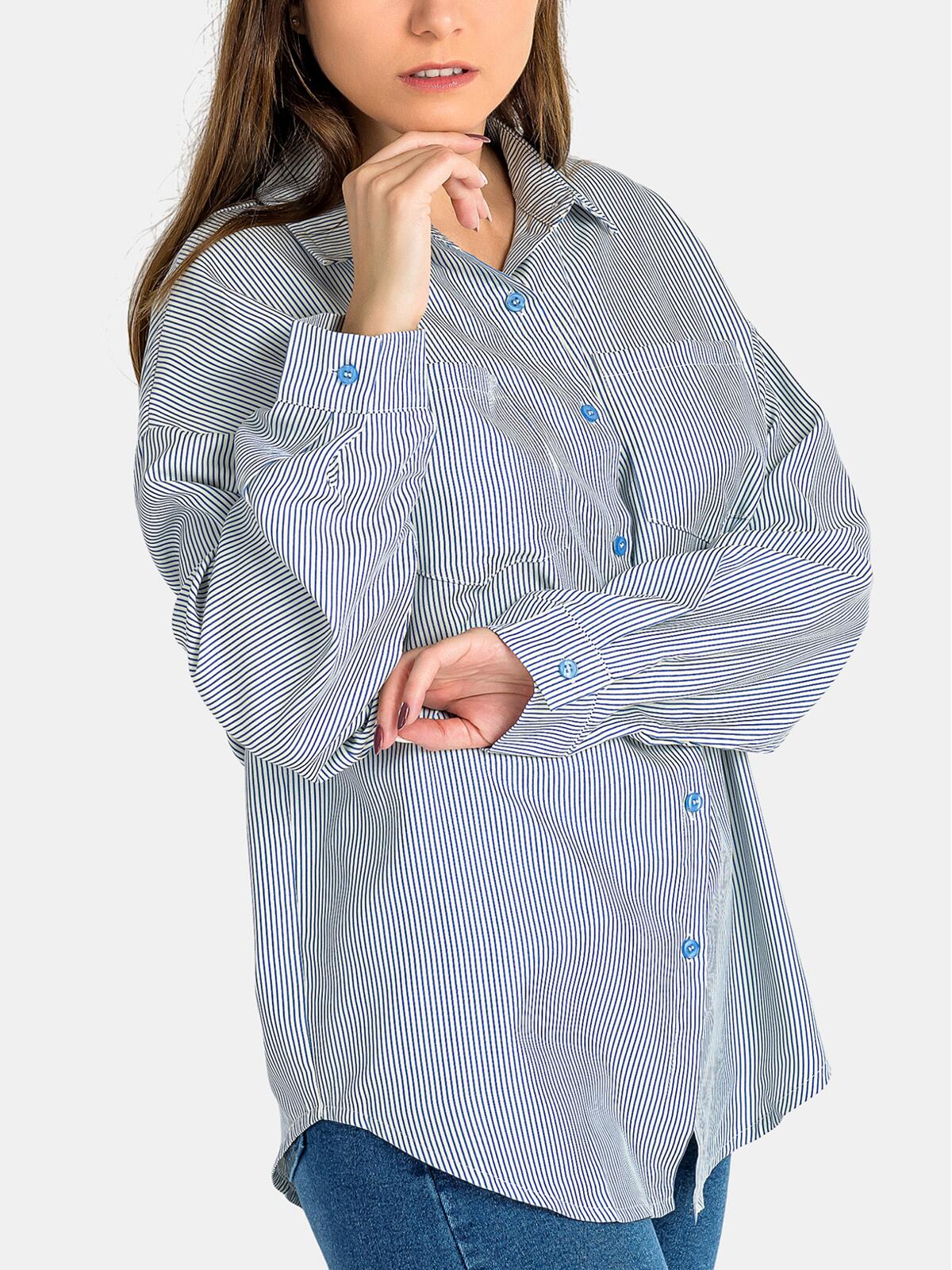 Przedstawiamy naszą wyjątkową koszulę w niebieskim odcieniu w białe pionowe paski, która doda szczypty elegancji do Twojej garderoby! Wykonana z najwyższej jakości materiałów z dużą zawartością bawełny, zapewnia wygodę i przepuszczalność powietrza, idealna na ciepłe dni. Luźny krój sprawia, że każdy ruch jest swobodny, a kołnierz oraz niebieskie guziki dodają jej oryginalnego charakteru!