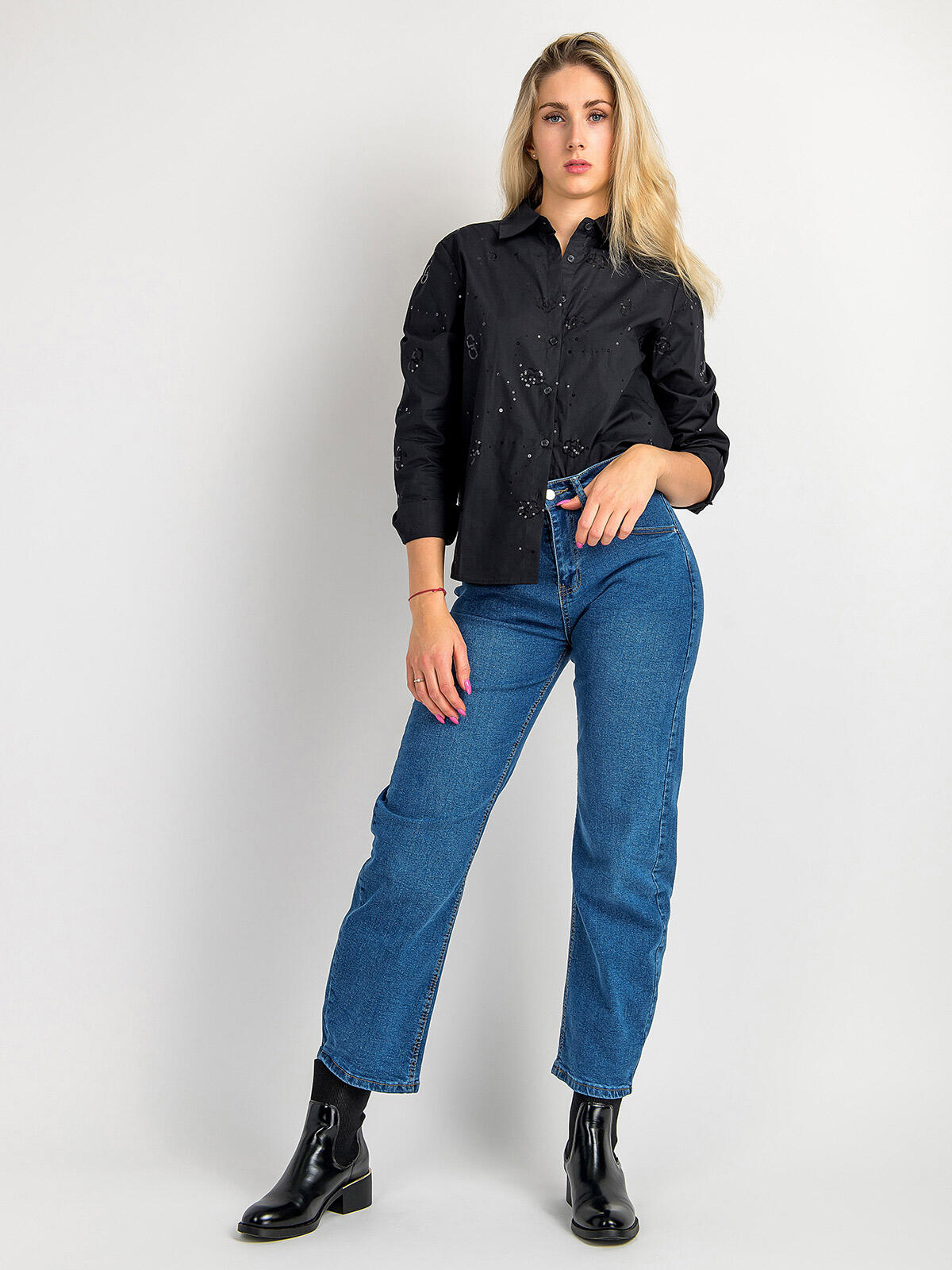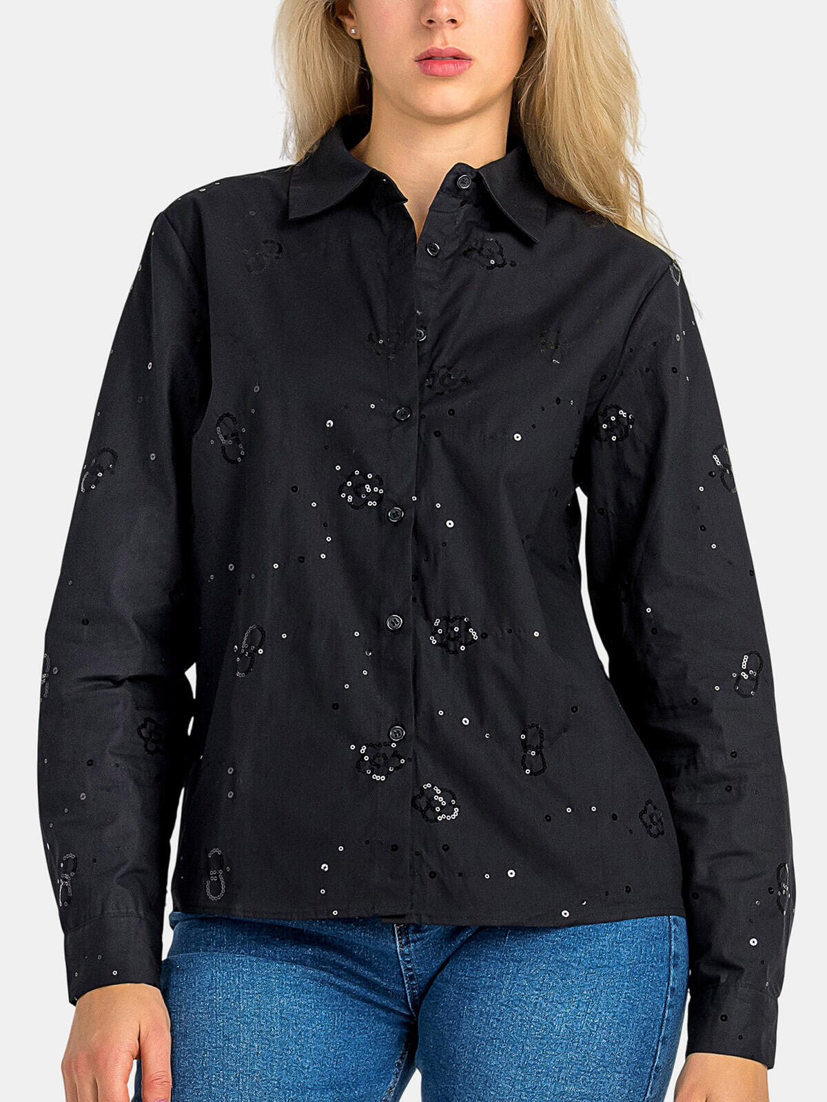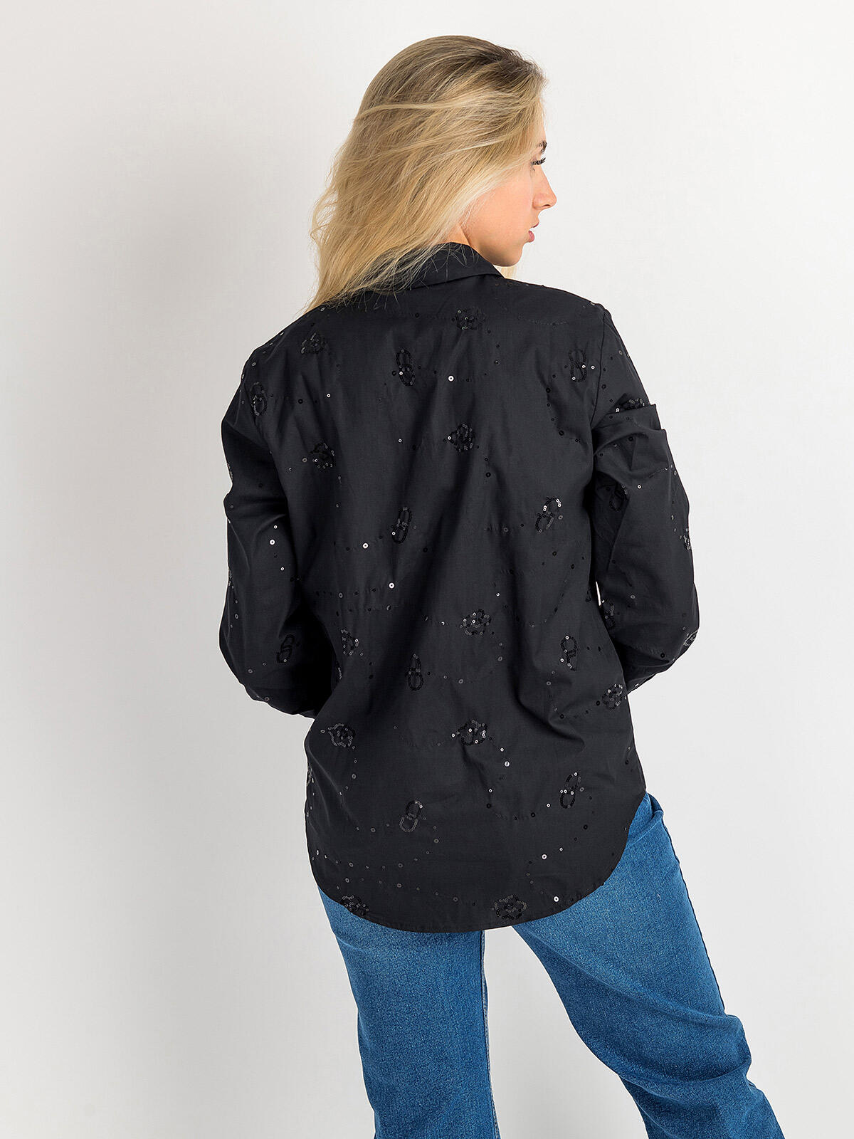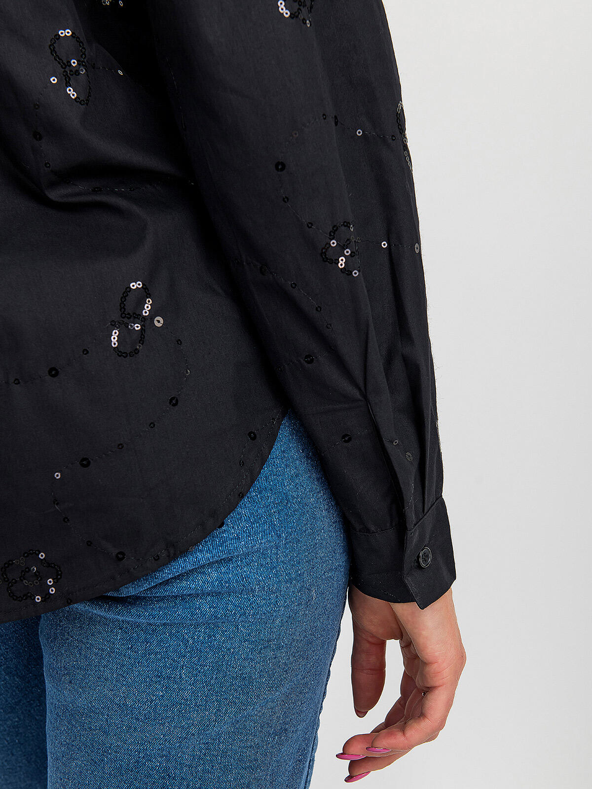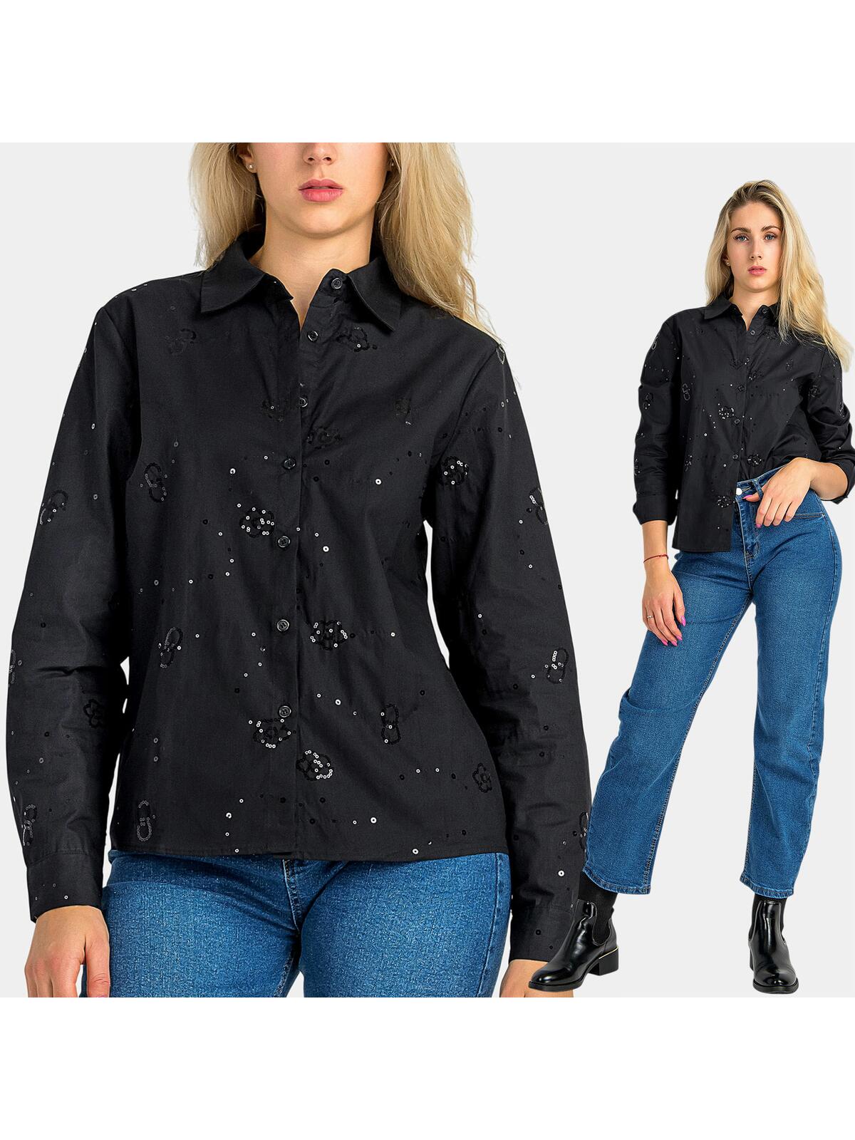 Oferujemy niezwykle elegancką czarną koszulę damską, która doda szyku każdej stylizacji. Wykonana z wysokiej jakości bawełny, zapewnia wygodę i przewiewność na co dzień. Koszula zapinana na guziki z klasycznym kołnierzykiem i długimi rękawami, zakończonymi mankietami, sprawdzi się zarówno w biurze, jak i na wieczornym wyjściu. Dodatkowe ozdobne cekinowe akcenty nadają jej wyjątkowego charakteru, czyniąc ją idealnym wyborem na każdą okazję. Nosząc ją, poczujesz się pewnie i stylowo! 💖