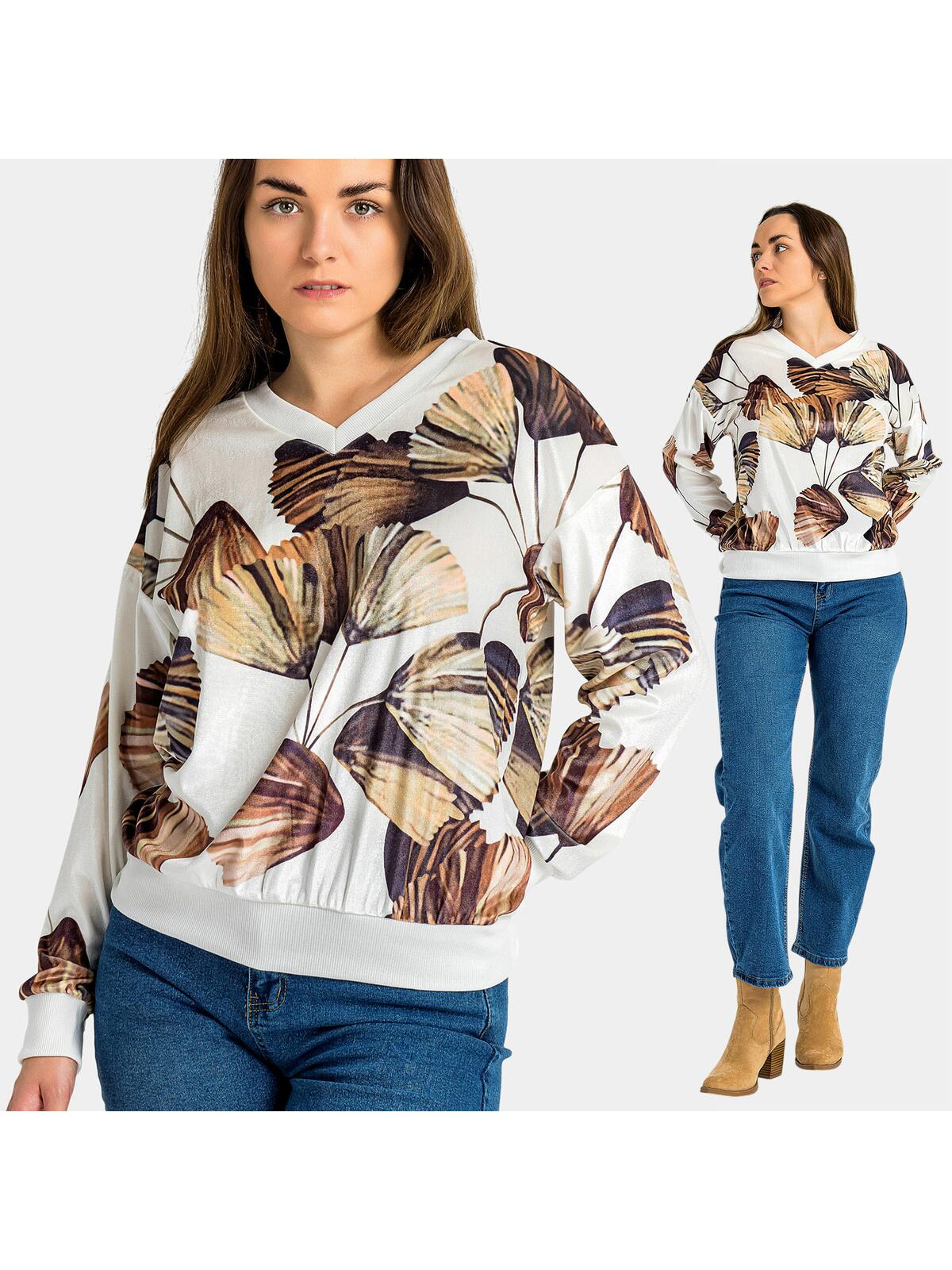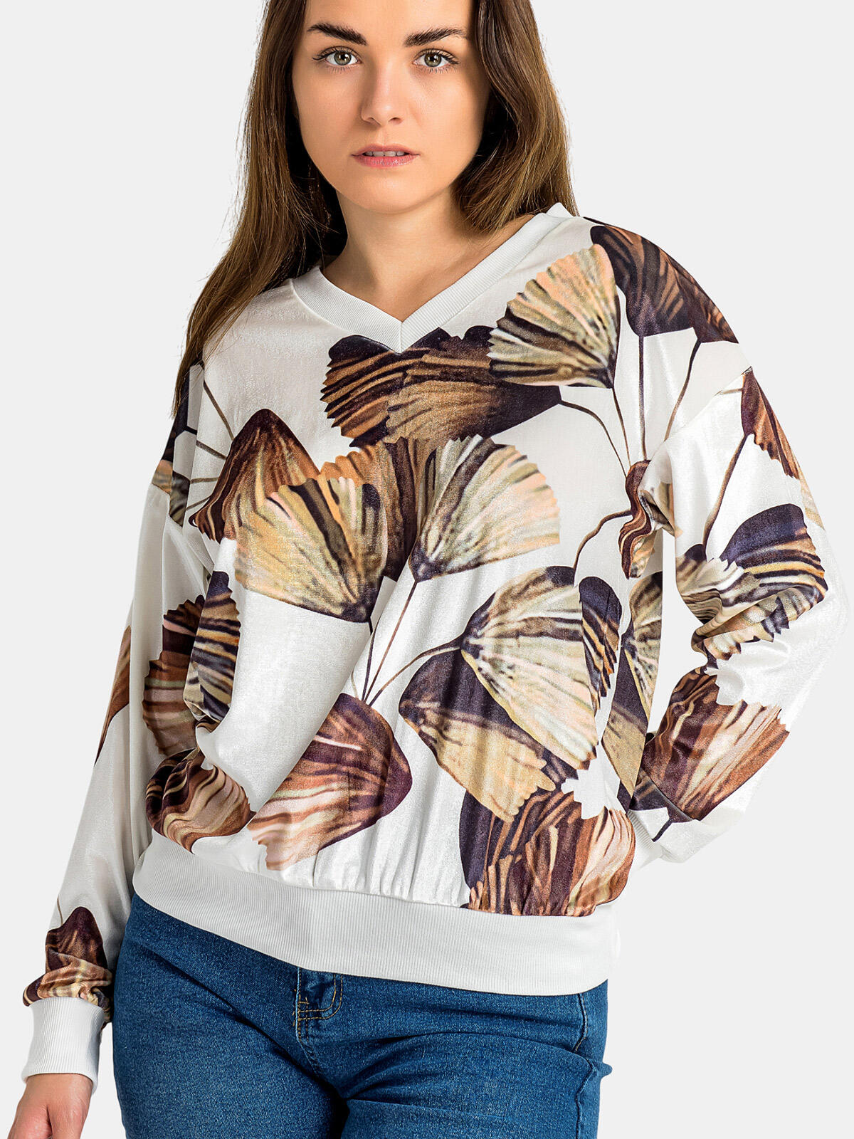 Przyciągnij spojrzenia i wyróżnij się z tłumu dzięki naszej modnej bluzie ze wzorem, która łączy w sobie styl i komfort! 🌟 Jej dekolt w serek i luźny krój sprawiają, że jest niezastąpiona w chłodniejsze dni. Długie rękawy zakończone ściągaczami oraz dół bluzy również zakończony ściągaczem zapewniają idealne dopasowanie, a jednocześnie swobodę ruchów. Ta bluza doskonale wpisuje się w jesienny klimat, dodając Twoim stylizacjom wyjątkowego charakteru. 🍁