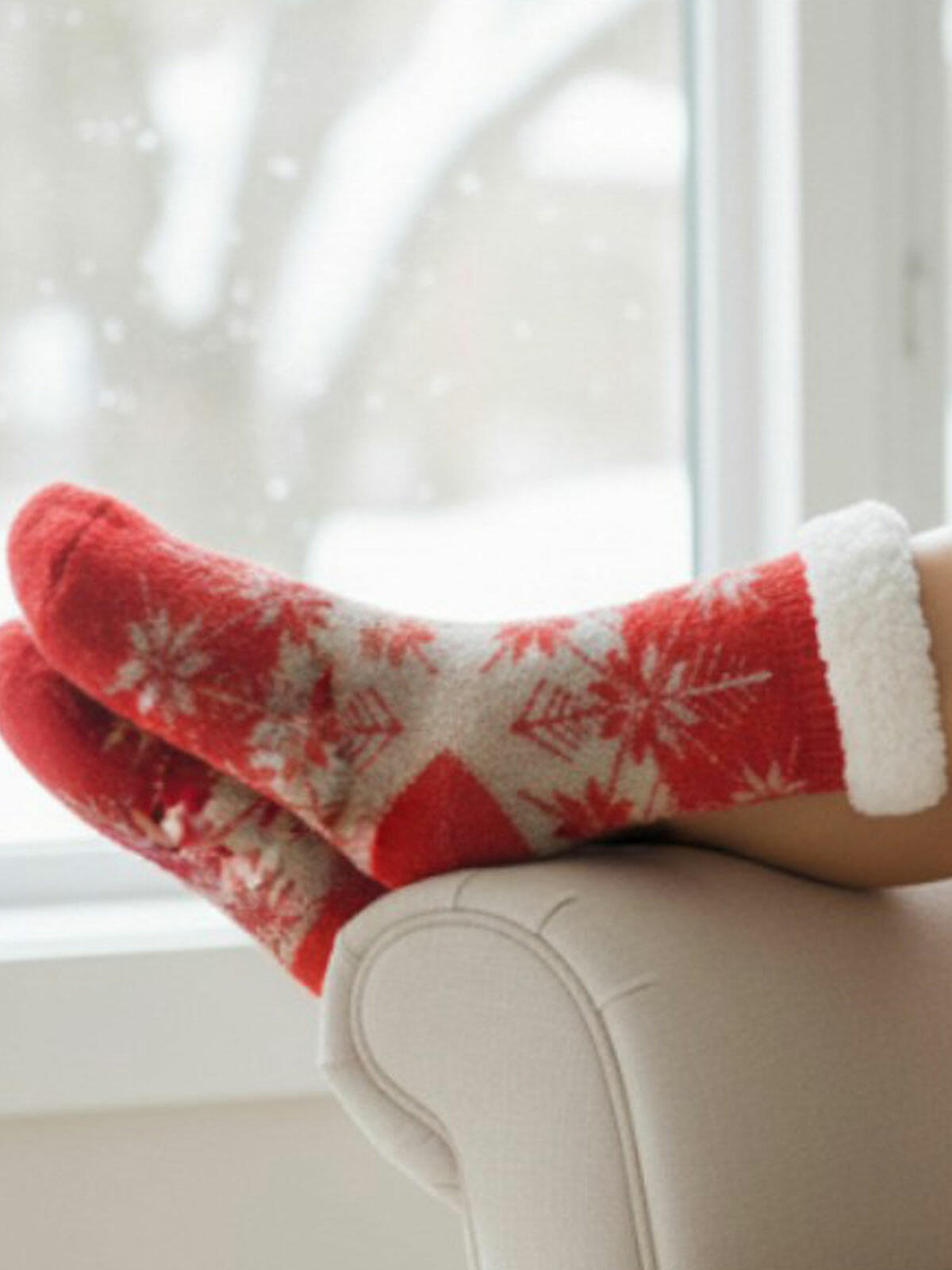 🧶 Uroczy, świąteczny design – Każda para jest ozdobiona subtelnym wzorem śnieżynek, wprowadzającym magiczny, zimowy nastrój. Wybierz swój ulubiony kolor spośród dostępnych opcji: klasyczny beżowy, delikatny róż, świąteczna czerwień lub elegancka czerń i biel. Te skarpety to doskonały dodatek do każdej zimowej stylizacji!