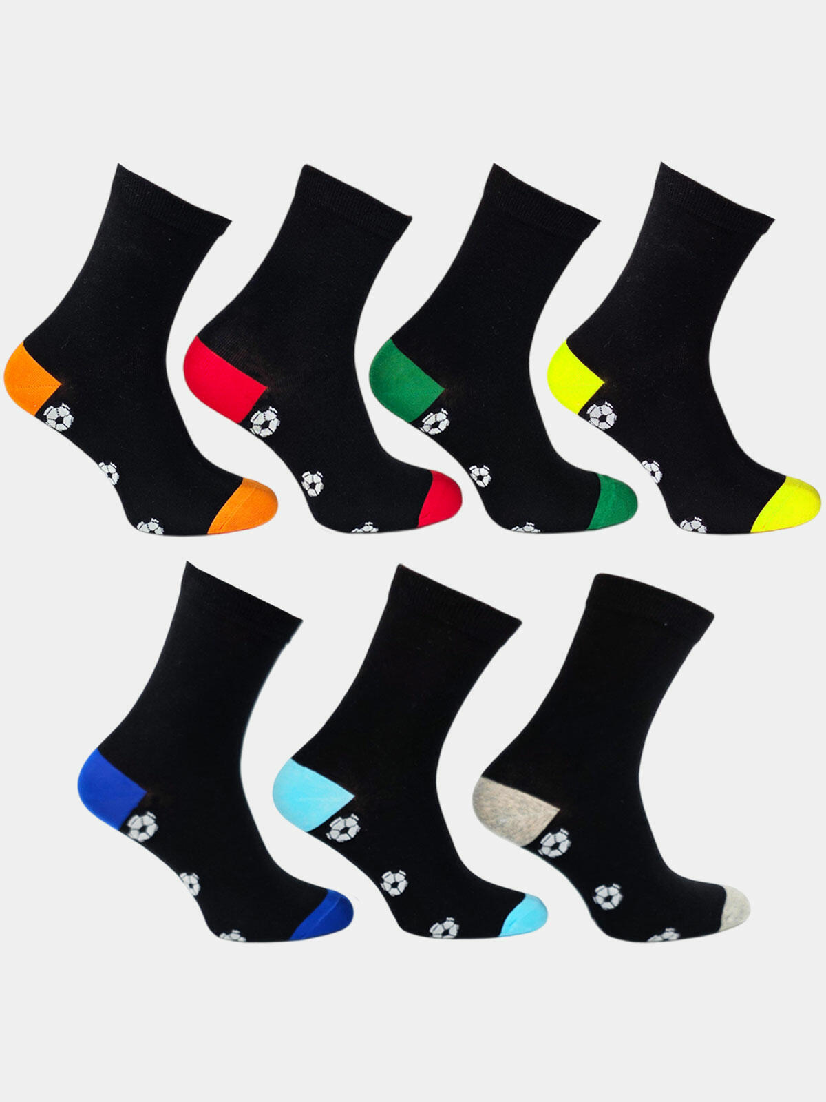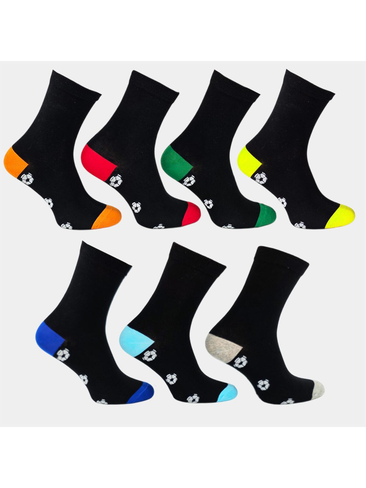 Prezentujemy chłopięce skarpetki bawełniane w praktycznym 7-paku, które łączą w sobie komfort, styl i sportowy charakter! Te wysokie skarpetki zapewniają doskonałe przyleganie do stopy, dzięki elastycznemu ściągaczowi oraz starannie wyprofilowanemu krojowi. W każdej parze dominują klasyczne czarne kolory, a zapiętki i palce ozdobione są wesołymi kolorami i wzorem piłki nożnej, co sprawia, że będą idealnym dodatkiem do każdej stylizacji. 🖤💙💚💛