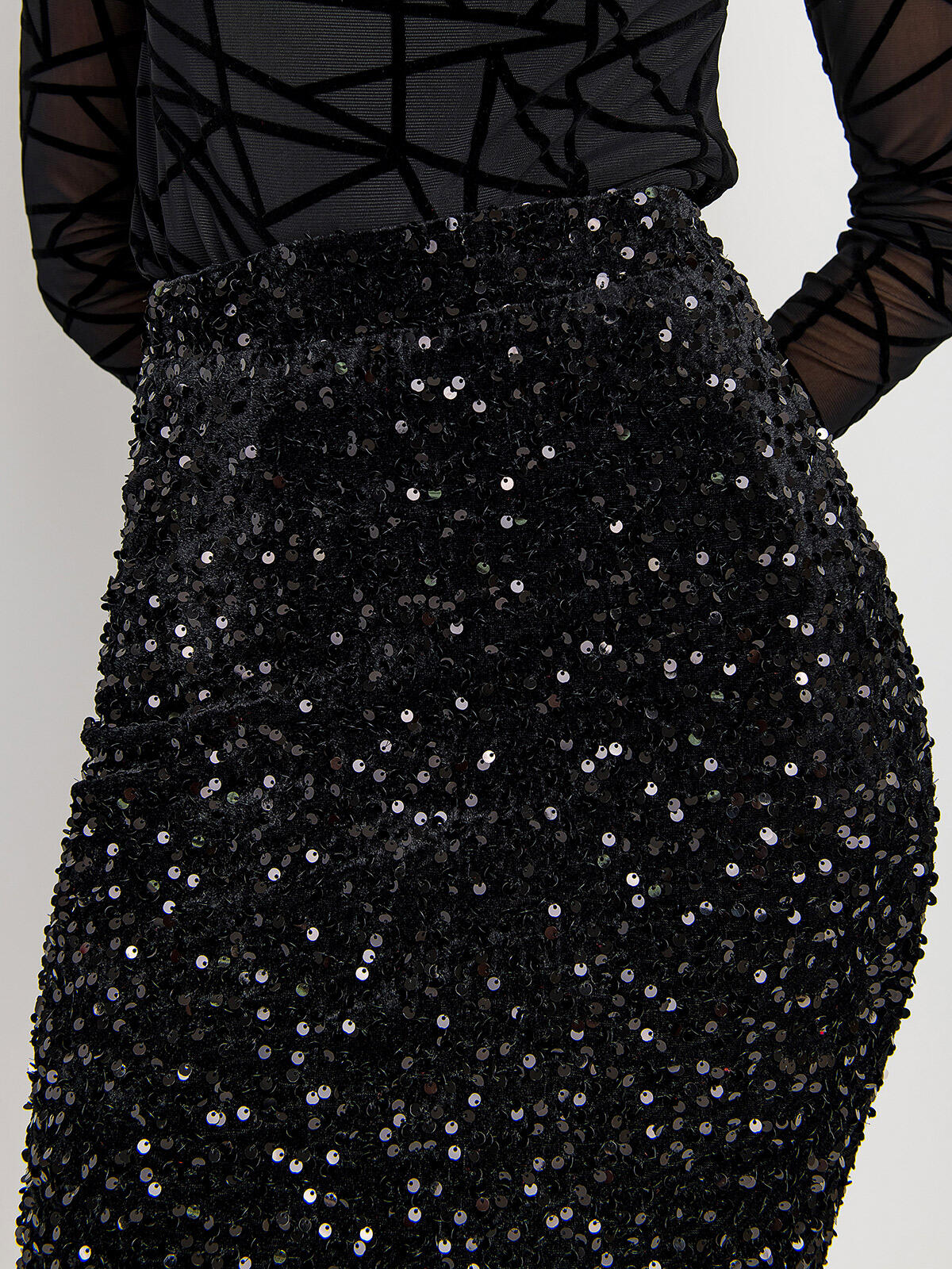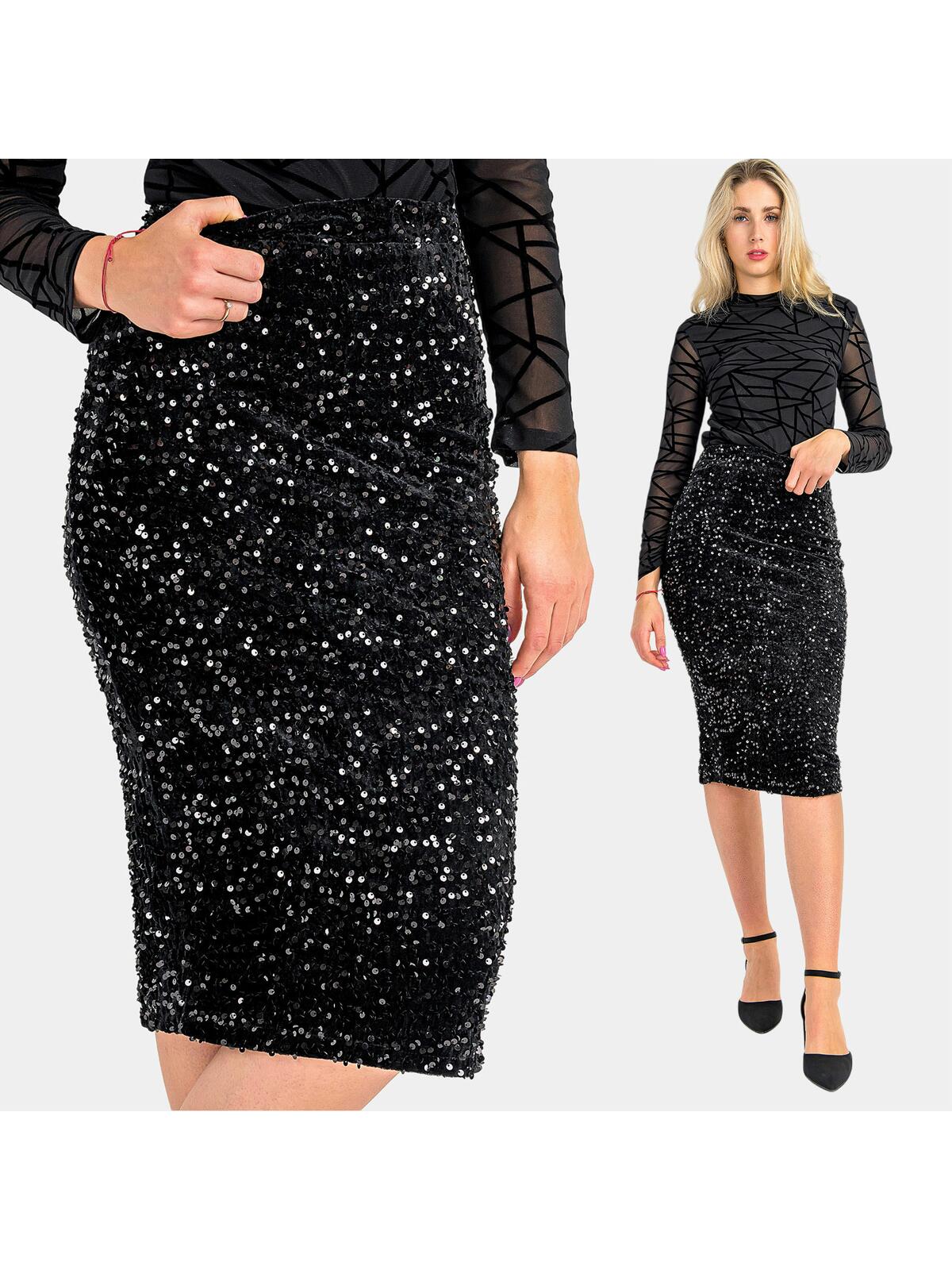 Rozświetl każdy wieczór stylizacją, która podkreśli Twoją wyjątkowość. Nasza cekinowa spódnica o długości midi w intensywnym czarnym kolorze to idealny wybór na każdą wyjątkową okazję, zwłaszcza na święta czy Sylwestra. Jej wysoki stan i dopasowany fason pięknie podkreślają sylwetkę, a eleganckie welurowe wykończenie dodaje całości luksusowego charakteru. Błyszcząca powierzchnia przyciąga spojrzenia i sprawia, że poczujesz się jak gwiazda wieczoru. Zapięcie na zamek z tyłu zapewnia wygodę przy zakładaniu, a efektowne rozcięcie dodaje elegancji i oryginalności, czyniąc spódnicę naprawdę wyjątkową.🔥