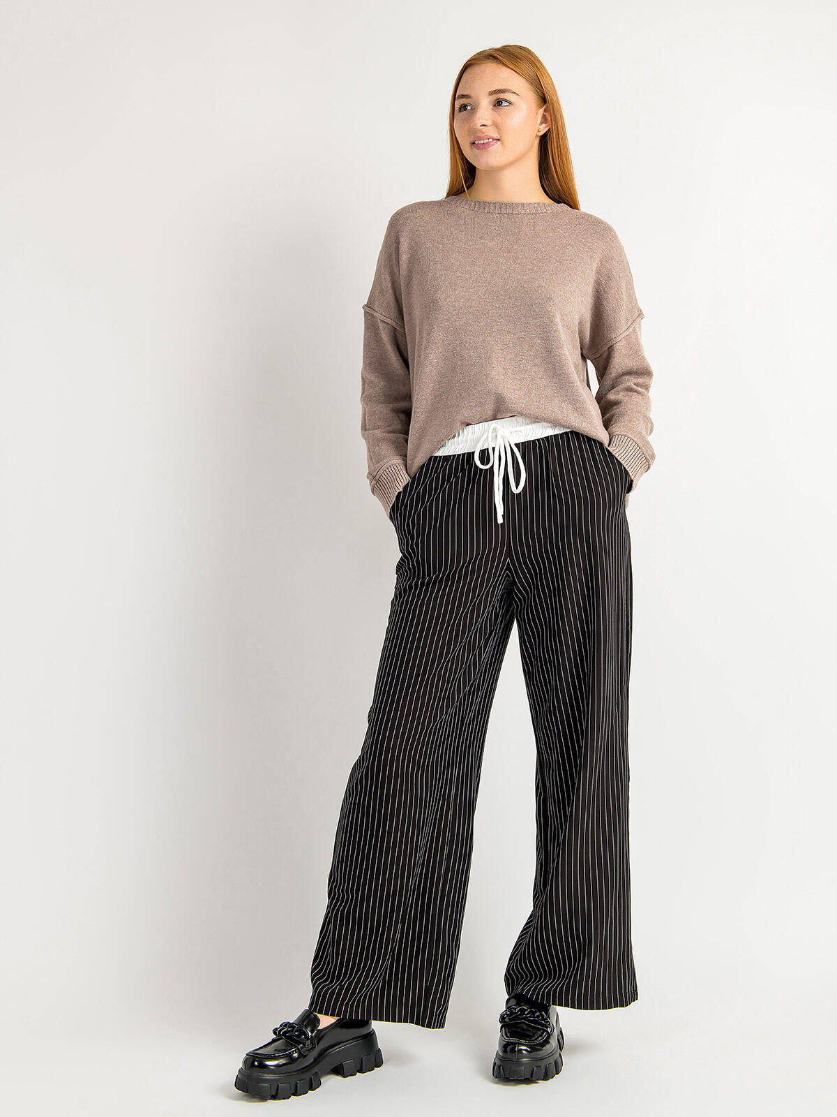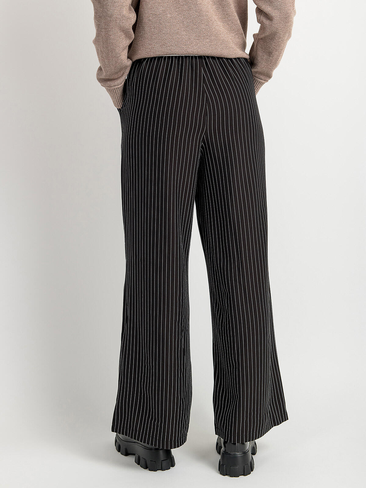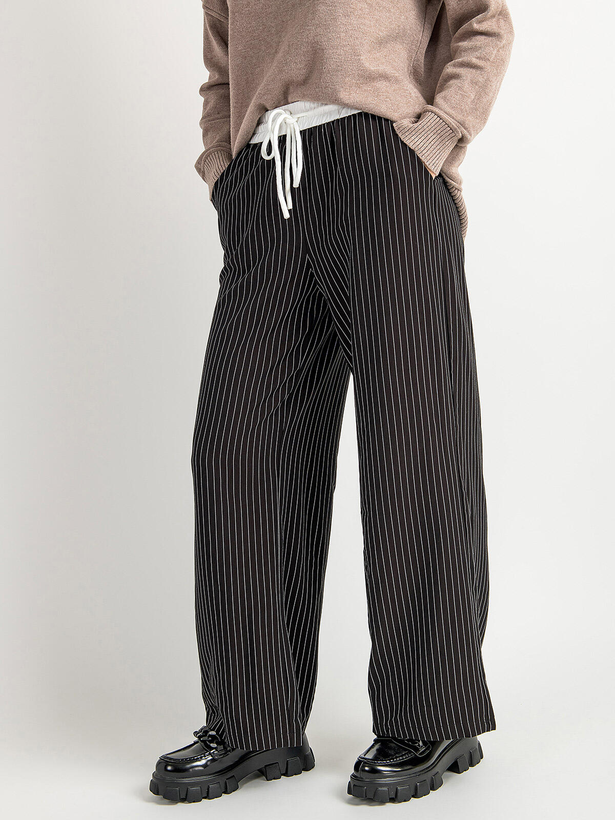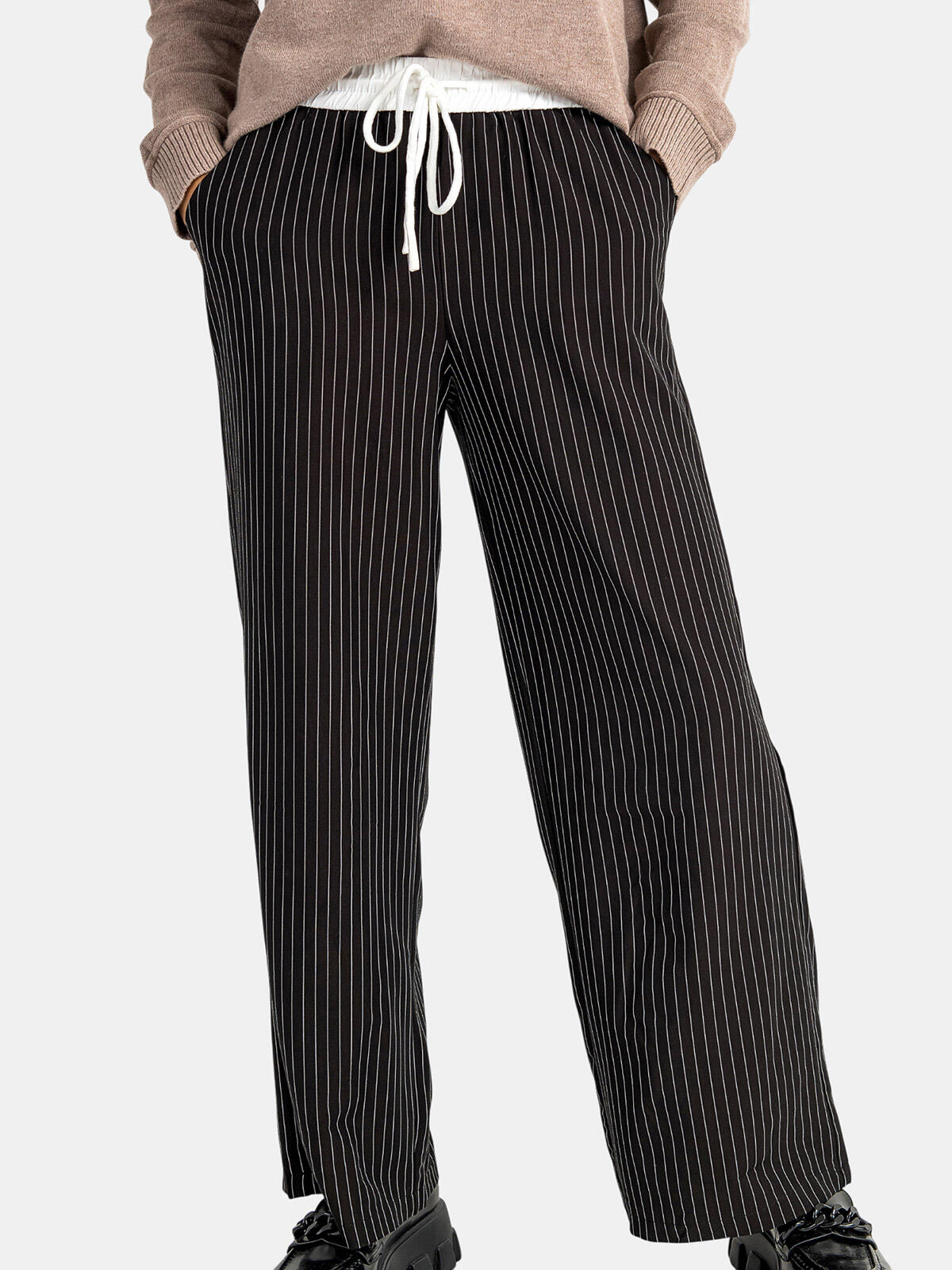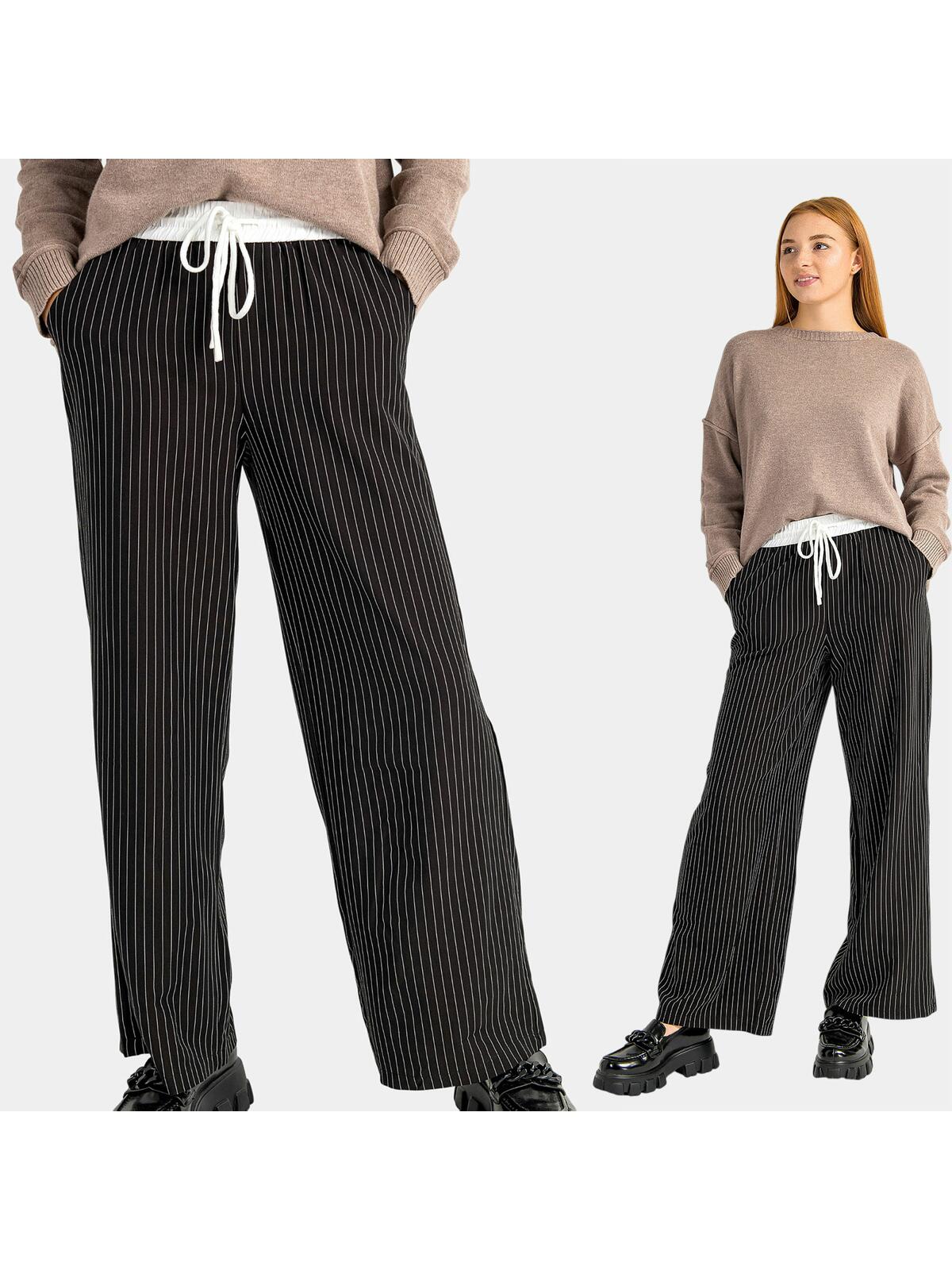 Przygotuj się na modowy hit tego sezonu! Nasze szerokie spodnie damskie w kontrastowe, wąskie paski to idealne połączenie komfortu i stylu. Dzięki swobodnemu krojowi oraz elastycznej talii z wiązaniem, te spodnie dopasowują się do Twojej sylwetki, dając Ci pełną swobodę ruchów. Bocznie umieszczone kieszenie dodają praktyczności, a klasyczny czarny kolor sprawia, że są idealne zarówno do eleganckich, jak i casualowych stylizacji. 🌈
