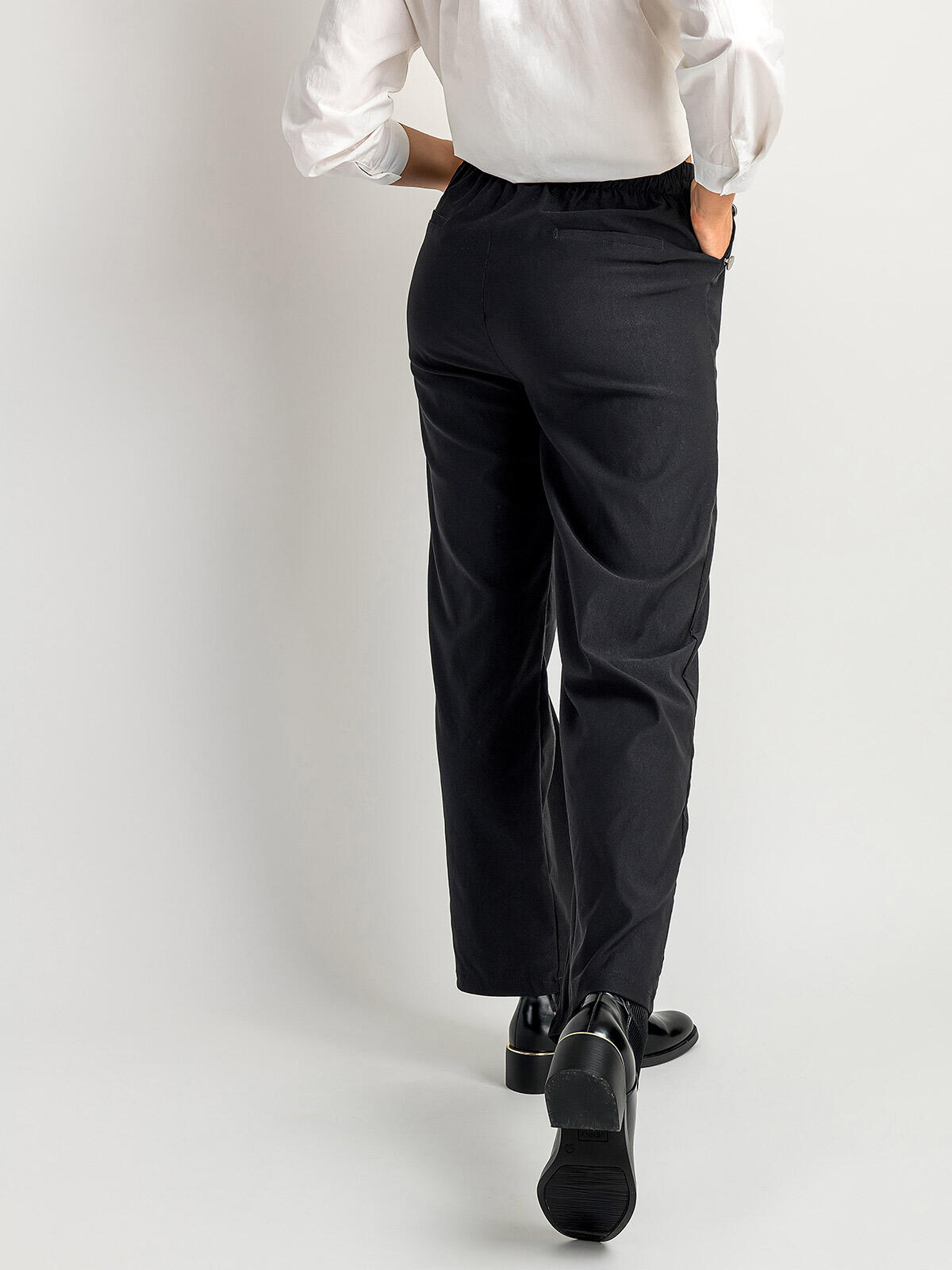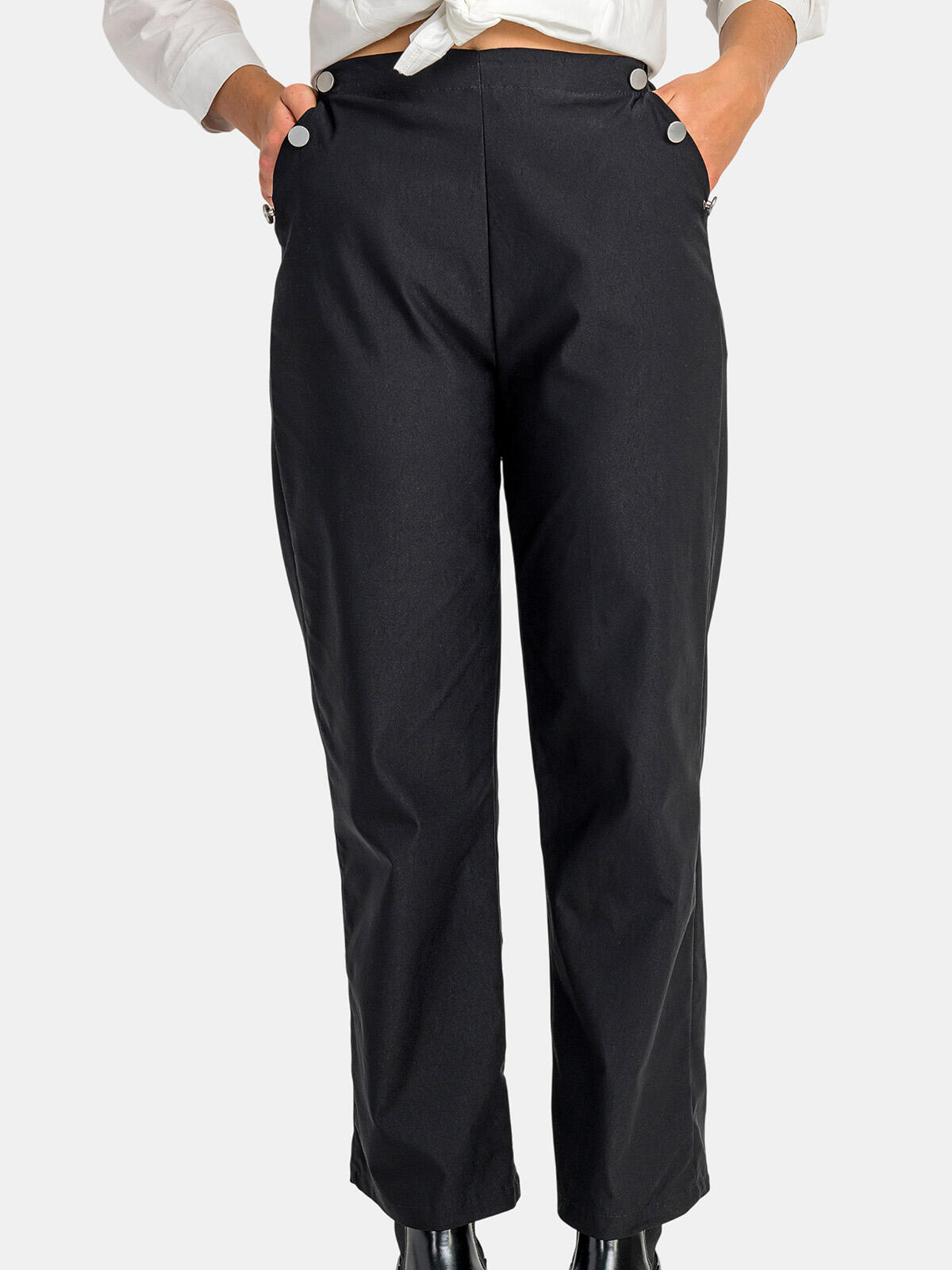 Poznaj naszą najnowszą propozycję – czarne spodnie z praktycznymi kieszeniami, które łączą w sobie styl i komfort! Idealne na co dzień, gwarantują wygodne dopasowanie w talii dzięki elastycznej gumce z tyłu. 😊
