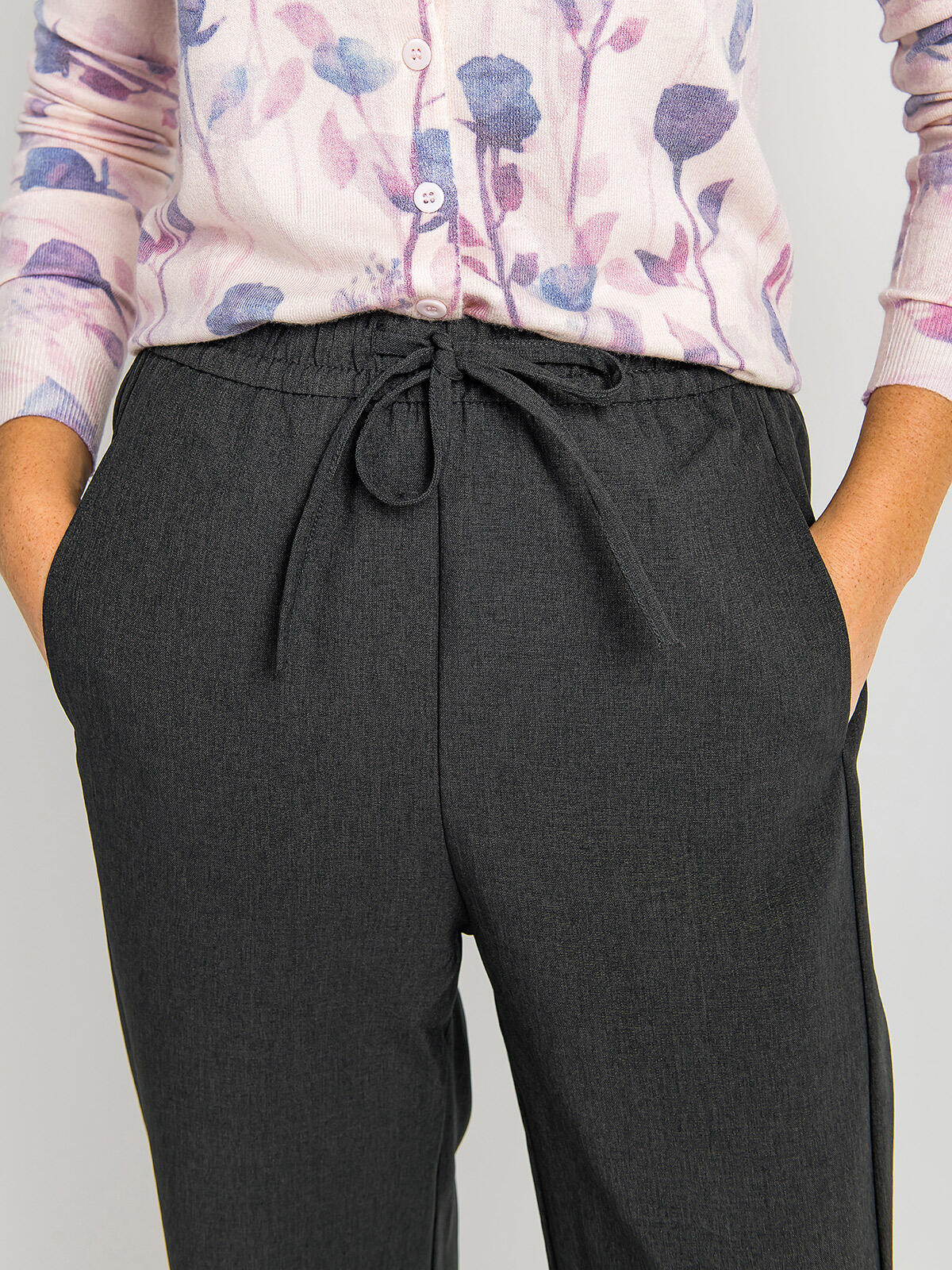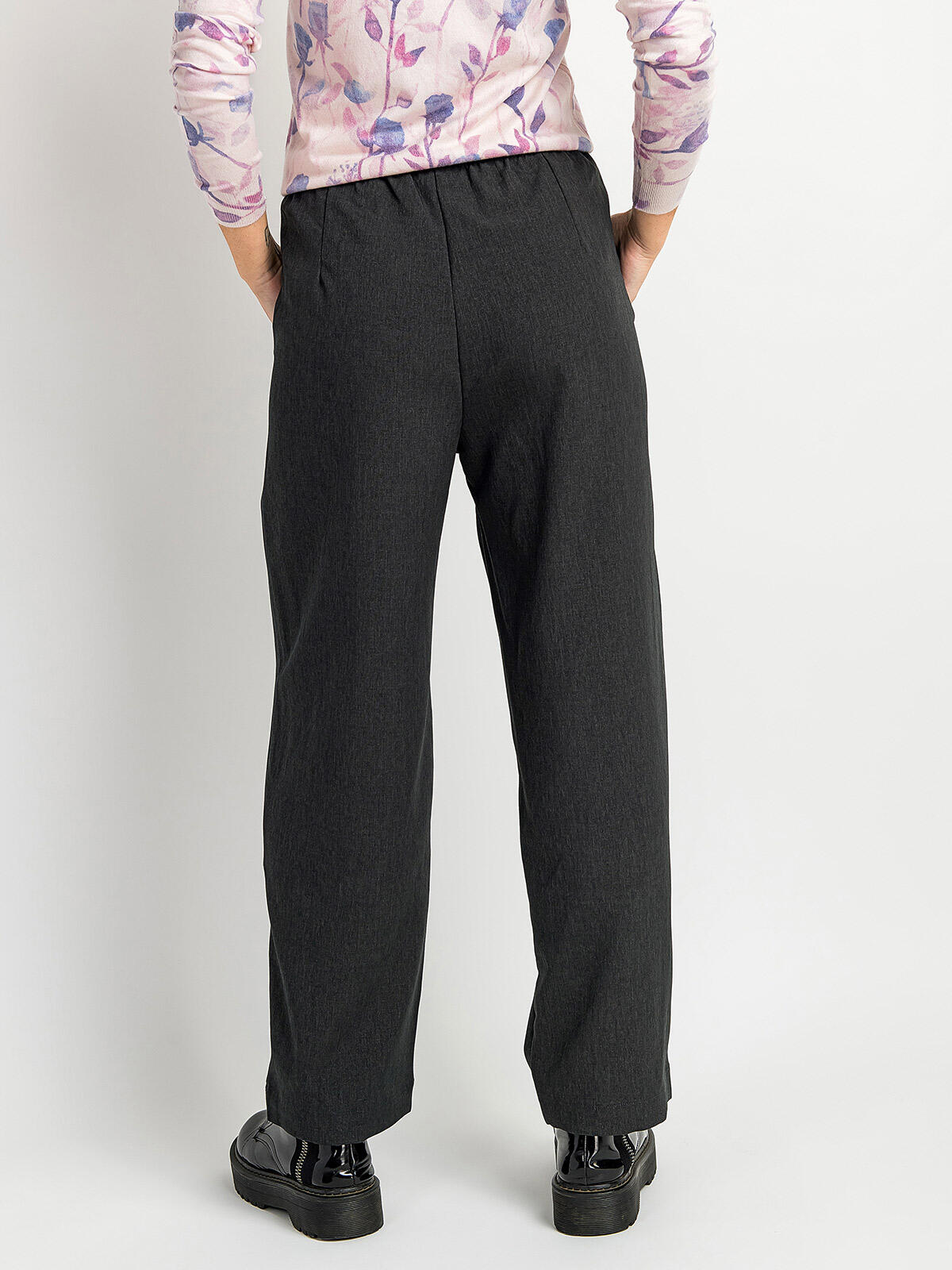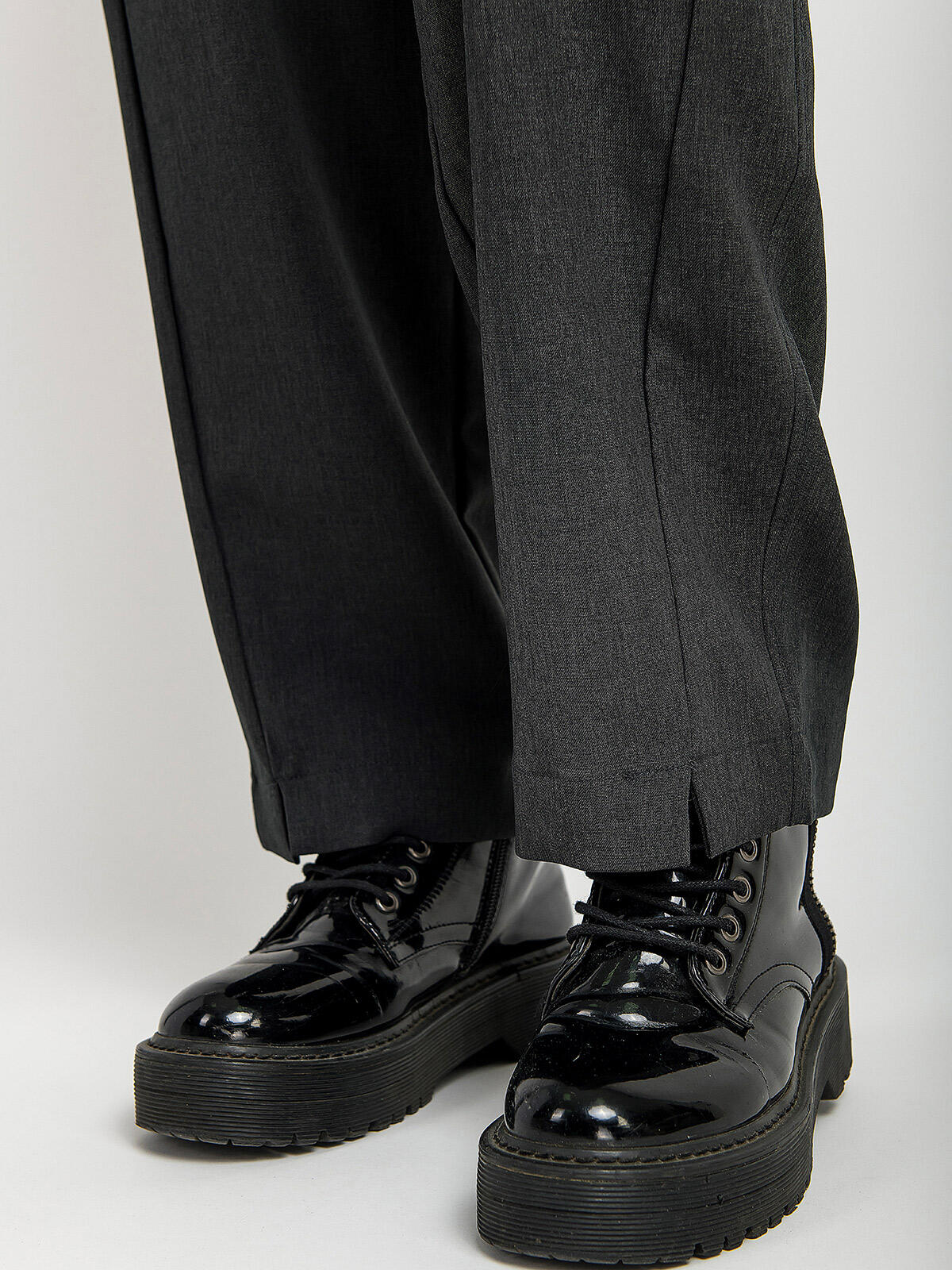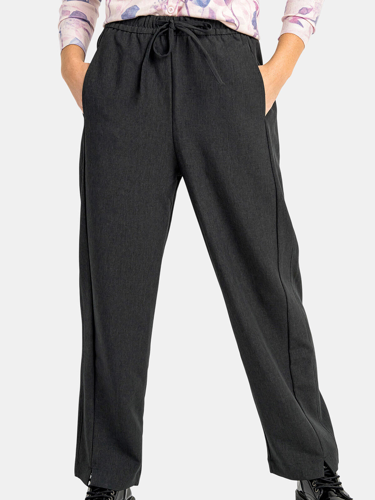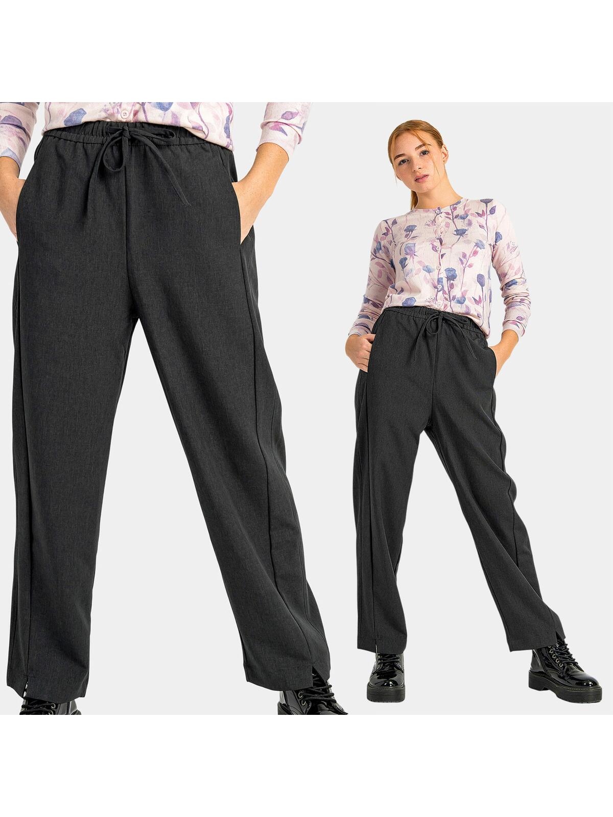 Odkryj naszą nową kolekcję spodni w kolorze grafitowym! Dzięki starannie dobranej domieszce bawełny, te spodnie są nie tylko wygodne, ale także przewiewne, co czyni je idealnym wyborem na każdą porę roku. Regulacja w talii za pomocą sznurka pozwala na perfekcyjne dopasowanie do Twojej sylwetki. Praktyczne kieszenie z przodu dodają funkcjonalności, a długie, szerokie nogawki zakończone rozcięciem z boku podkreślają nowoczesny styl. 🖤