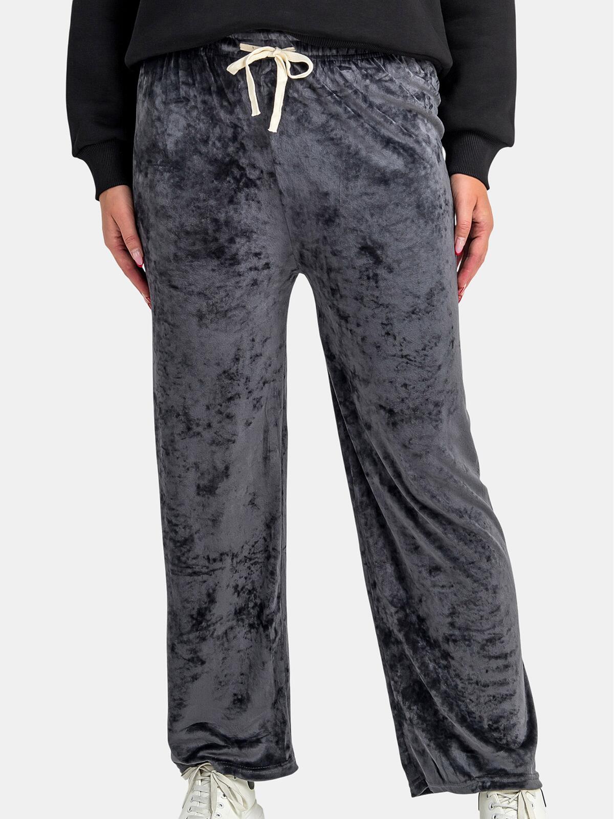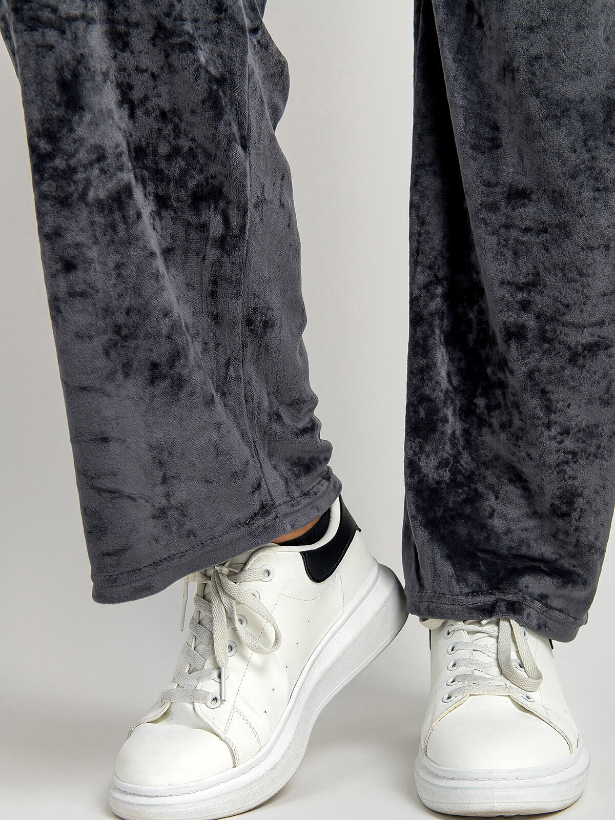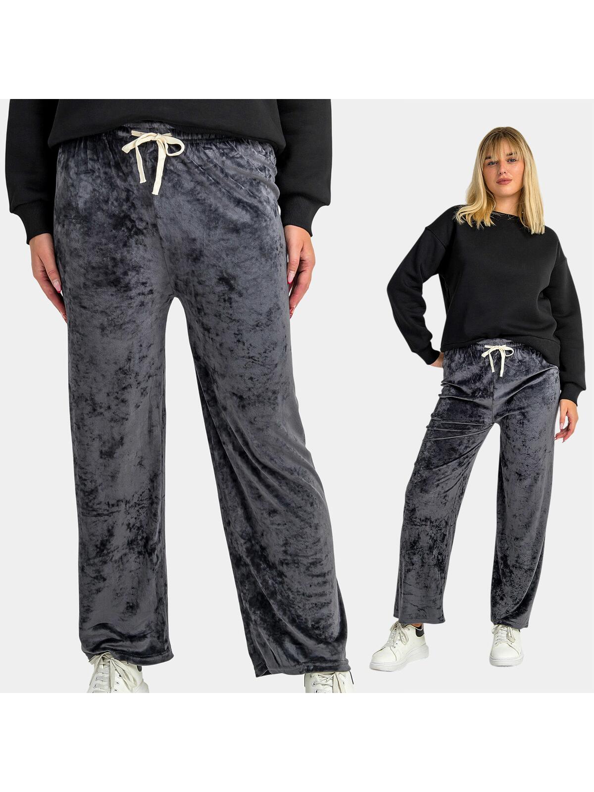 Odkryj nowy wymiar komfortu! Te zjawiskowe spodnie welurowe to połączenie elegancji i luzu, które idealnie wpasuje się w Twoją garderobę. Wykonane z miękkiego materiału o welurowym wykończeniu, przyjemnego w dotyku materiału, zapewnią Ci uczucie luksusu podczas każdej chwili. 😊 Stylowy grafitowy kolor to prawdziwy hit sezonu, który doskonale komponuje się z różnorodnymi stylizacjami. Długie, szerokie nogawki i luźny krój gwarantują swobodę ruchów i wygodę noszenia, zarówno w domowym zaciszu, jak i na spacerze po mieście. ✨
