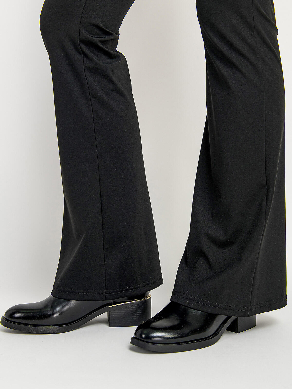 Poczuj się pewnie i stylowo w naszych czarnych spodniach flare! 🌟 Te elastyczne spodnie, stworzone dla pełnej swobody ruchów, pięknie podkreślają sylwetkę, a oryginalny pas na zakładkę nadaje im wyjątkowego charakteru. Dzięki długim nogawkom, które przylegają u góry, a luźniejszym u dołu, te spodnie będą idealnym dopełnieniem każdej jesiennej stylizacji. 🍂✨