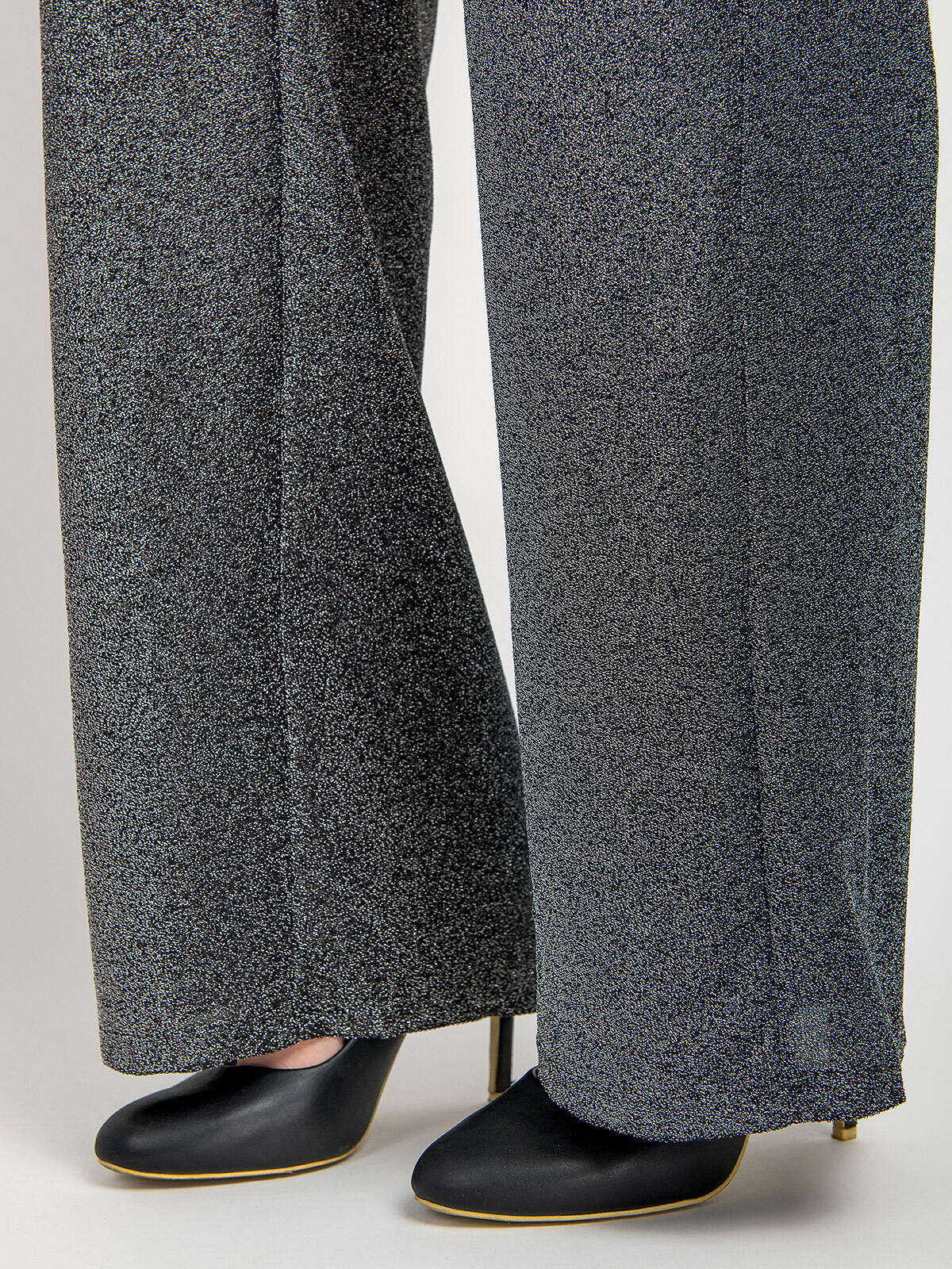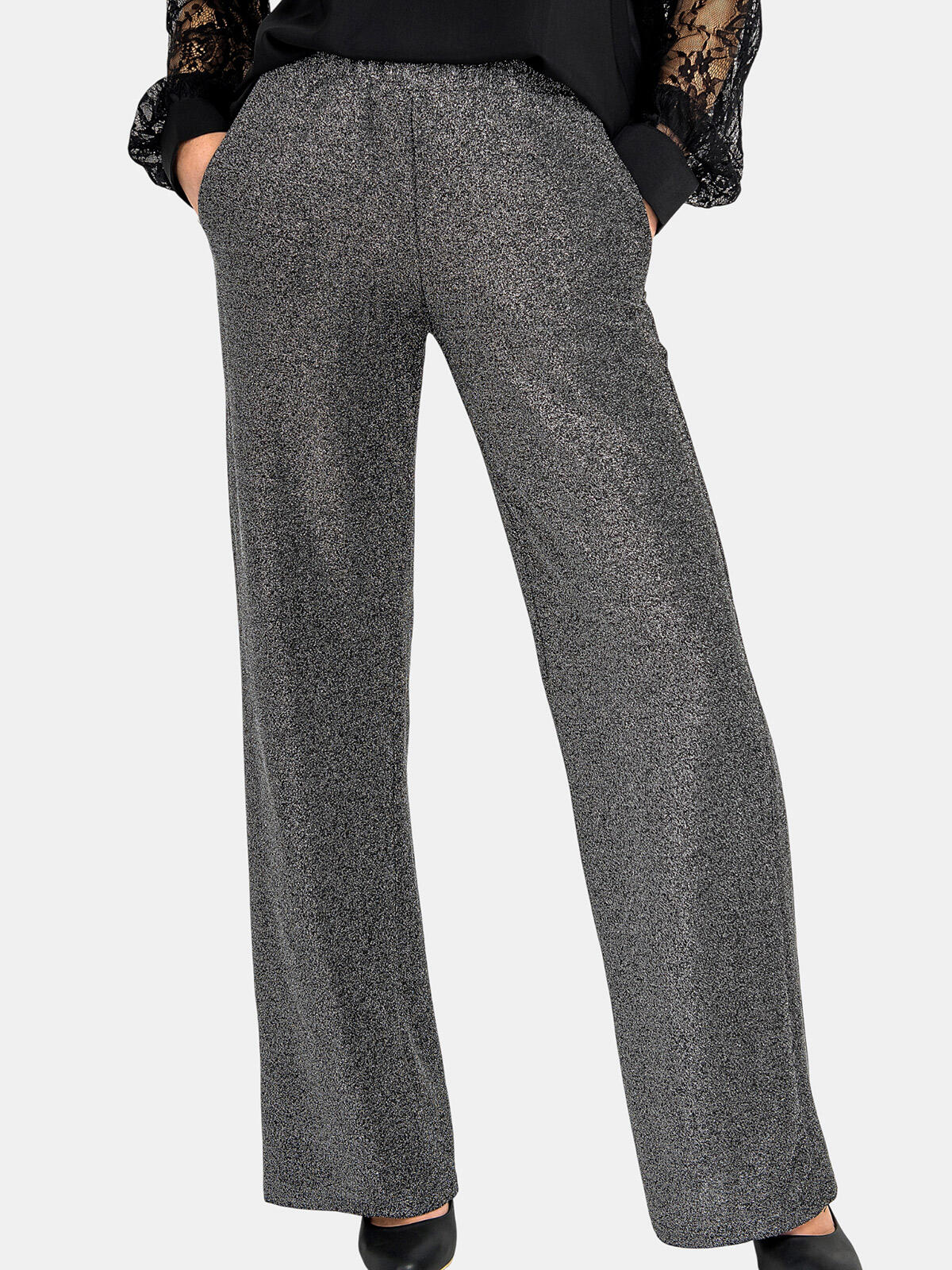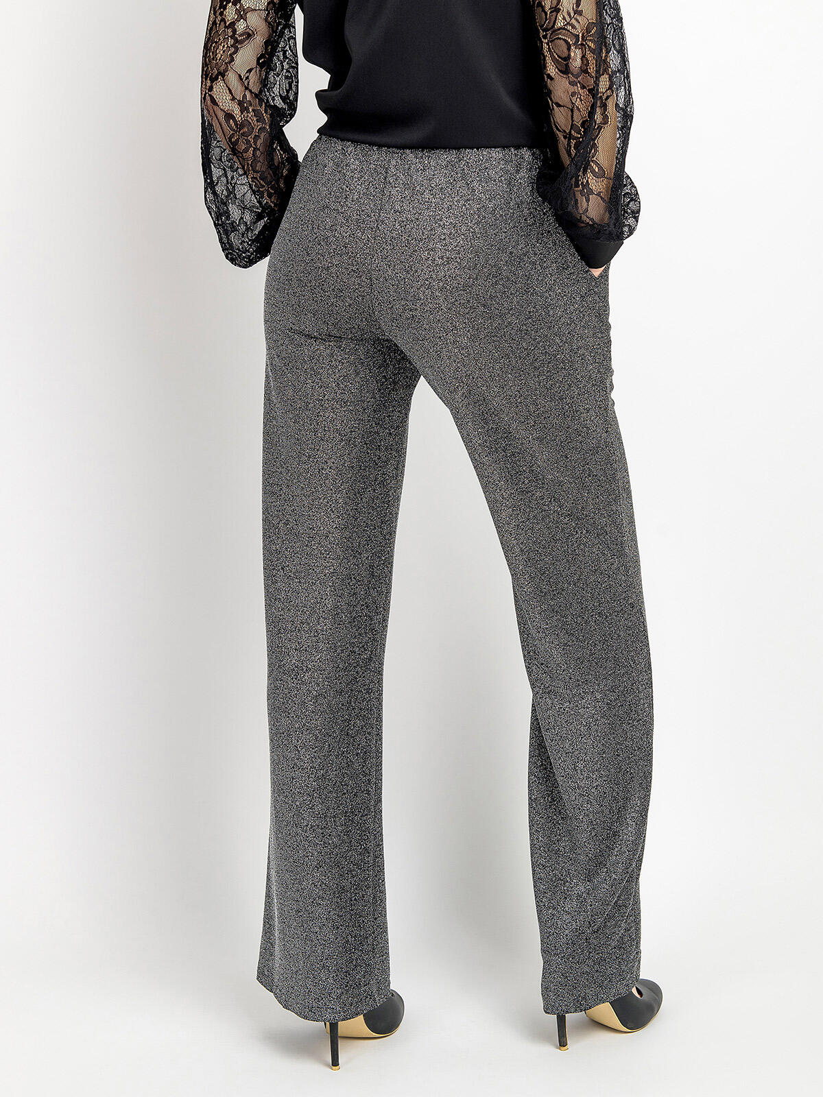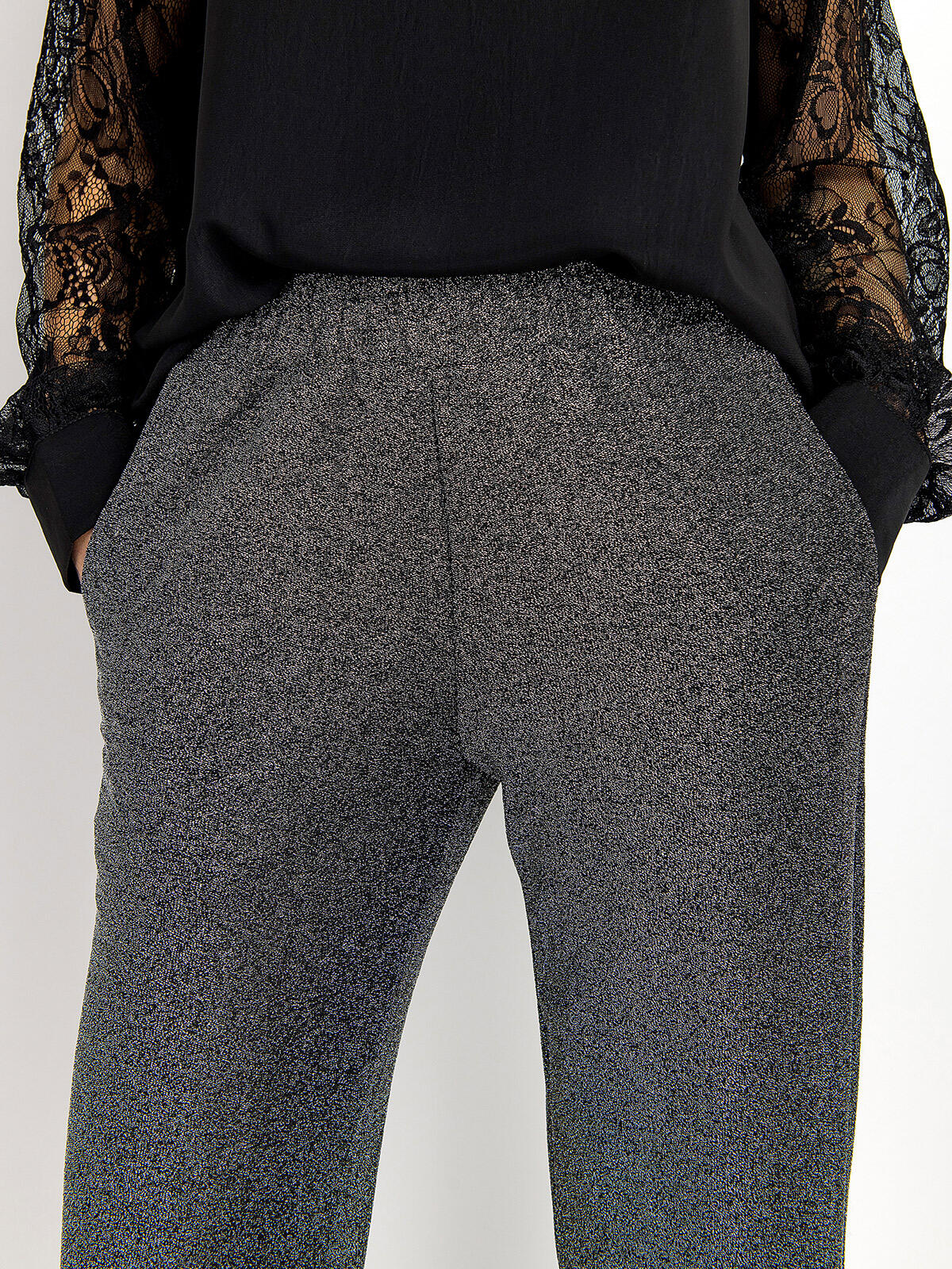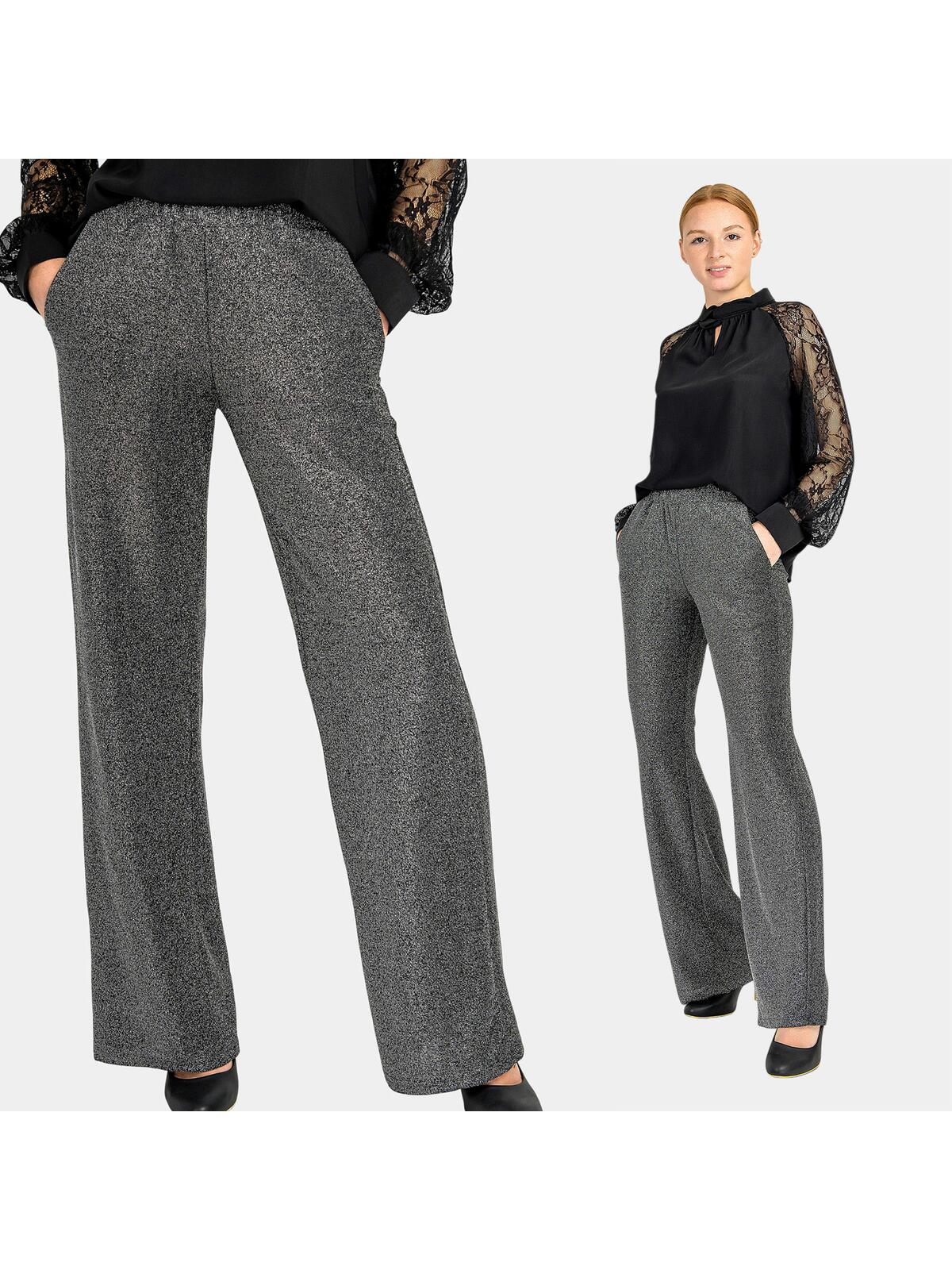 Odkryj nasze wyjątkowe czarne spodnie damskie, które łączą w sobie elegancję, styl i wygodę! Wykonane z luksusowego materiału z błyszczącą nitką, te spodnie przyciągają wzrok i dodają blasku każdej stylizacji. Dzięki elastycznej gumce w talii świetnie dopasowują się do sylwetki, zapewniając maksymalny komfort przez cały dzień.💃