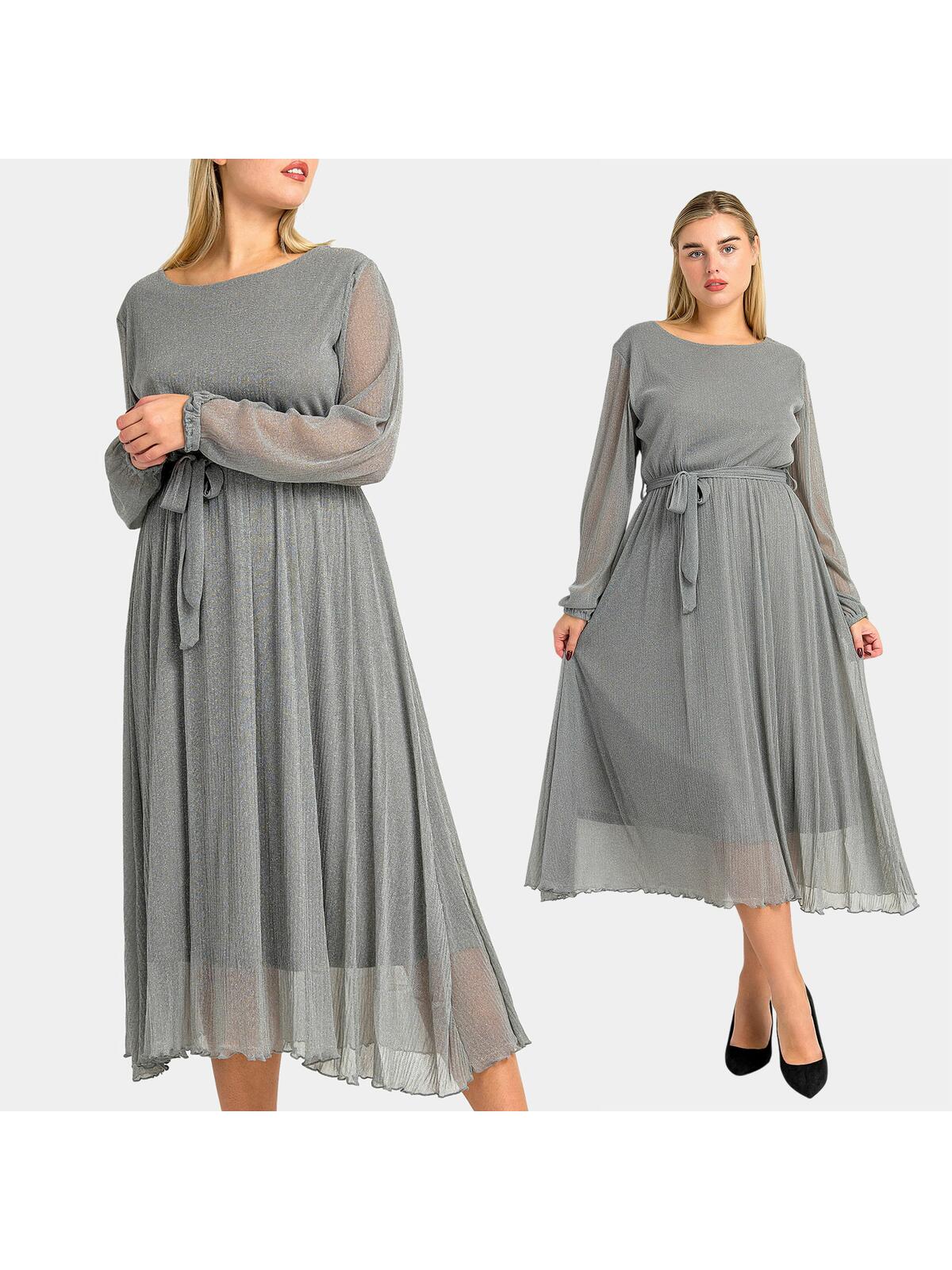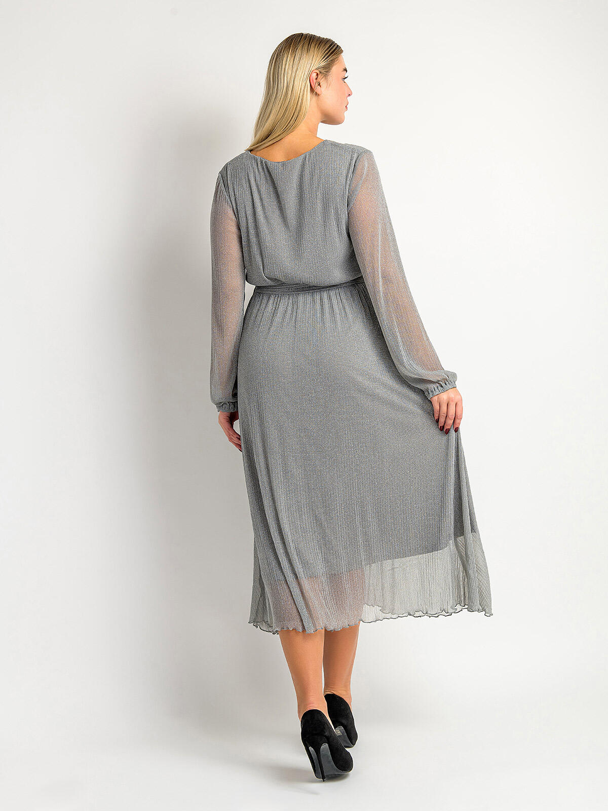 Rozświetl swoją garderobę tą przepiękną sukienką midi w kolorze szarym, która zachwyca subtelnym blaskiem błyszczącej nitki!