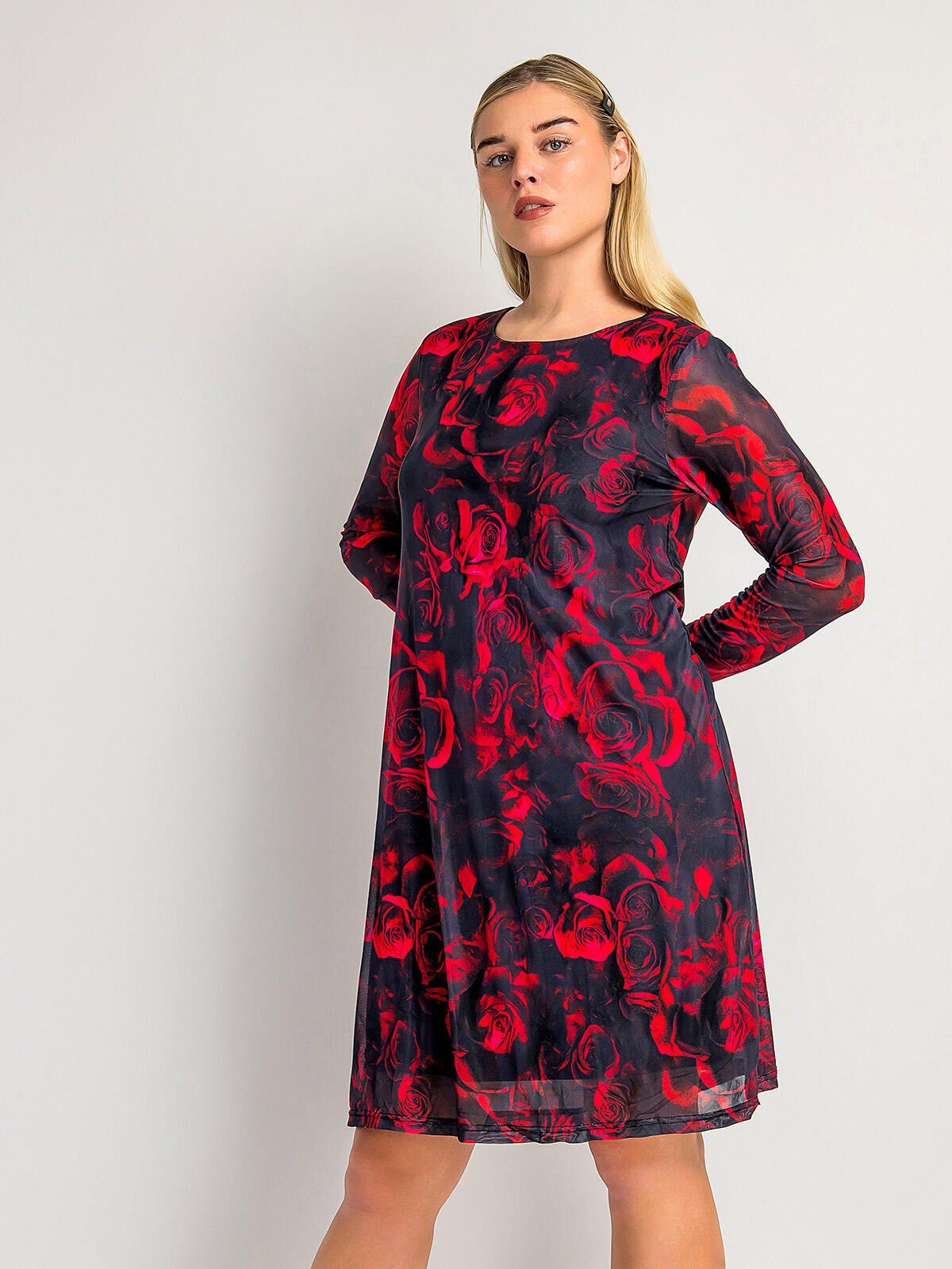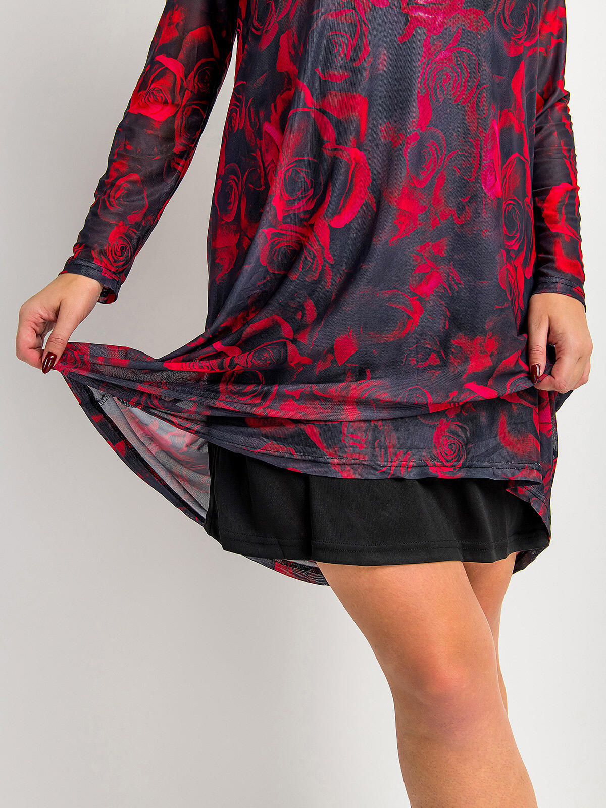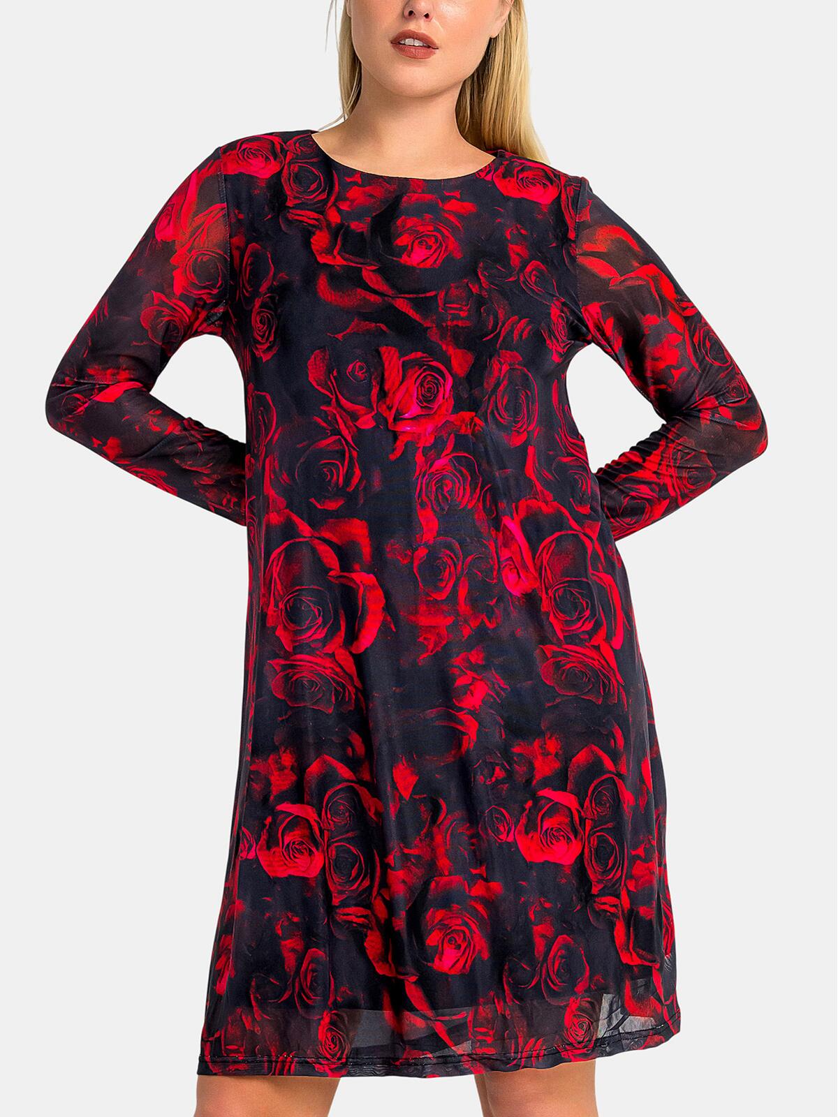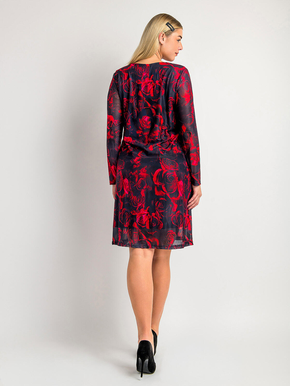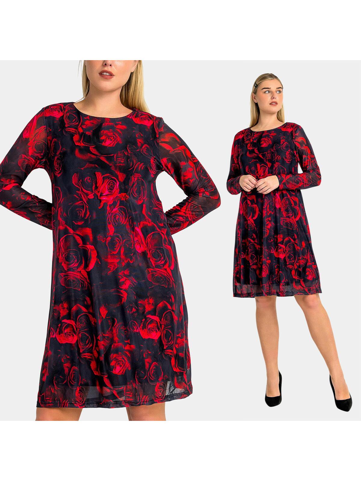 Prezentujemy naszą elegancką sukienkę, która od razu skradnie Twoje serce! Jej luźny krój zapewnia wygodę i swobodę ruchów, a okrągły dekolt oraz długie rękawy dodają klasy i szyku. 🌟 Wzór w czerwone róże stworzy wyjątkową aurę, którą każdy zauważy na wyjątkowych uroczystościach!