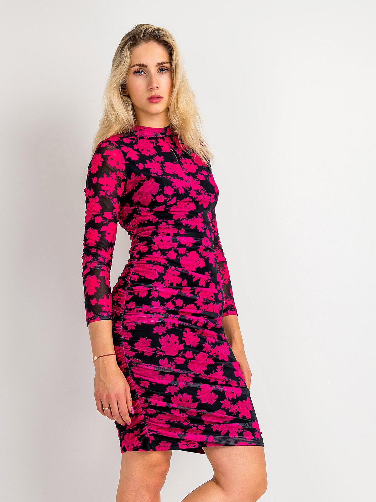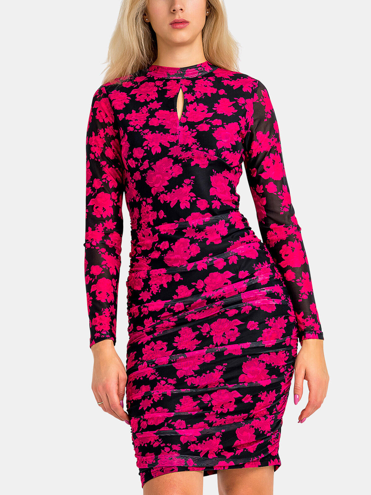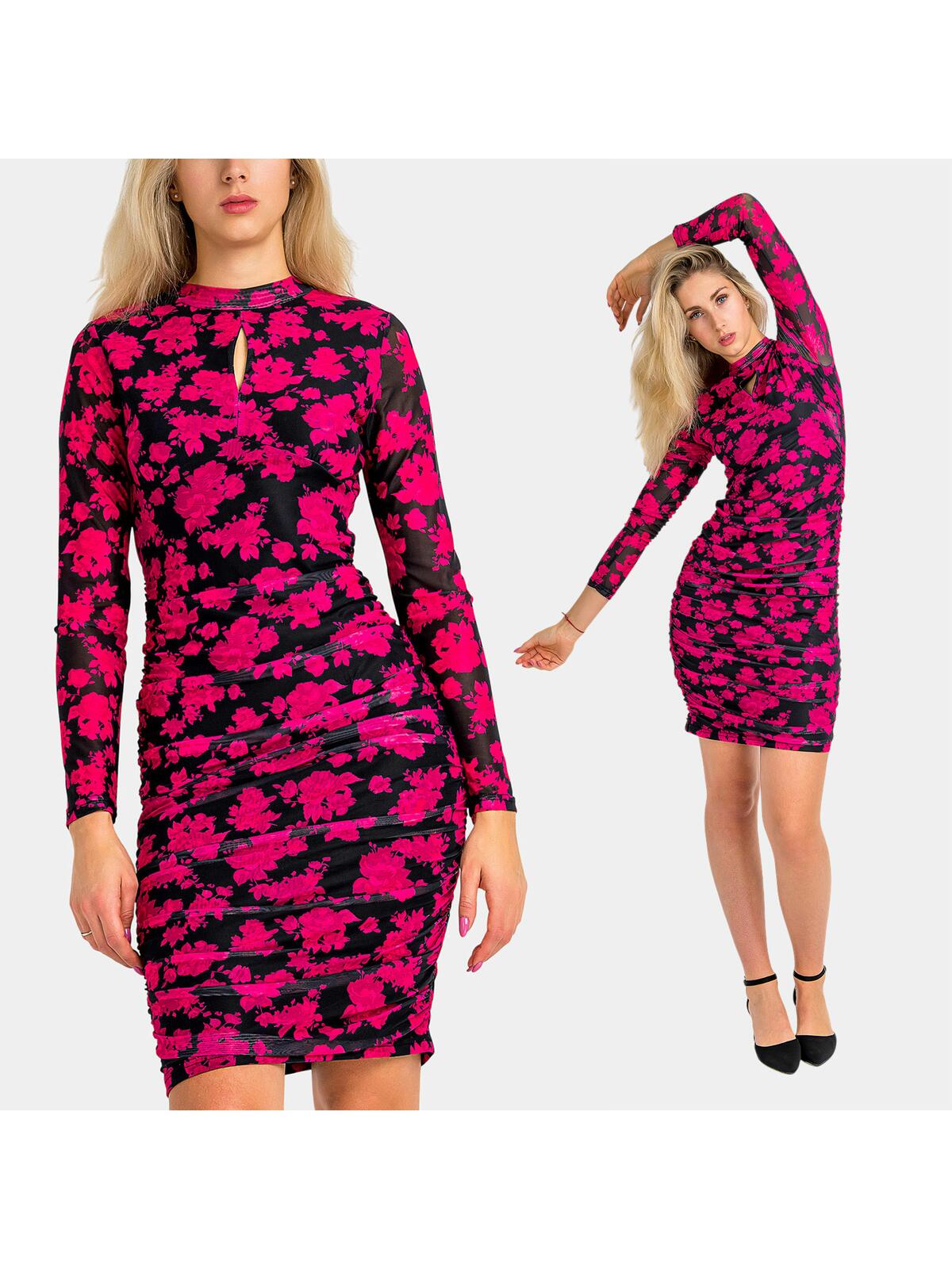 Wzorzysta, dopasowana sukienka w kolorze różowym to idealny wybór dla każdej modnej kobiety, która pragnie wyróżniać się z tłumu! Jej piękny kwiatowy wzór przyciąga wzrok i dodaje uroku każdej stylizacji. Marszczenia podkreślają figurę, a długość przed kolano zapewnia odpowiednią dozę kobiecości i zmysłowości. Długie rękawy i ozdobne wycięcie przy dekolcie sprawiają, że sukienka jest zarówno modna, jak i stylowa! 😊✨