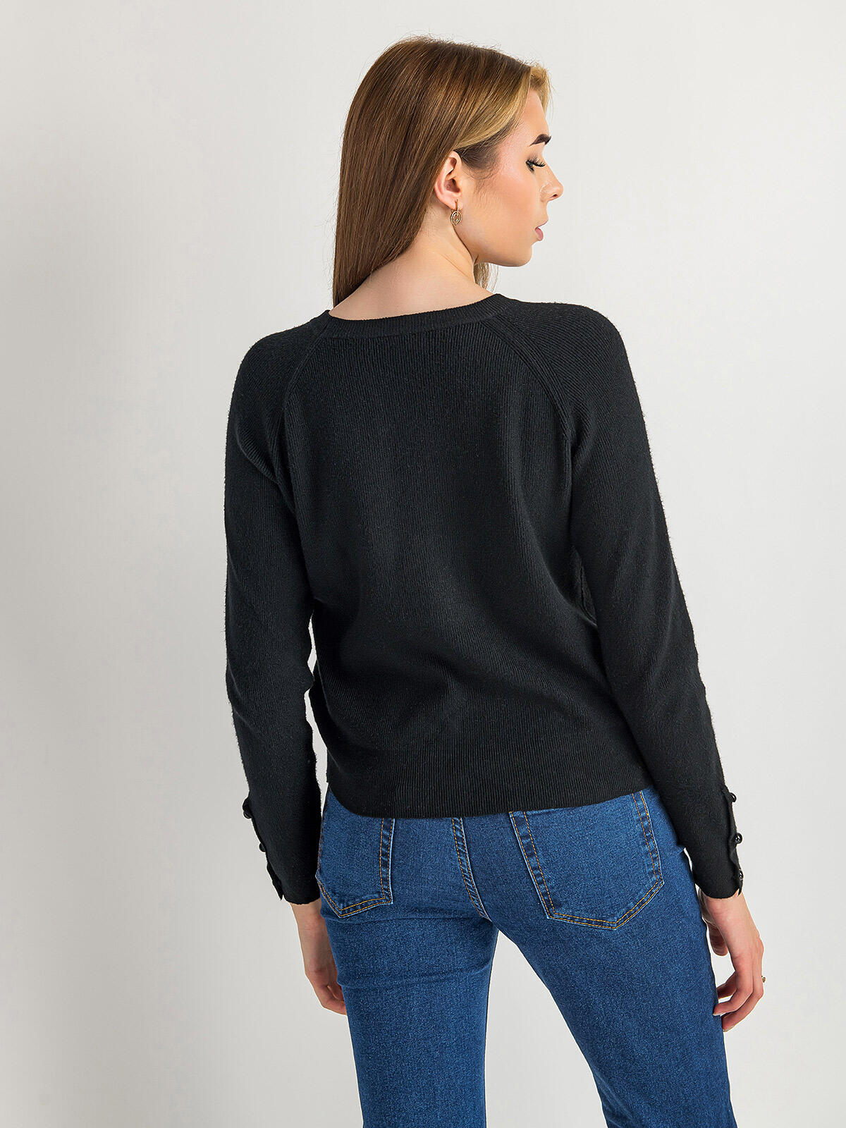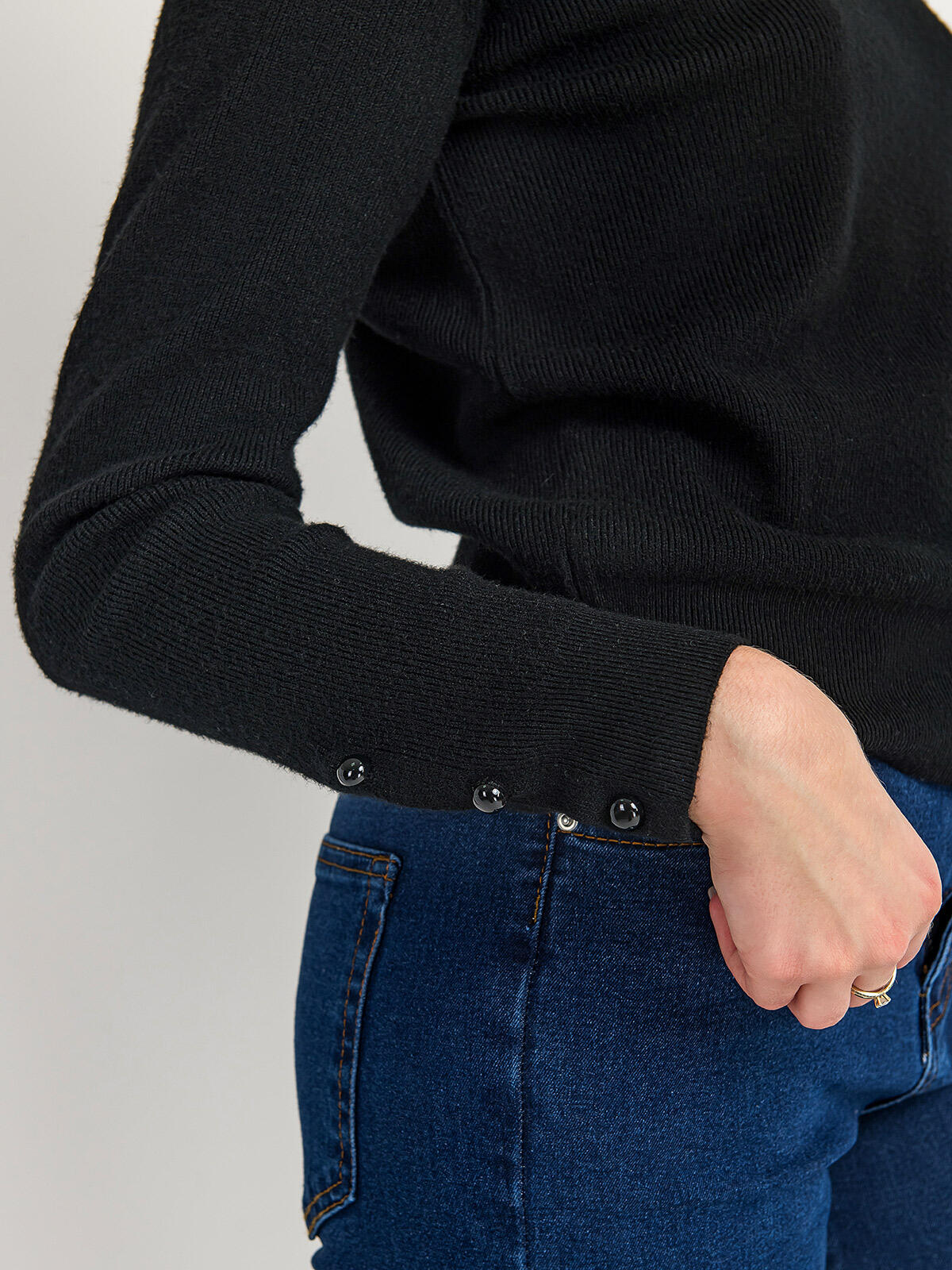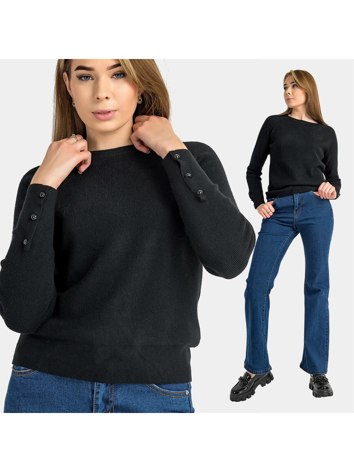 Odkryj nowy wymiar komfortu i elegancji z naszym czarnym swetrem z ozdobnymi rękawami! 😊 Wykonany z wysokiej jakości materiałów, ten modny sweter w prążek z okrągłym dekoltem pod szyją doda charakteru każdej stylizacji. Długie rękawy, ozdobione guzikami, przyciągają wzrok i sprawiają, że to idealny wybór na codzienne wyjścia oraz specjalne okazje. Twój nowy ulubiony element garderoby czeka! 🌟