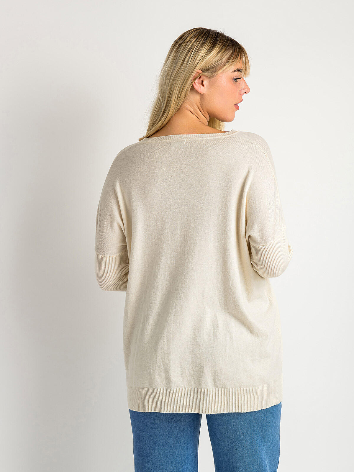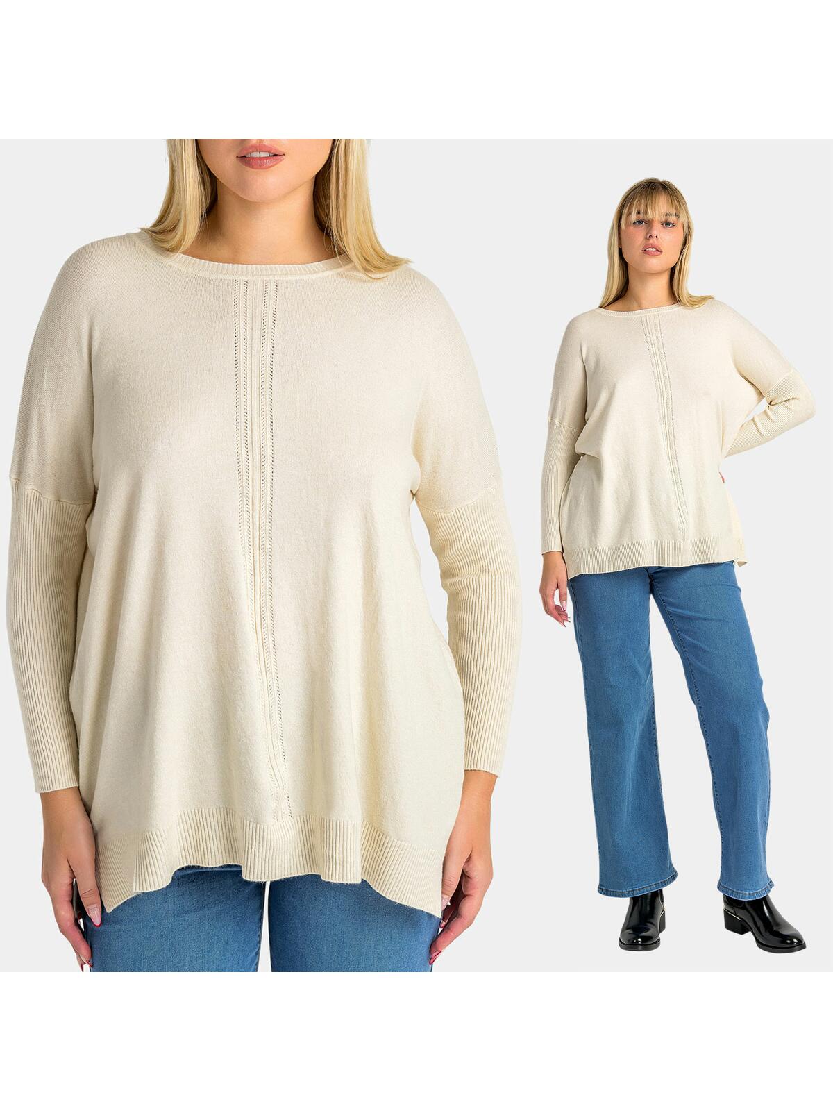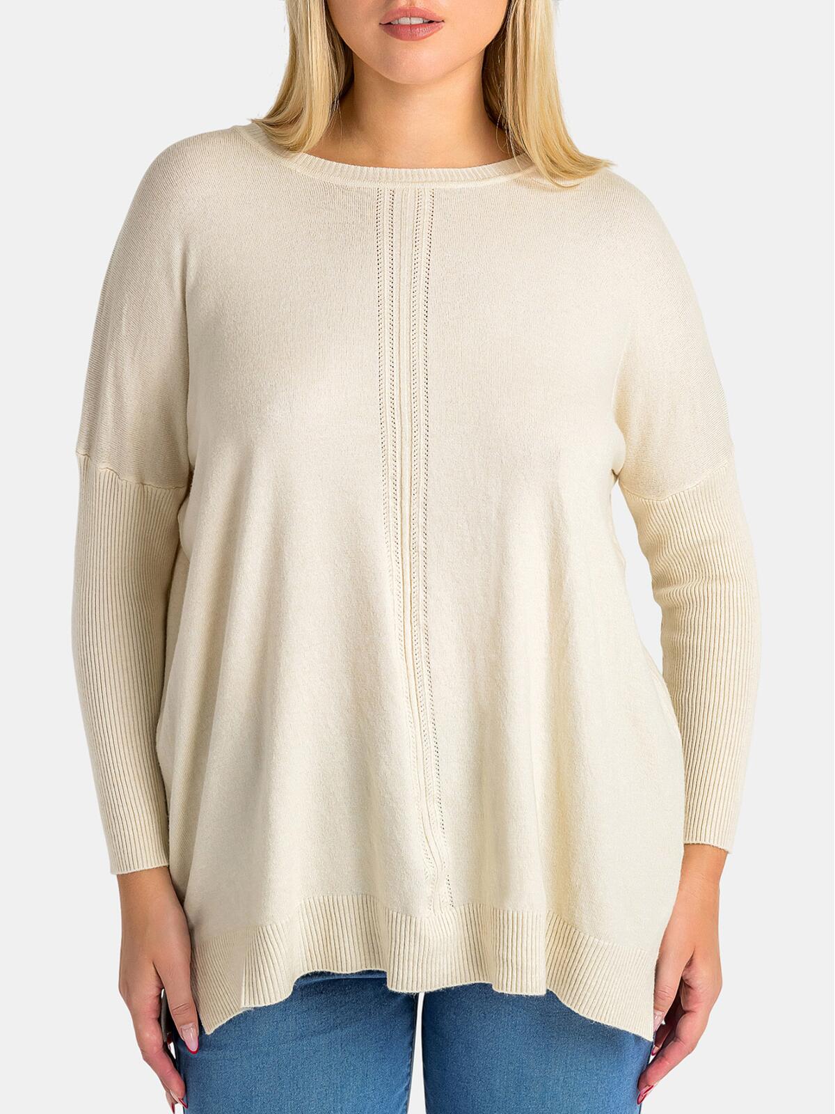 Przygotuj się na jesienne chłody z naszym kremowym swetrem z ozdobnym akcentem na przodzie! 🌼 Wykonany z wysokiej jakości materiałów, z domieszką wiskozy, zapewnia miękkość i wygodę, której potrzebujesz w każdej stylizacji. Luźny, lekko oversize’owy fason sprawia, że gwarantuje Ci swobodę ruchów. ✨ Długie, dopasowane, prążkowane rękawy, obniżona linia ramion oraz dekoracyjny element biegnący przez środek swetra nadają mu klasy i stylu, który zachwyca! 🎀