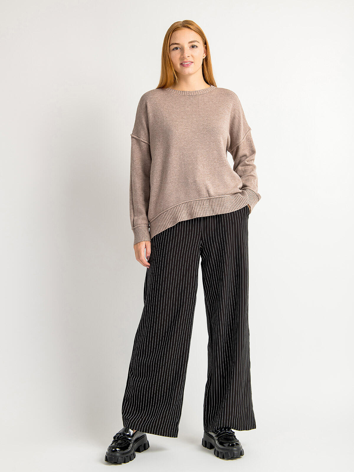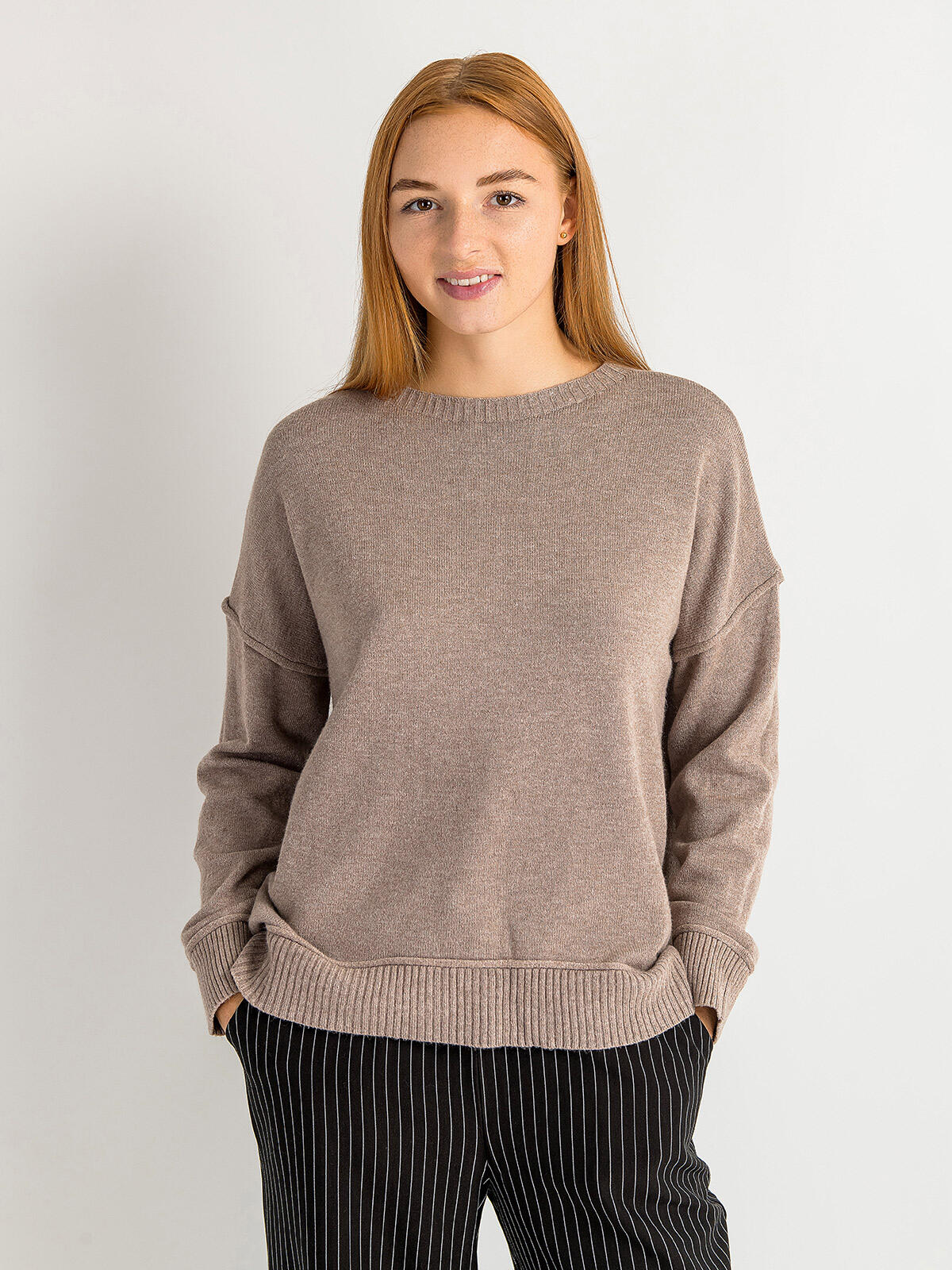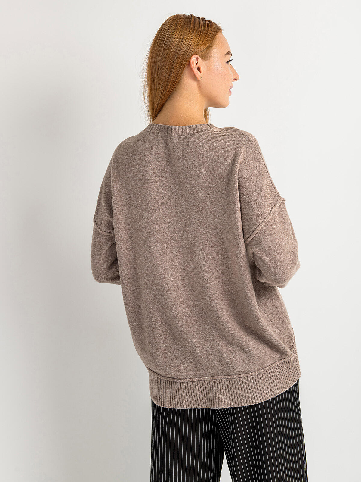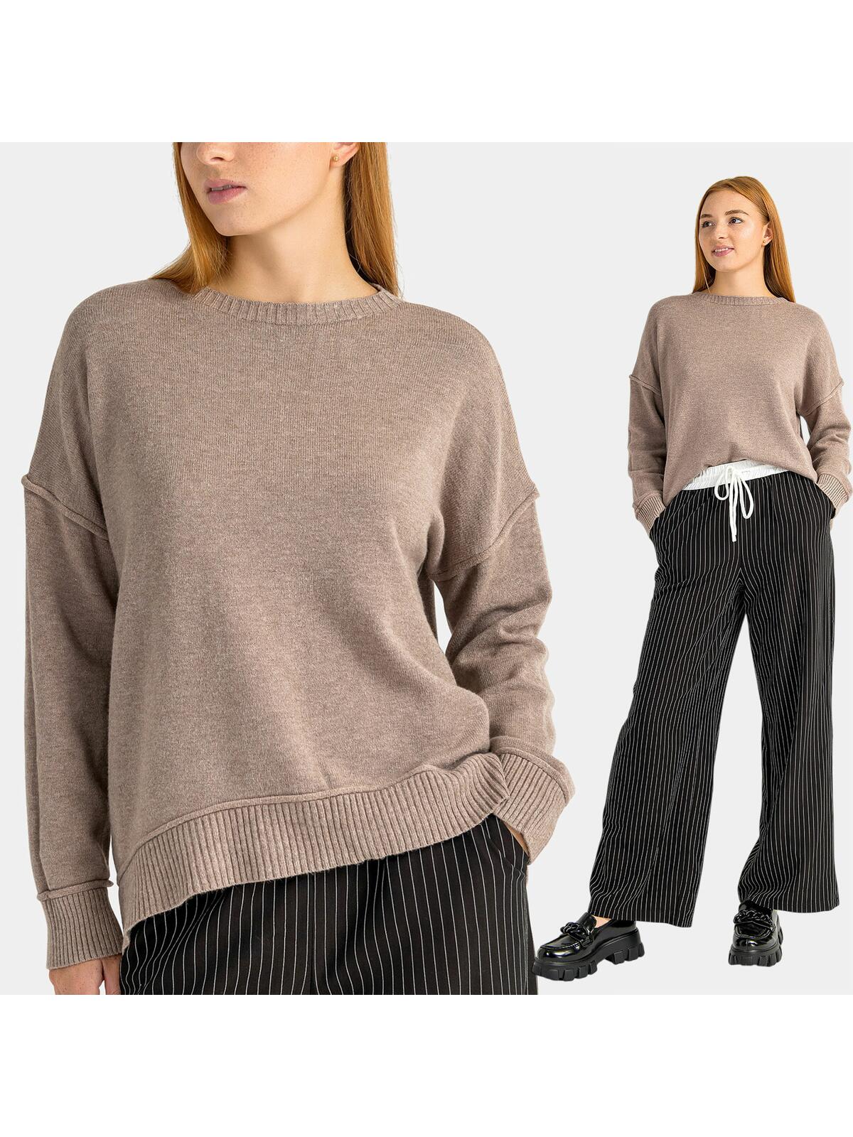 Wprowadź do swojej garderoby odrobinę luksusu z naszym gładkim sweterkiem w kolorze jasnego brązu , który łączy elegancję z codziennym komfortem! 🌟 Wykonany z dzianiny z dodatkiem miękkiej wiskozy, emanuje przytulnością i ciepłem. Okrągły dekolt i obniżona linia ramion dodają mu nonszalancji, a swobodny krój sprawia, że doskonale leży na każdej sylwetce. Dłuższy tył jest nie tylko modny, ale również praktyczny, zapewniając dodatkowe okrycie. Prążkowane wykończenie na dole oraz przy rękawach to gustowny akcent, który zachwyci każdą fashionistkę. 🤩