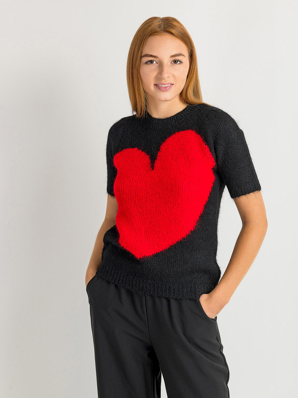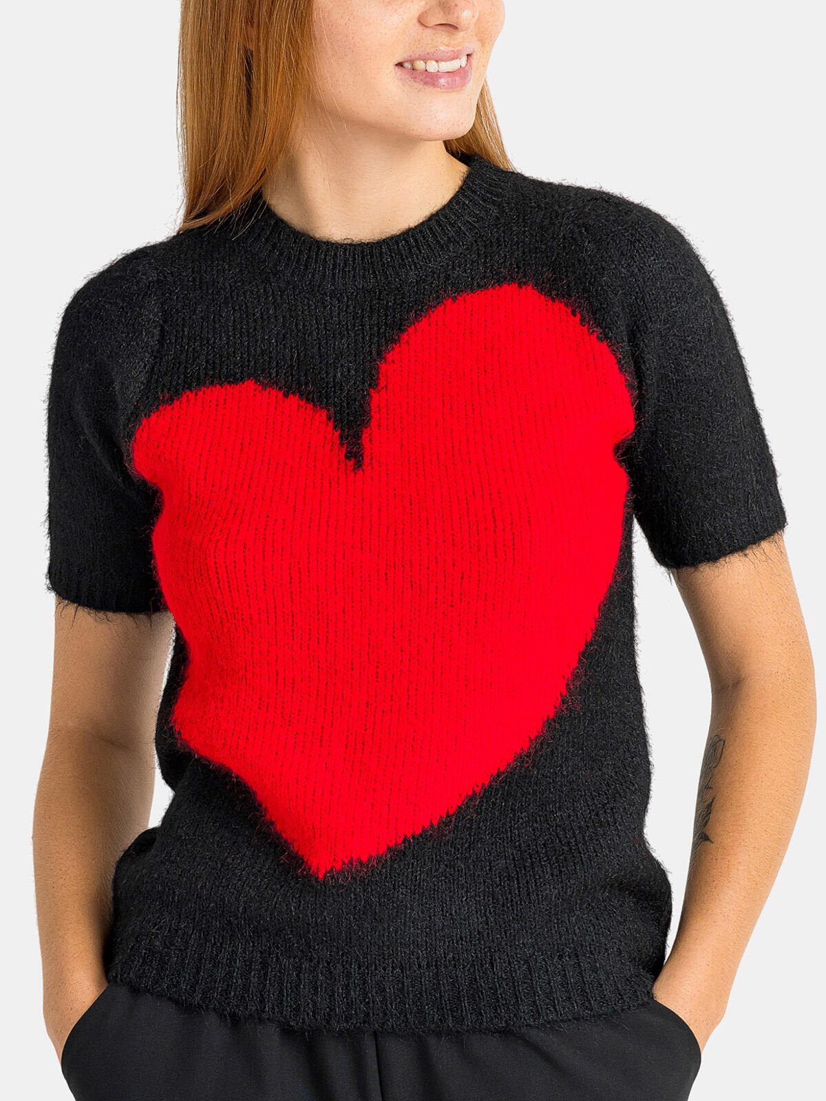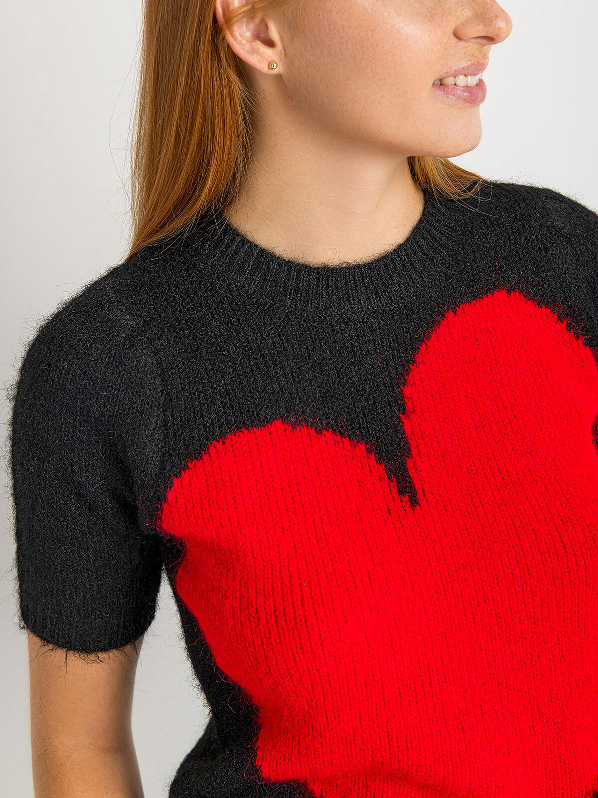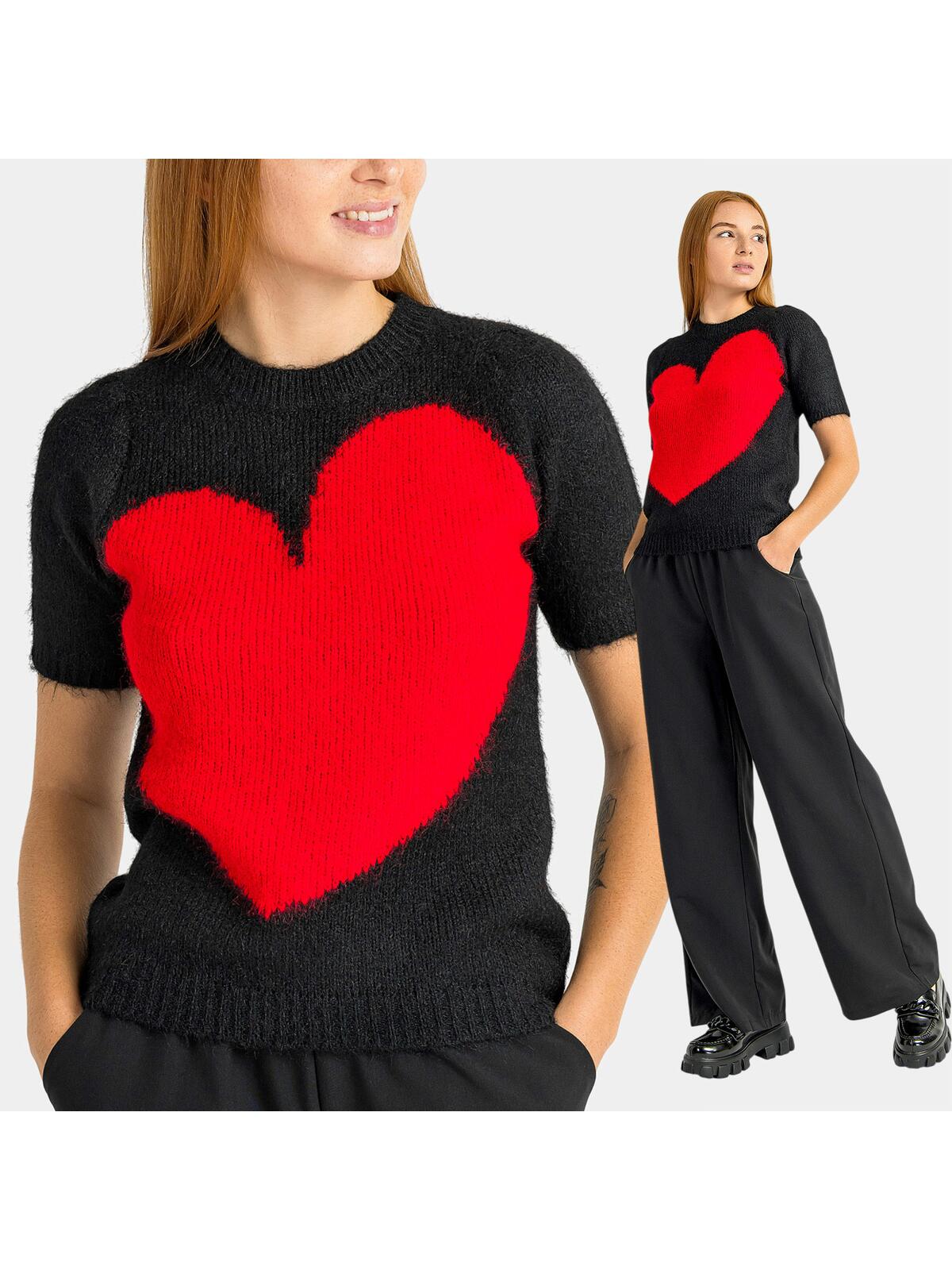 Odkryj nasz wyjątkowy sweter damski, który łączy w sobie komfort, styl i odrobinę magii! Ten dzianinowy skarb wykonany z domieszką wełny z pewnością stanie się Twoim ulubionym elementem garderoby. Jego okrągły dekolt i krótkie rękawy dodają lekkości, a włochata faktura sprawia, że jest niezwykle przyjemny w dotyku. Największą atrakcją jest wzór serca na przodzie, który wyrazi Twoje uczucia w każdej sytuacji! ❤️