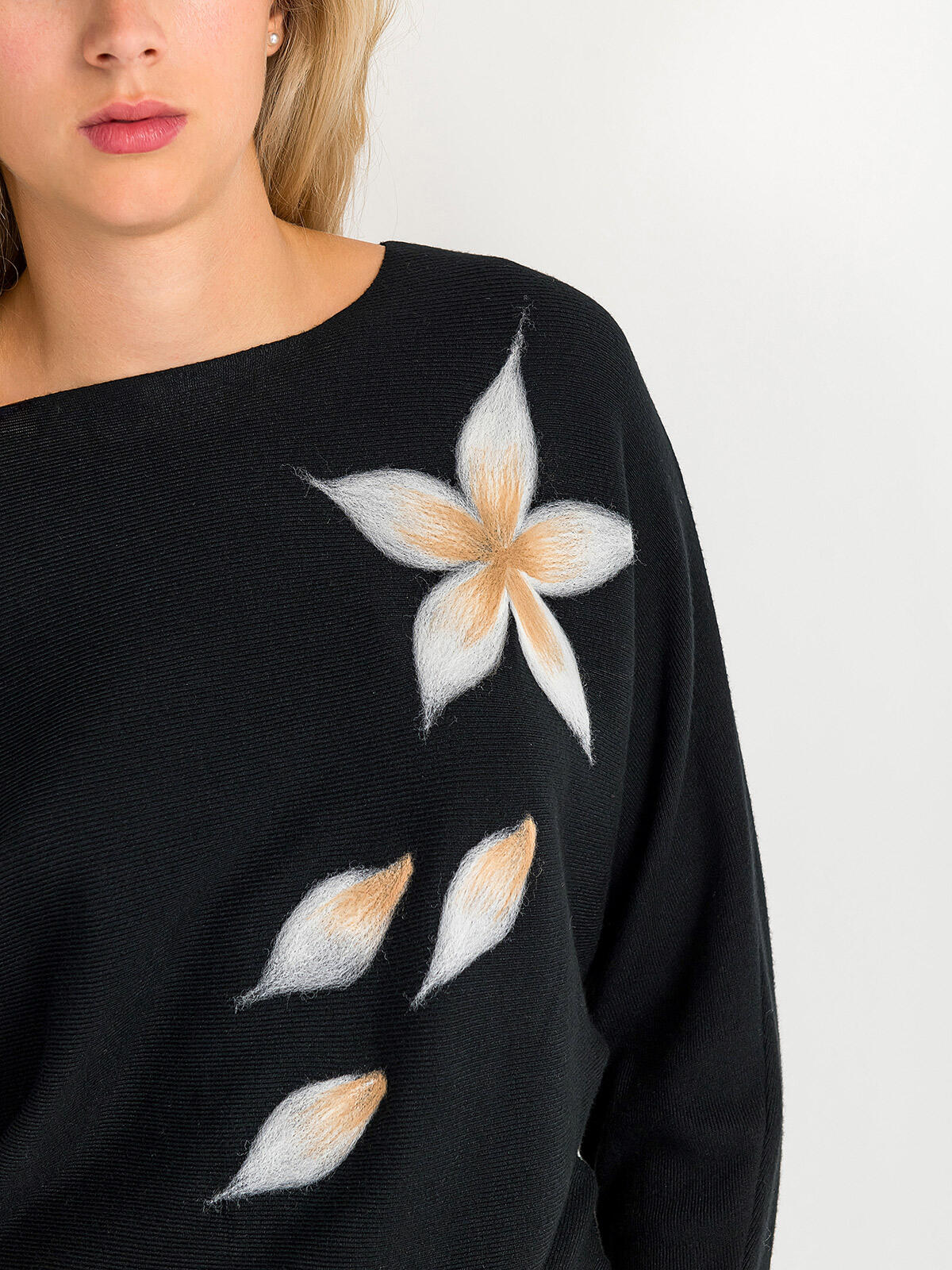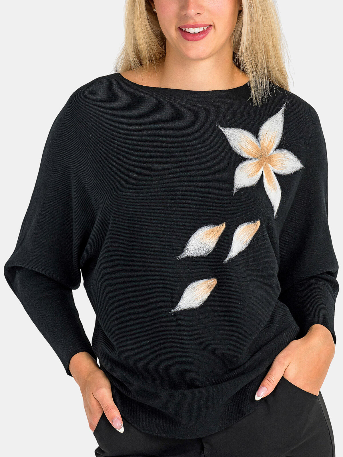 Odkryj nasz niepowtarzalny sweter z wiskozą w eleganckim, głębokim czarnym kolorze, który doda szyku każdej stylizacji! Z modną ozdobą w postaci kwiatu, ten sweter jest idealnym wyborem na każdą okazję – od biura po spotkanie z przyjaciółmi. 😊