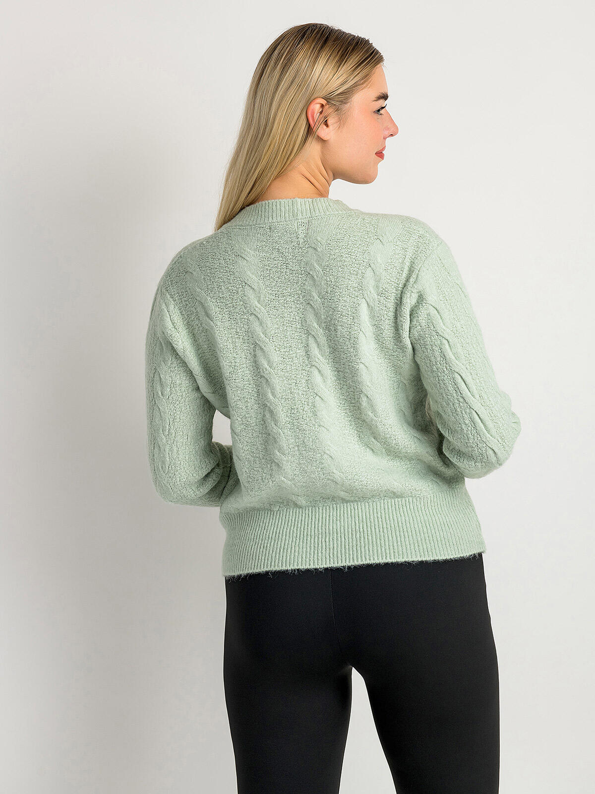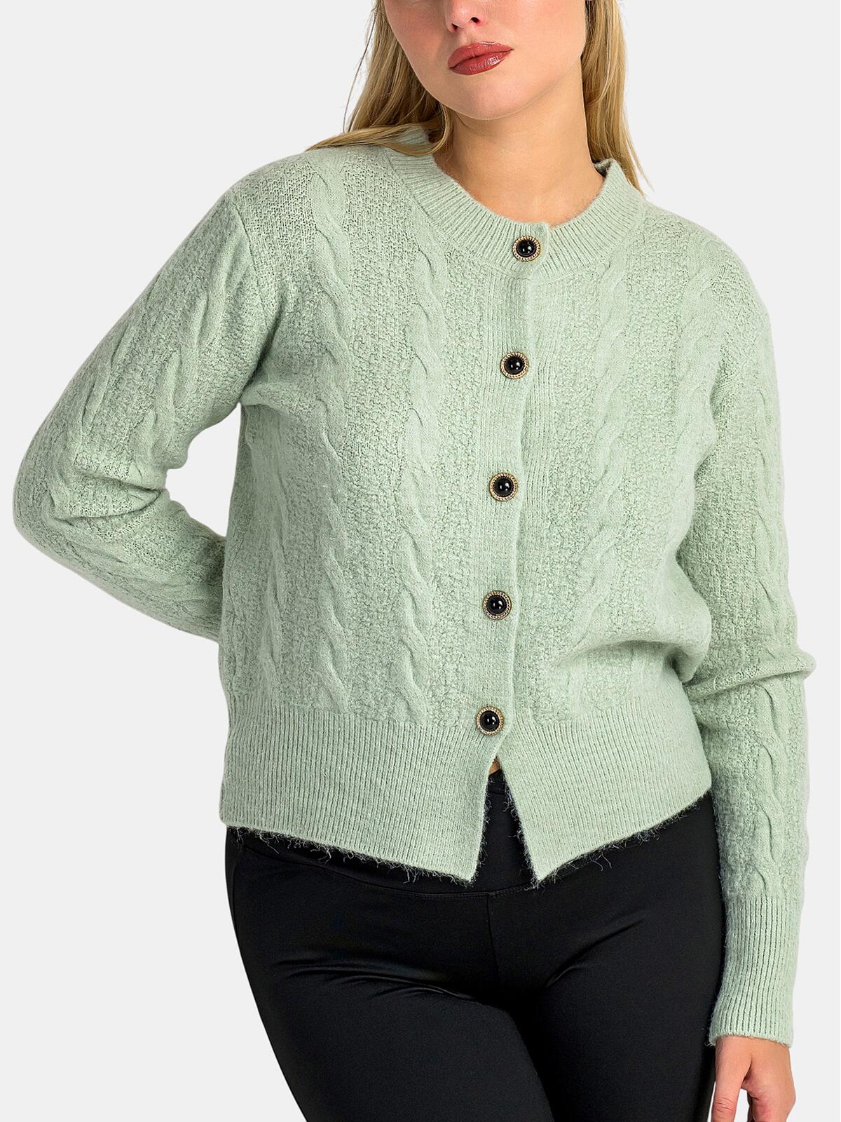 Postaw na styl i wygodę w jednym! Sweter w delikatnym miętowym odcieniu w połączeniu z warkoczowym wzorem tworzy niezwykle kobiecy i stylowy duet. Miękka tkanina z domieszką wiskozy otuli Cię ciepłem, a ozdobne guziki dodają mu wyjątkowej klasy. Idealny na chłodne dni — wprowadzi do Twojej garderoby nutę świeżości i elegancji. 💚 Niezależnie od tego, czy wybierasz się na spacer, czy spotkanie z przyjaciółmi, ten sweter będzie idealnym uzupełnieniem każdej chwili! 🍁