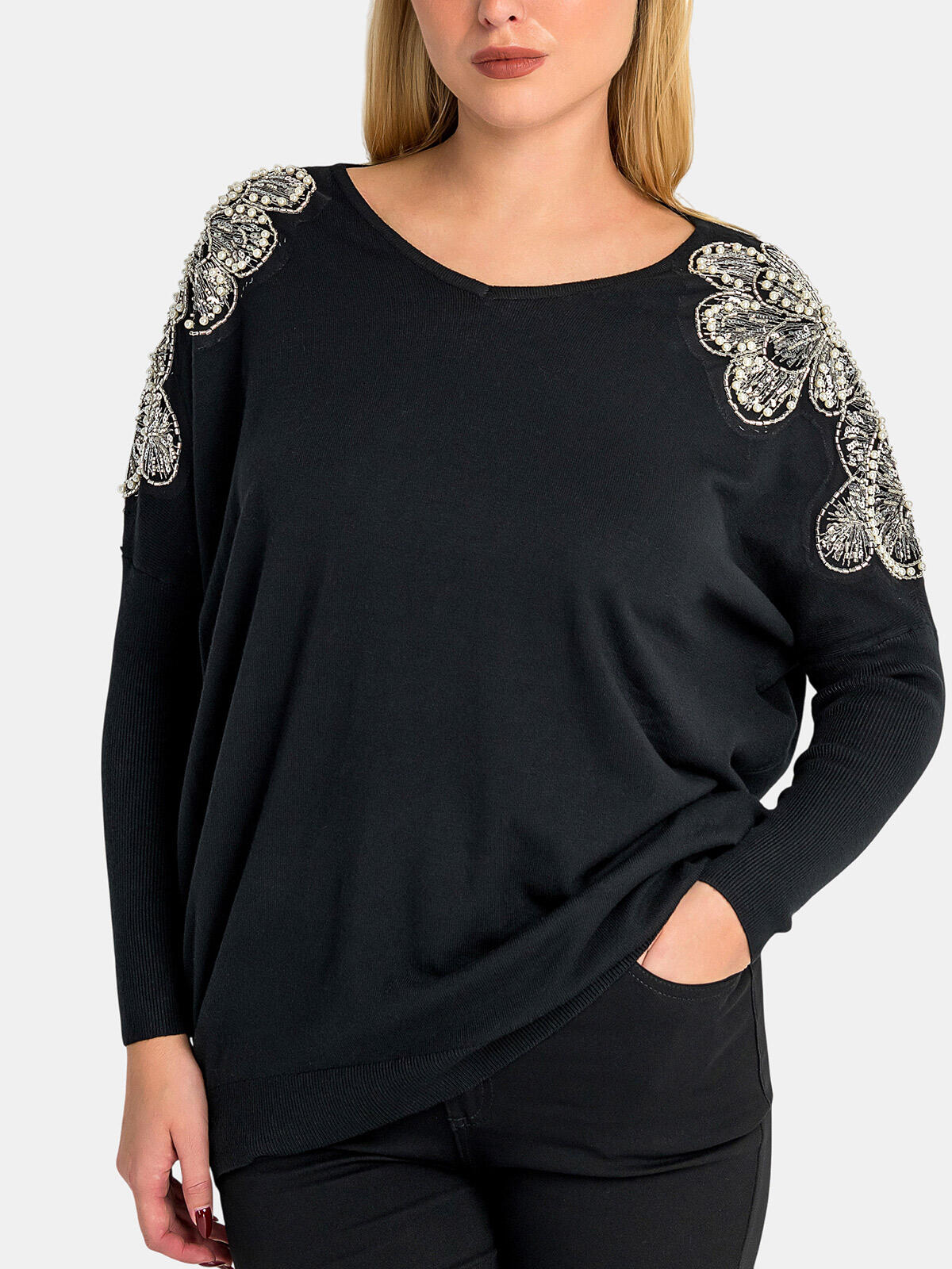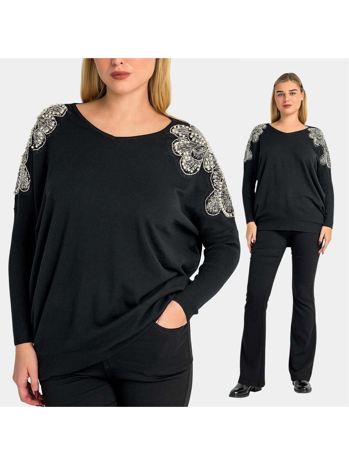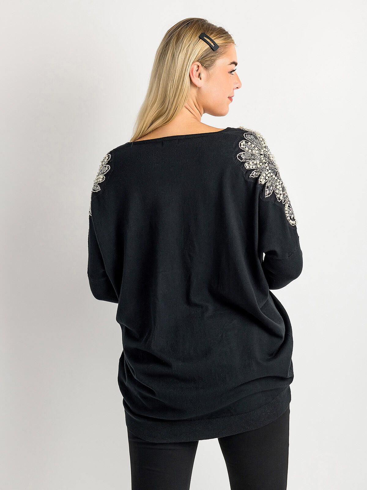 Przygotuj się na chłodniejsze dni z naszym eleganckim swetrem w czarnym kolorze, który zachwyca ozdobnymi akcentami na ramionach! 🌟 Wykonany z wysokiej jakości materiałów, z domieszką wiskozy, sweter ten nie tylko zapewnia komfort ciepła, ale też sprawia, że Twoja stylizacja nabierze wyjątkowego charakteru. Długie rękawy, zwężane od łokcia, dodają klasy i harmonii, podczas gdy dłuższy tył podkreśla nowoczesny design. To idealny wybór na jesienne spacery, kawę z przyjaciółmi czy wieczorne wyjścia! Sweter został ozdobiony pięknymi koralikowymi aplikacjami na ramionach, które dodają mu elegancji i subtelnego blasku. 😊