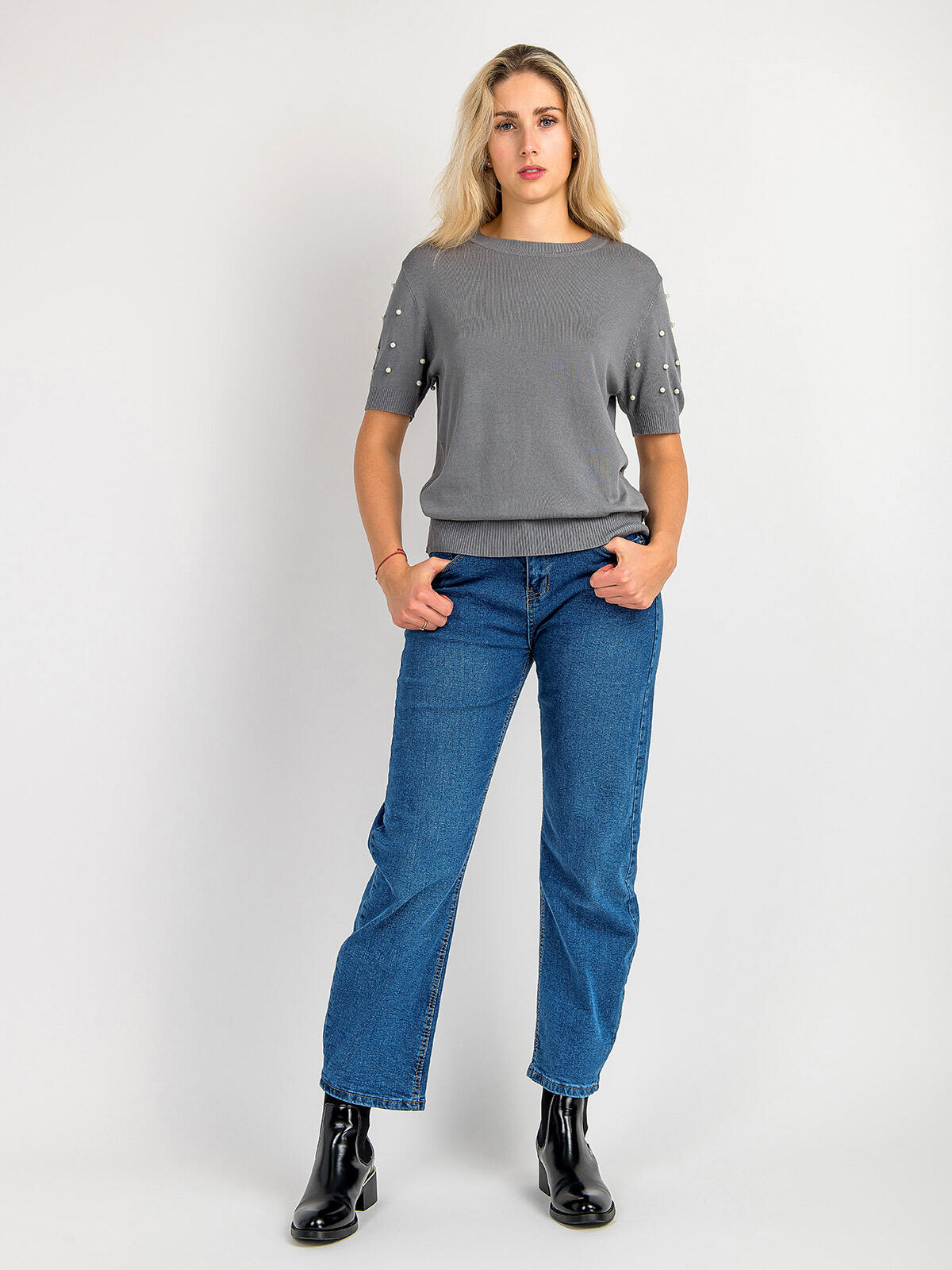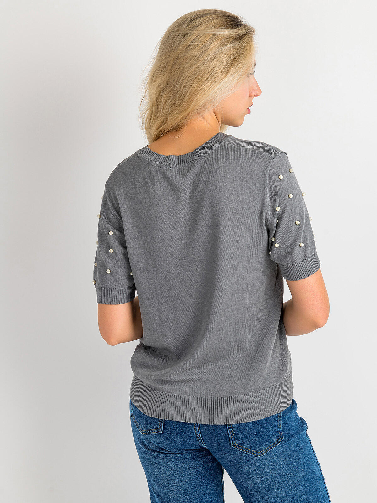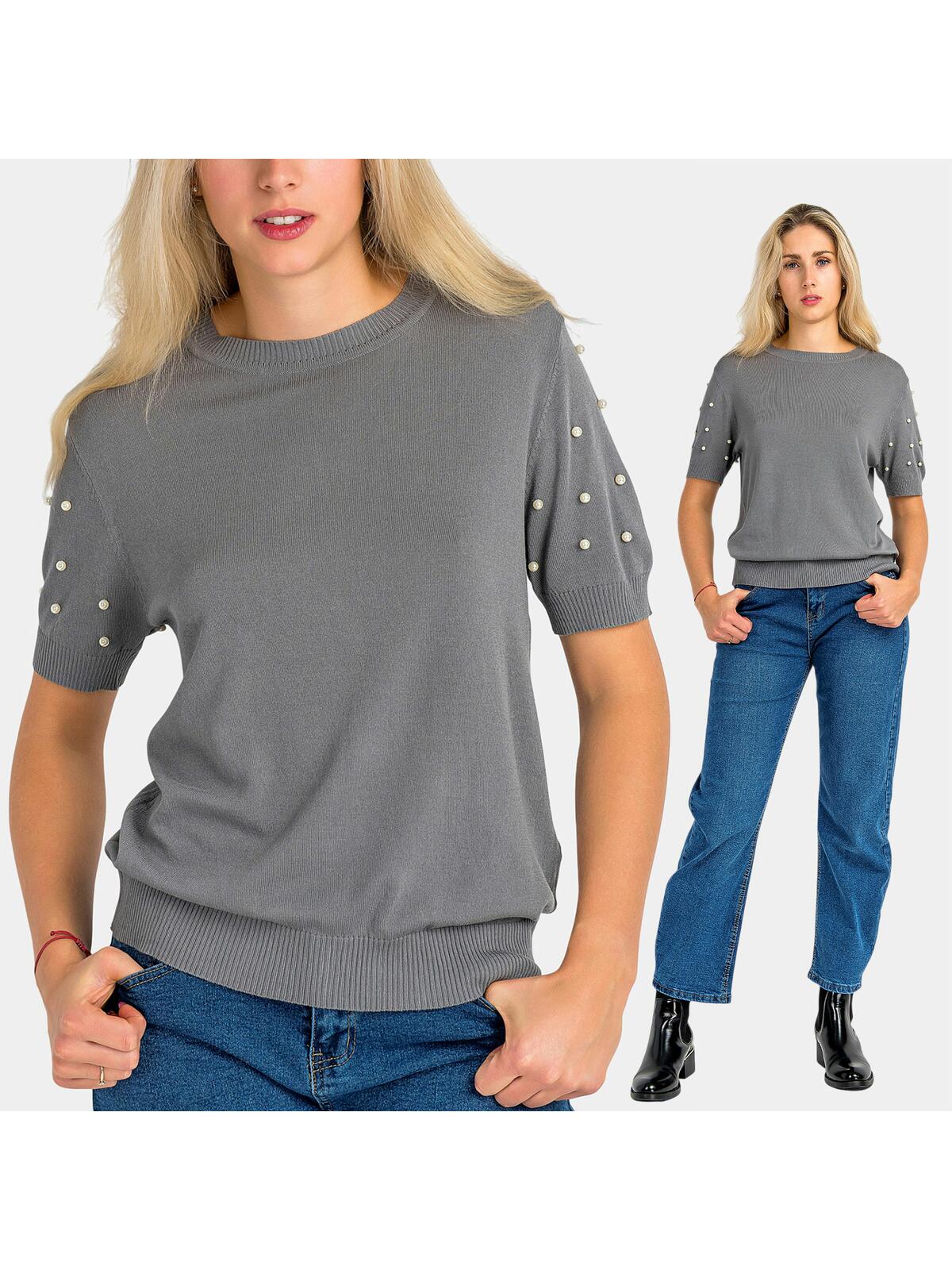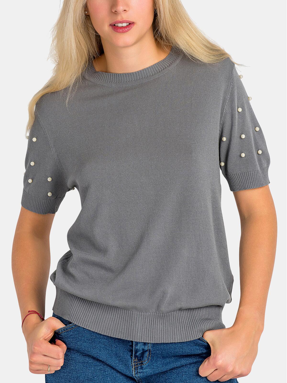 Odkryj niezwykły sweter, który stał się synonimem stylu i komfortu! Wykonany z miękkiej i delikatnej wiskozy, ten sweter w pięknym szarym kolorze idealnie komponuje się z różnorodnymi stylizacjami. Krótkie rękawy ozdobione delikatnymi perełkami dodają mu unikalnego uroku, zaś ściągacze na rękawach i dole sprawiają, że jest niezwykle praktyczny i wygodny. Liczne możliwości stylizacji sprawiają, że możesz nosić go zarówno na codzienne wyjścia, jak i eleganckie spotkania. 👗🌼