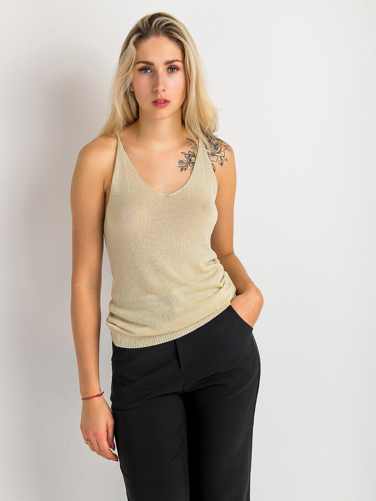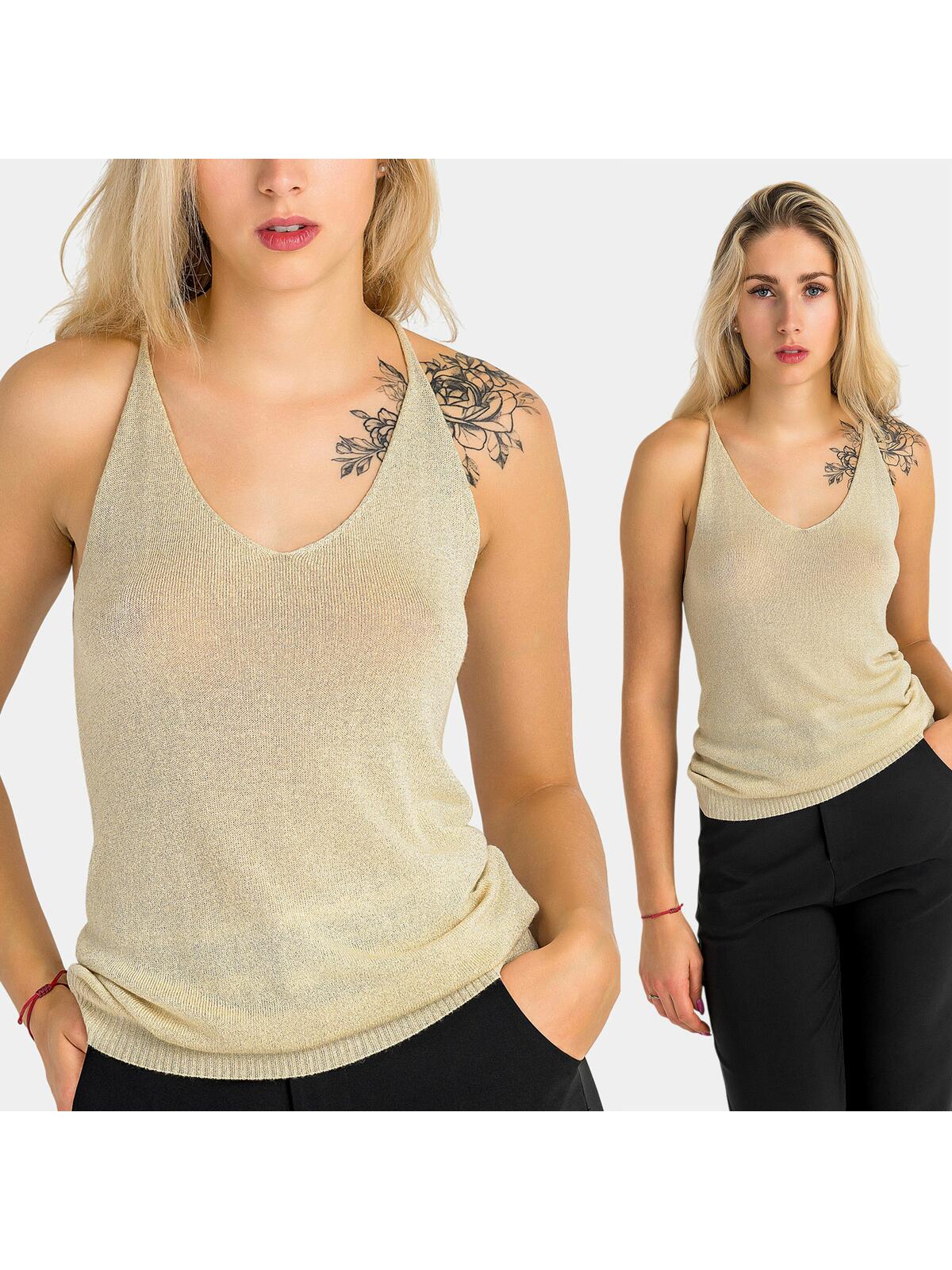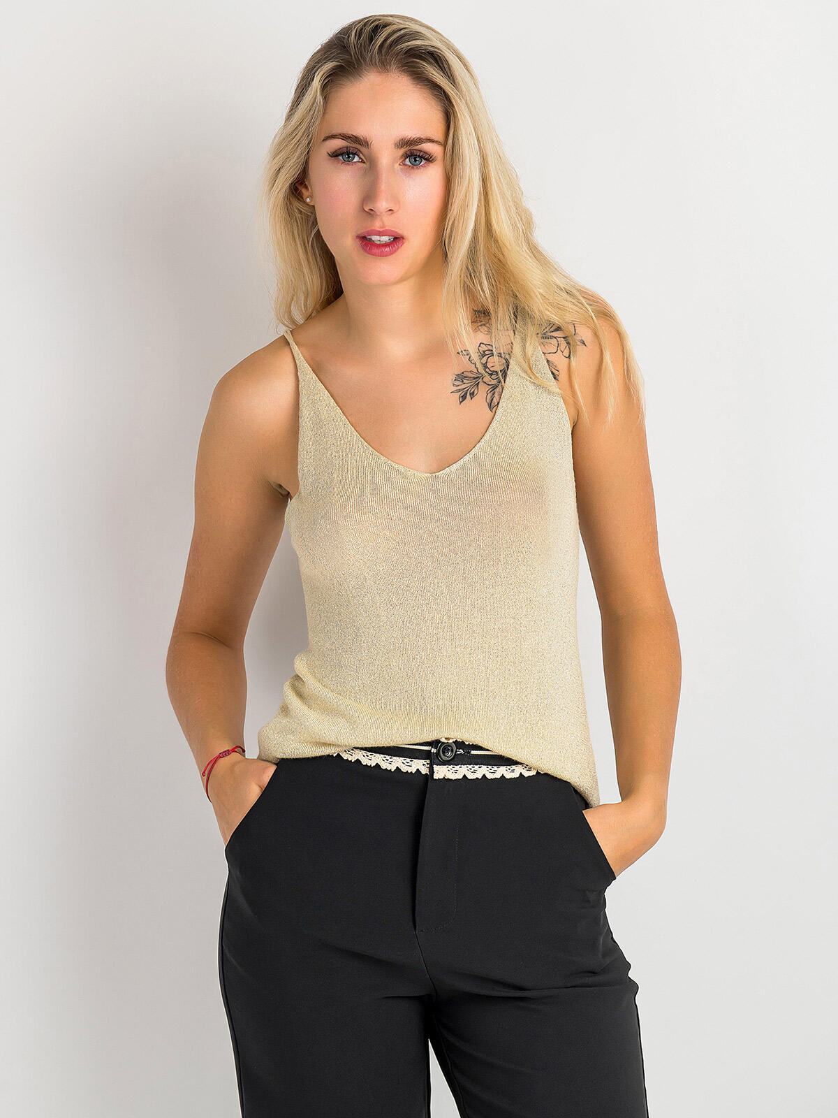 Przygotuj się na letnie wieczory w tym oszałamiającym błyszczącym topie z dużą zawartością bawełny! 🌟 Jego beżowy kolor sprawi, że wyróżnisz się w każdym towarzystwie. Cienkie ramiączka podkreślają ramiona, a głęboki dekolt nadaje mu zmysłowości. Gdy tylko założysz ten wyjątkowy model, poczujesz się pewnie i elegancko. Ozdobna błyszcząca nitka dodaje mu odrobiny blasku, a mocno wycięte plecy eksponują ciało w subtelny sposób. Bardzo wygodne zakończenie w postaci prążkowanego ściągacza idealnie dopasowuje się do sylwetki, co sprawia, że jest to must-have na każdy sezon! 🌞🌼